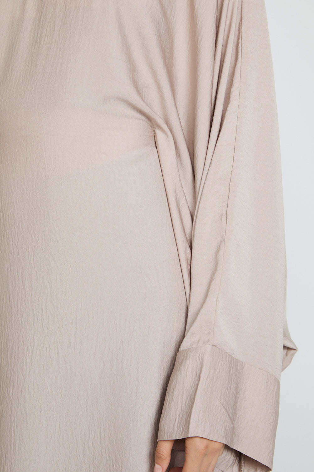 Finished with simple cuffs and a clean, minimal design, its warm mink mist tone adds a whisper of sophisticated softness to any wardrobe — understated, elegant, and effortlessly poised.