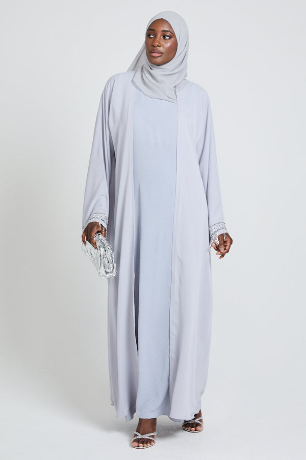 Four Piece Embellished Tassel Cuff Open Abaya Set - Lavender Grey