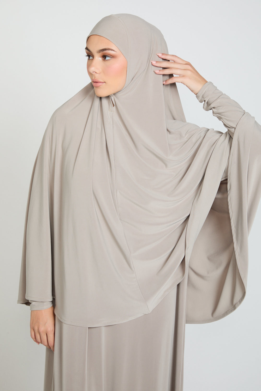 The Jersey Plain Closed Abaya with Khimar Set – Sand Dune is designed with simplicity, comfort, and versatility in mind. Made from soft, breathable jersey fabric, this two-piece set includes a relaxed closed abaya and a matching khimar, offering ease and elegance for both daily wear and for prayer.
