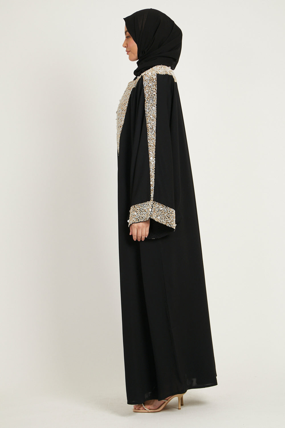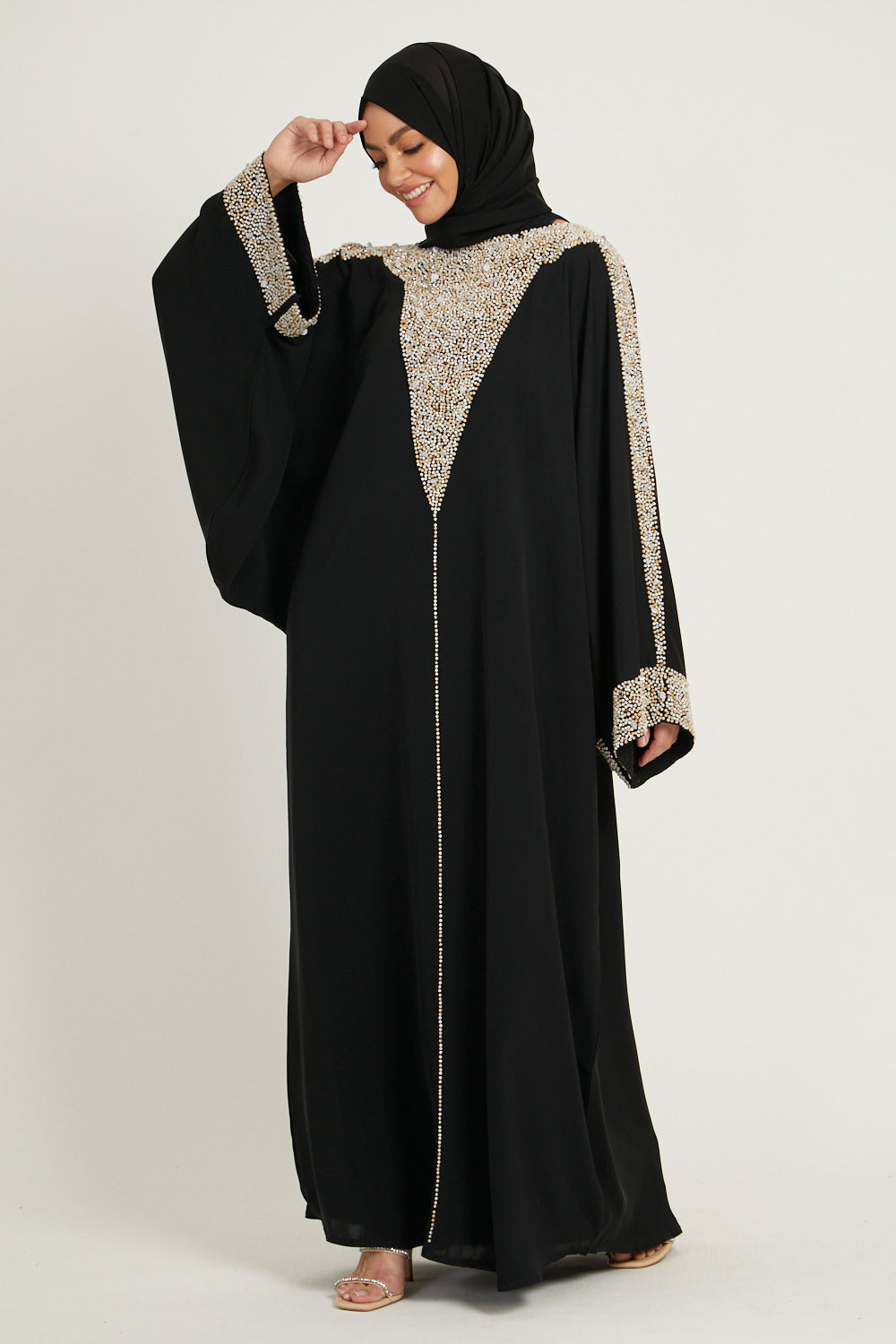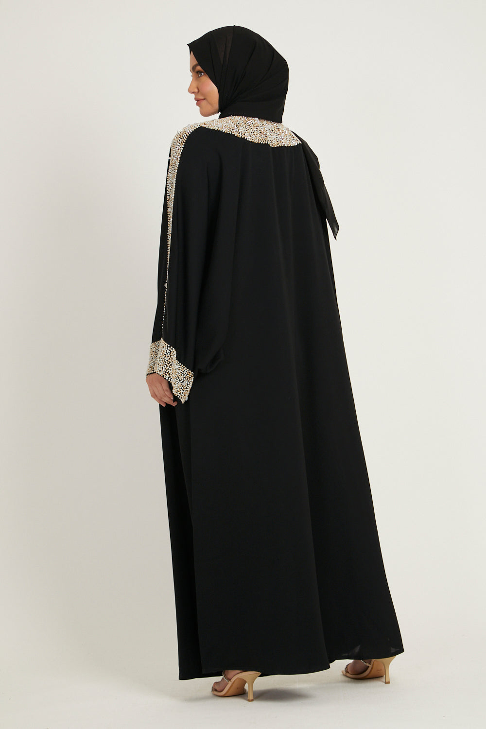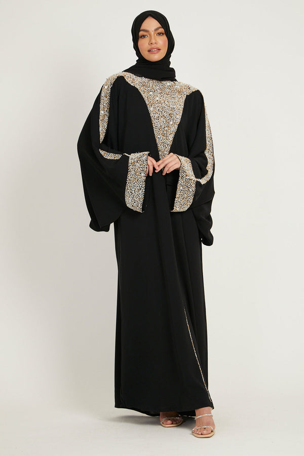 Luxury Moonlit Pearl Blossom Closed Abaya – Black