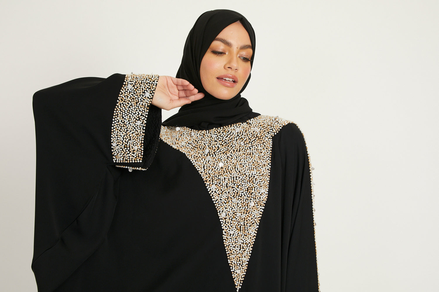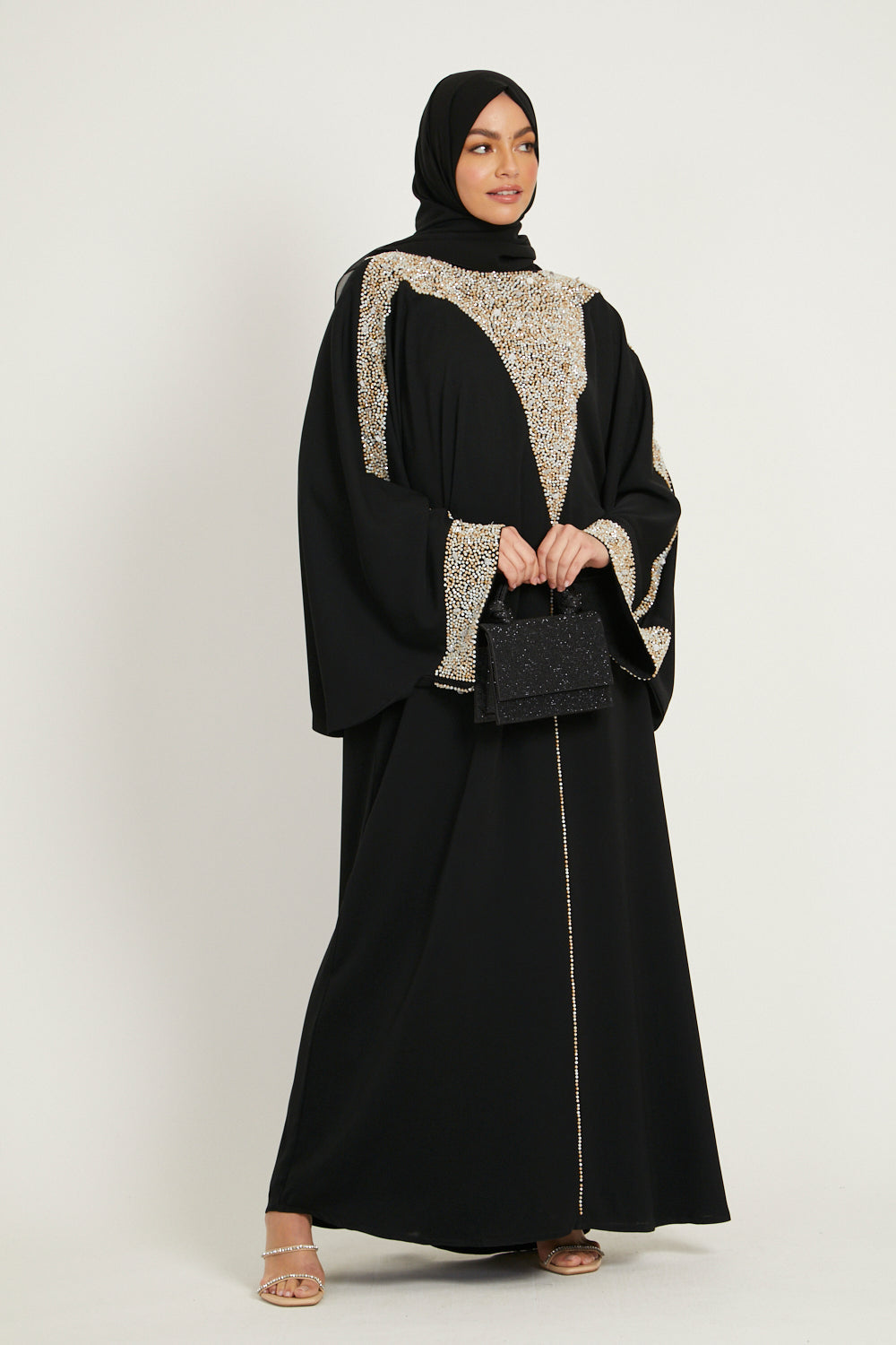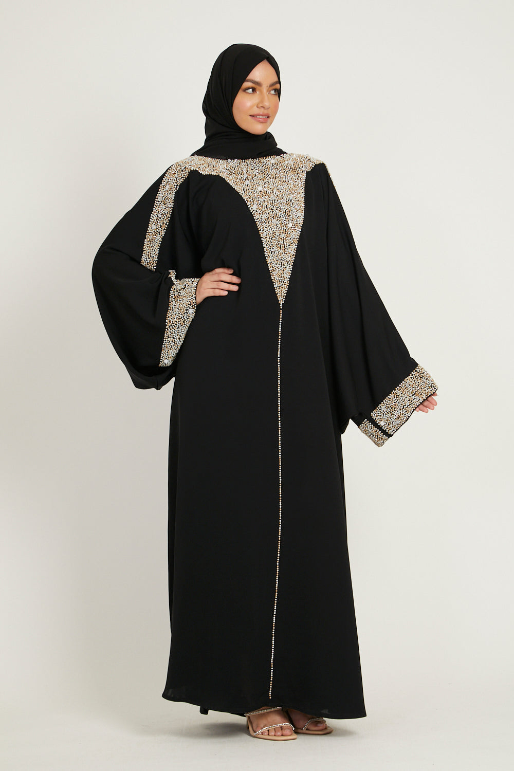 Luxury Moonlit Pearl Blossom Closed Abaya – Black