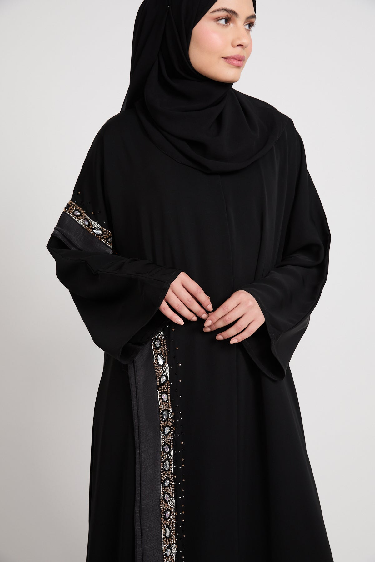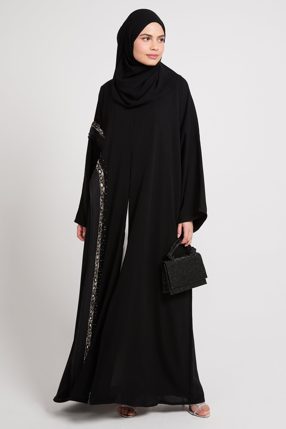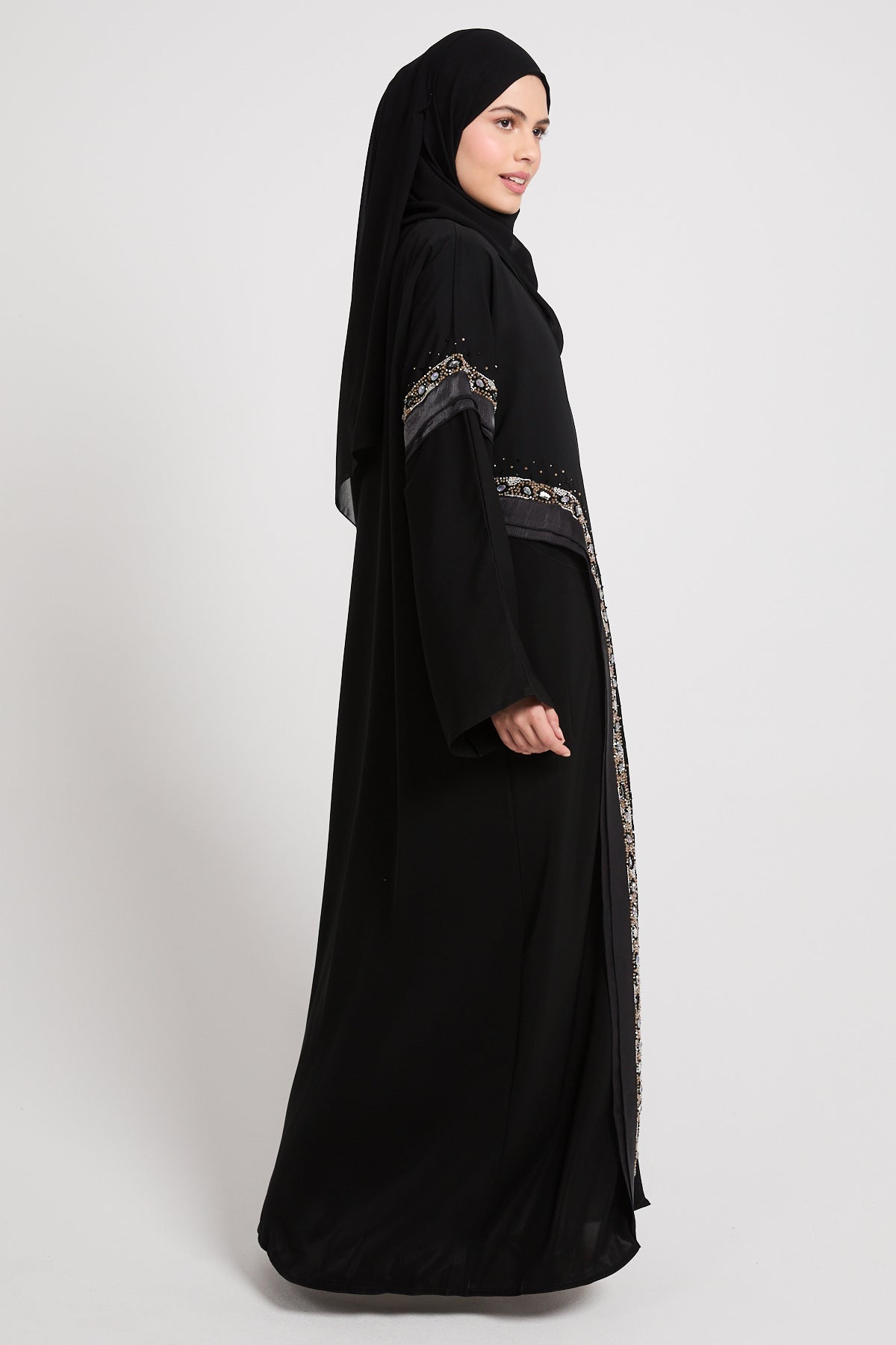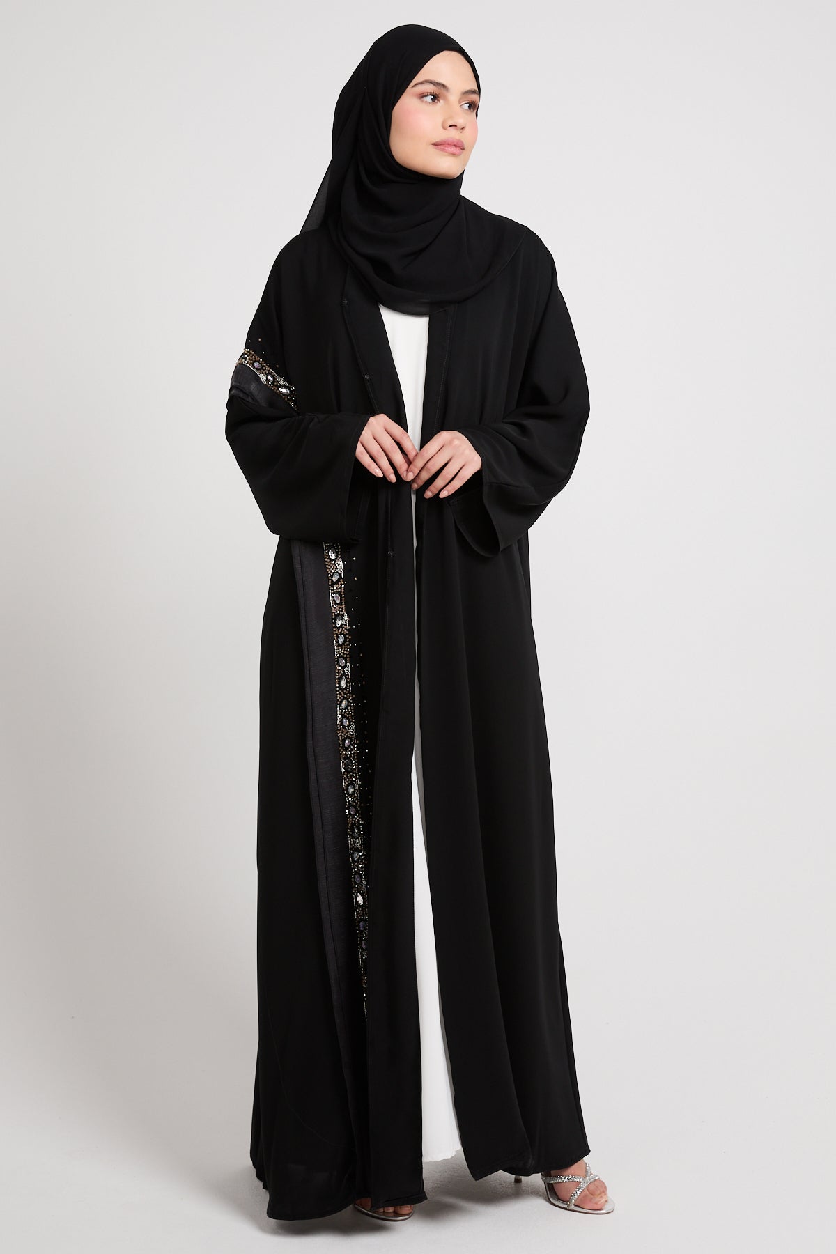 Premium Aurora Jewel Open Abaya with Organza Detail - Black