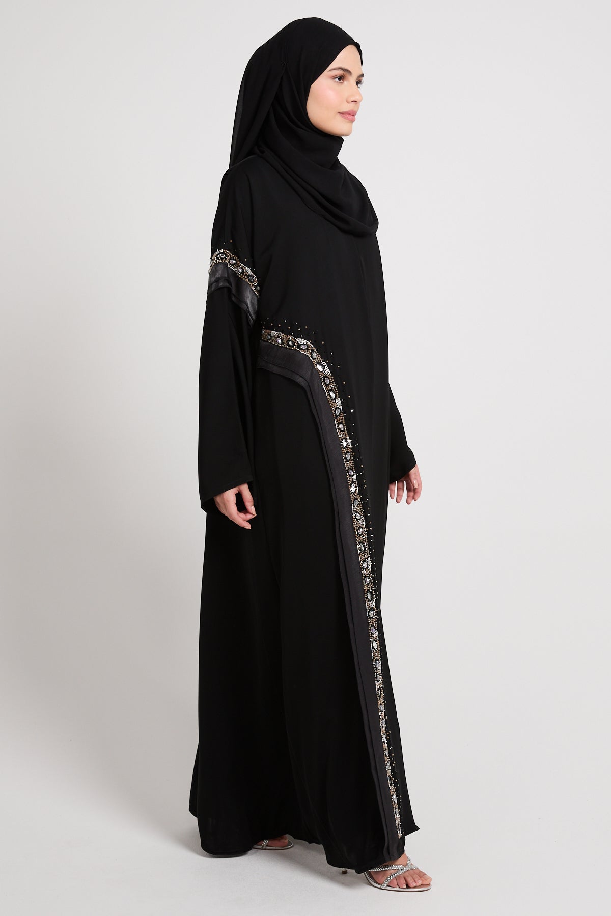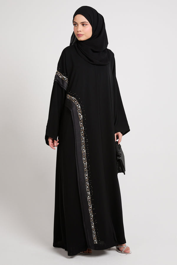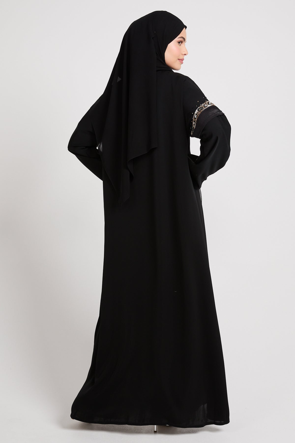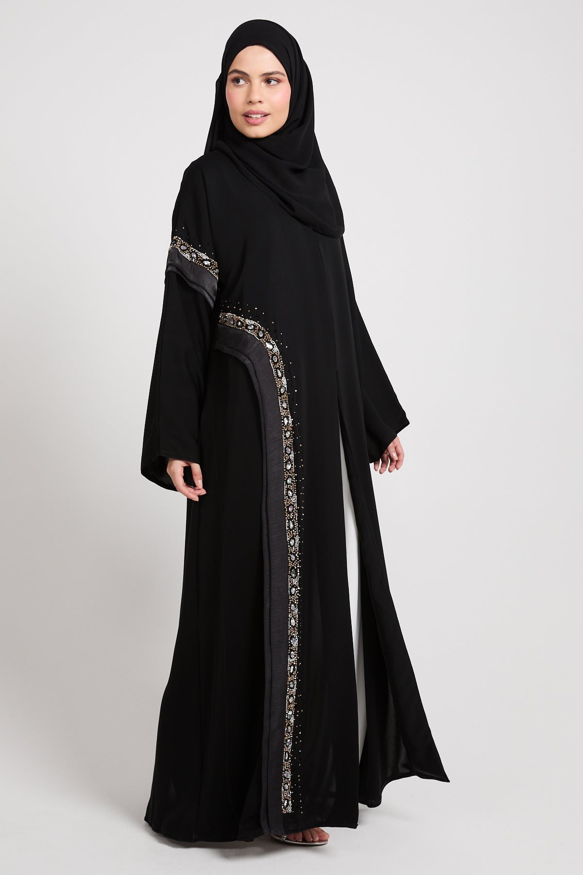 Premium Aurora Jewel Open Abaya with Organza Detail - Black