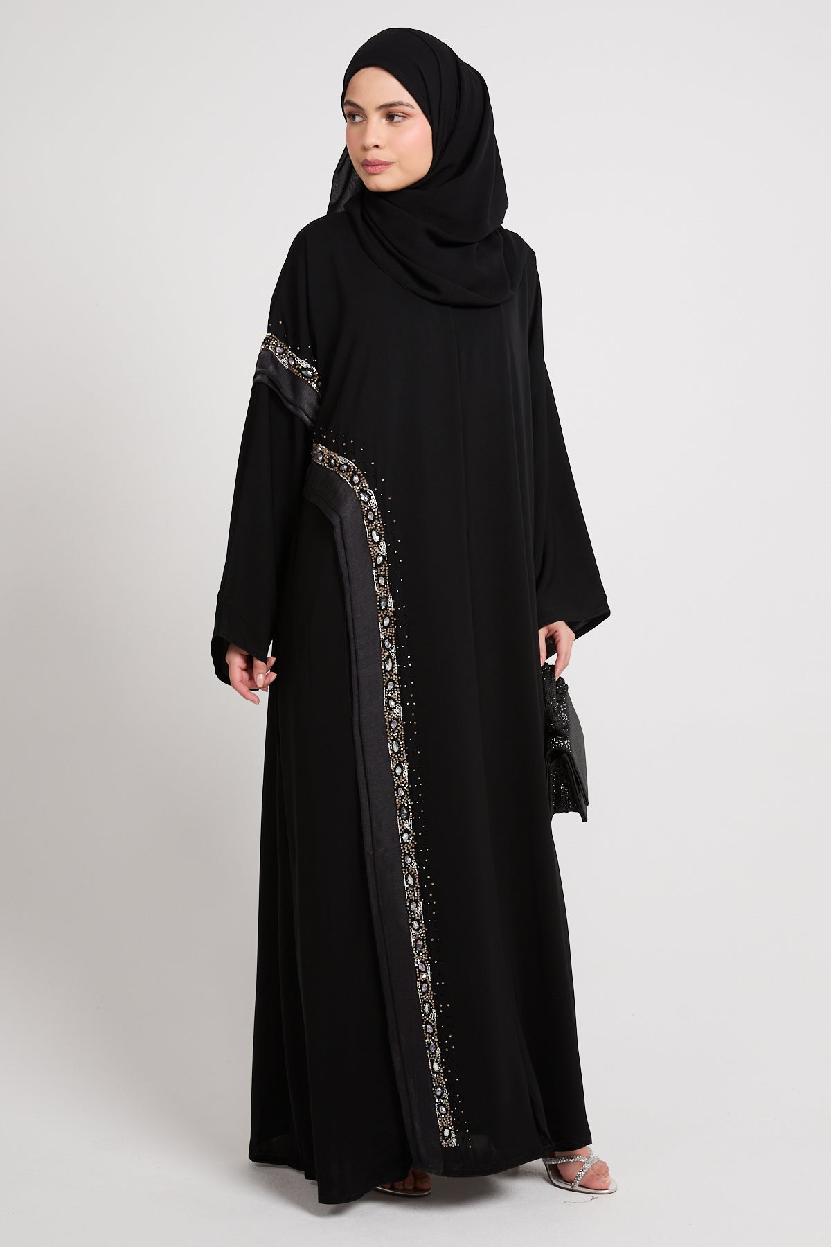 The Premium Aurora Jewel Open Abaya with Organza Detail – Black is where classic elegance meets modern glamour. Crafted from soft, flowing Korean nida fabric, this statement piece is designed to feel confident, graceful, and effortlessly polished.