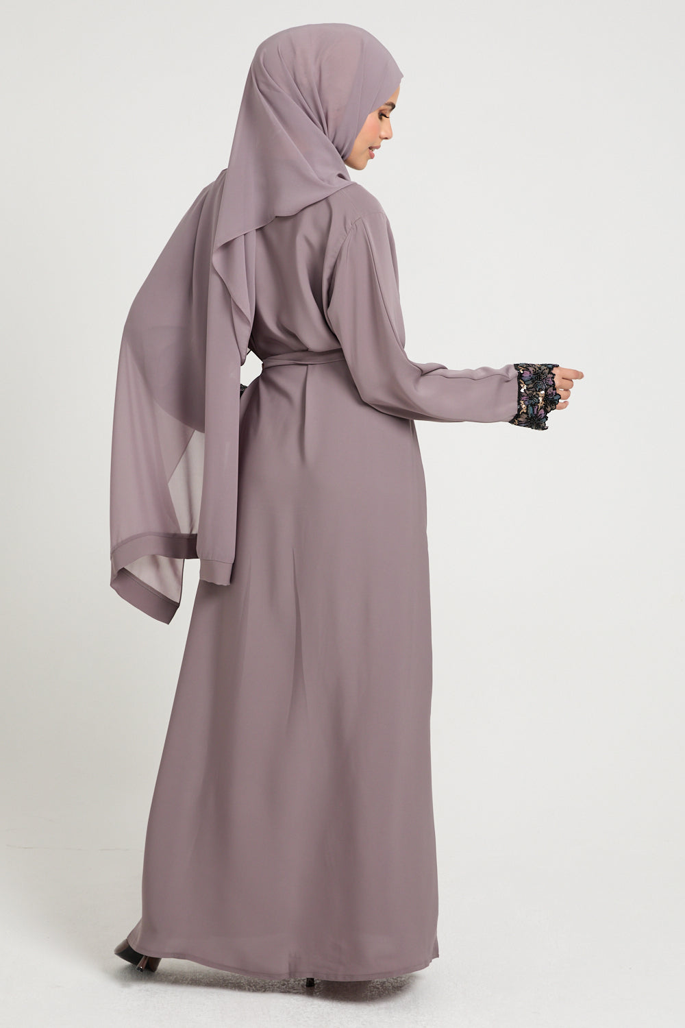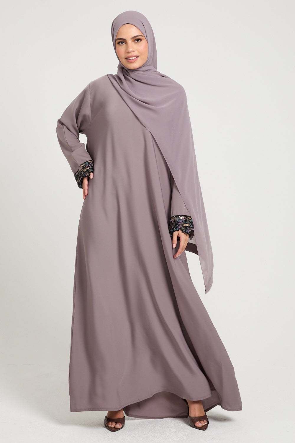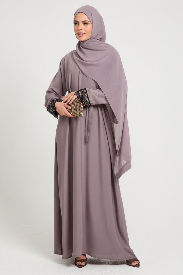Premium Plain Closed Abaya with Floral Lace Cuff - Smoky Orchid