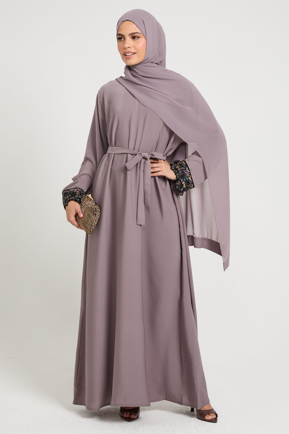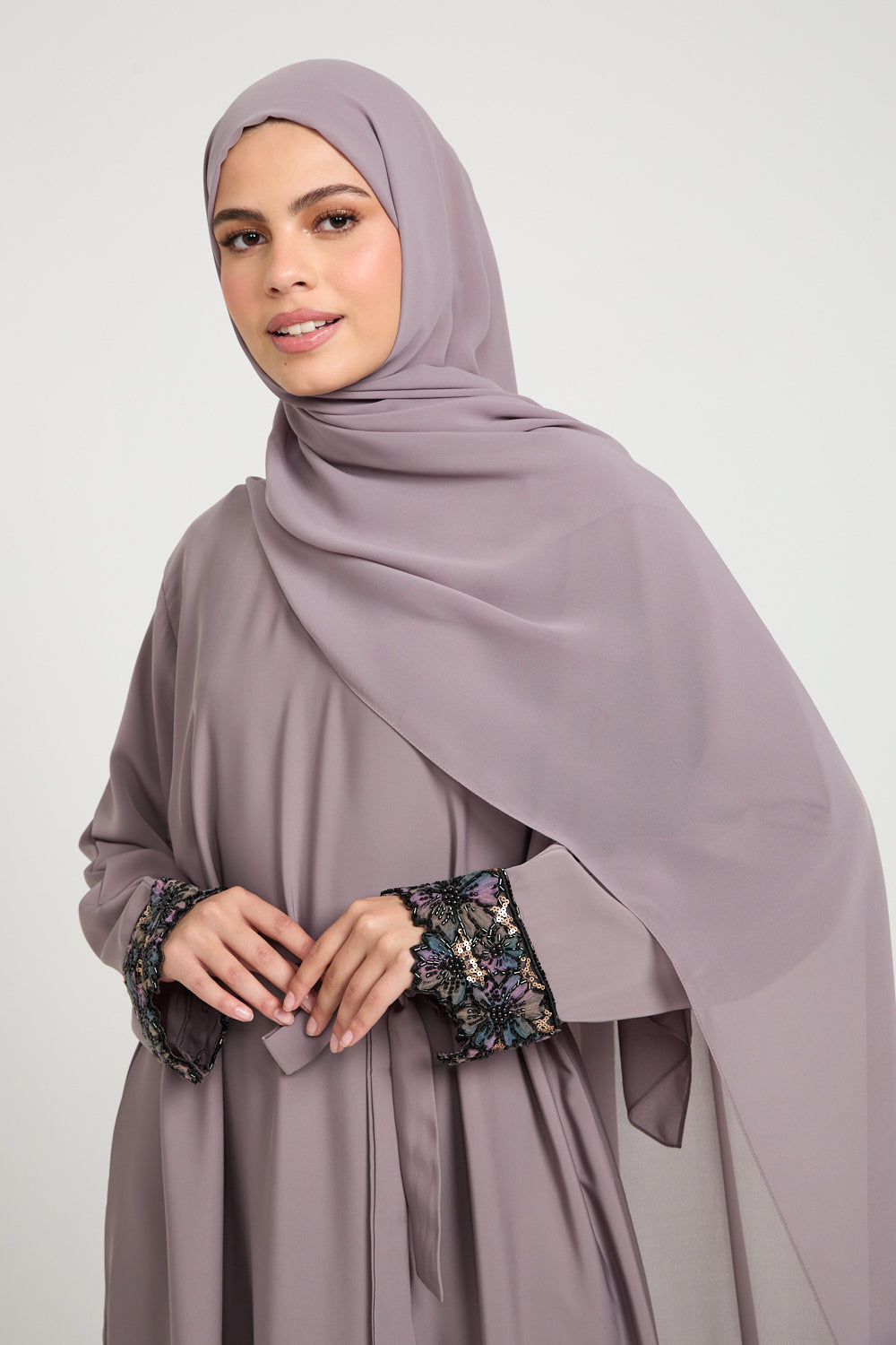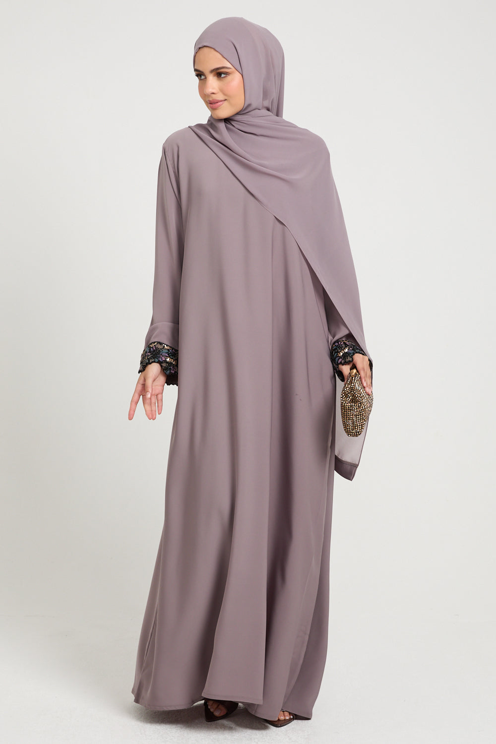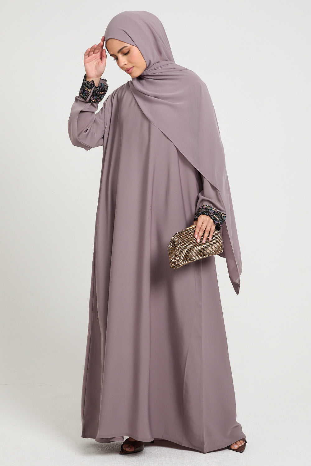 The Premium Plain Closed Abaya with Floral Lace Cuff – Smoky Orchid is crafted from buttery, lightweight Korean nidha that glides over the silhouette with a smooth, fluid drape. The Smoky Orchid hue - a muted mauve with a dusky undertone feels refined yet romantic, making it perfect for both daytime occasions and elegant evenings.