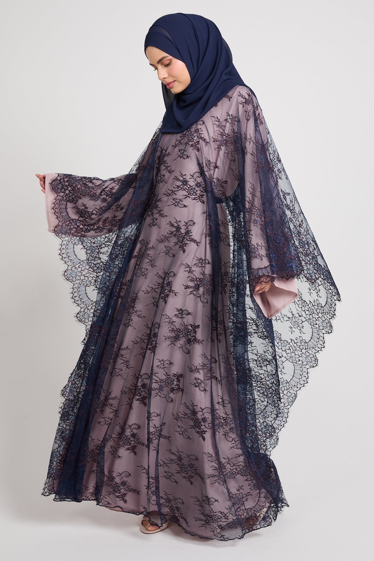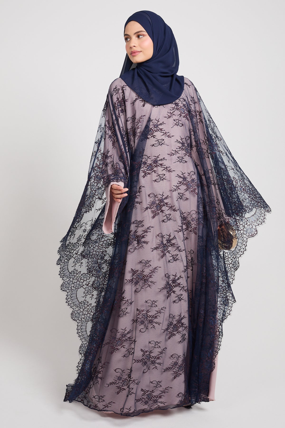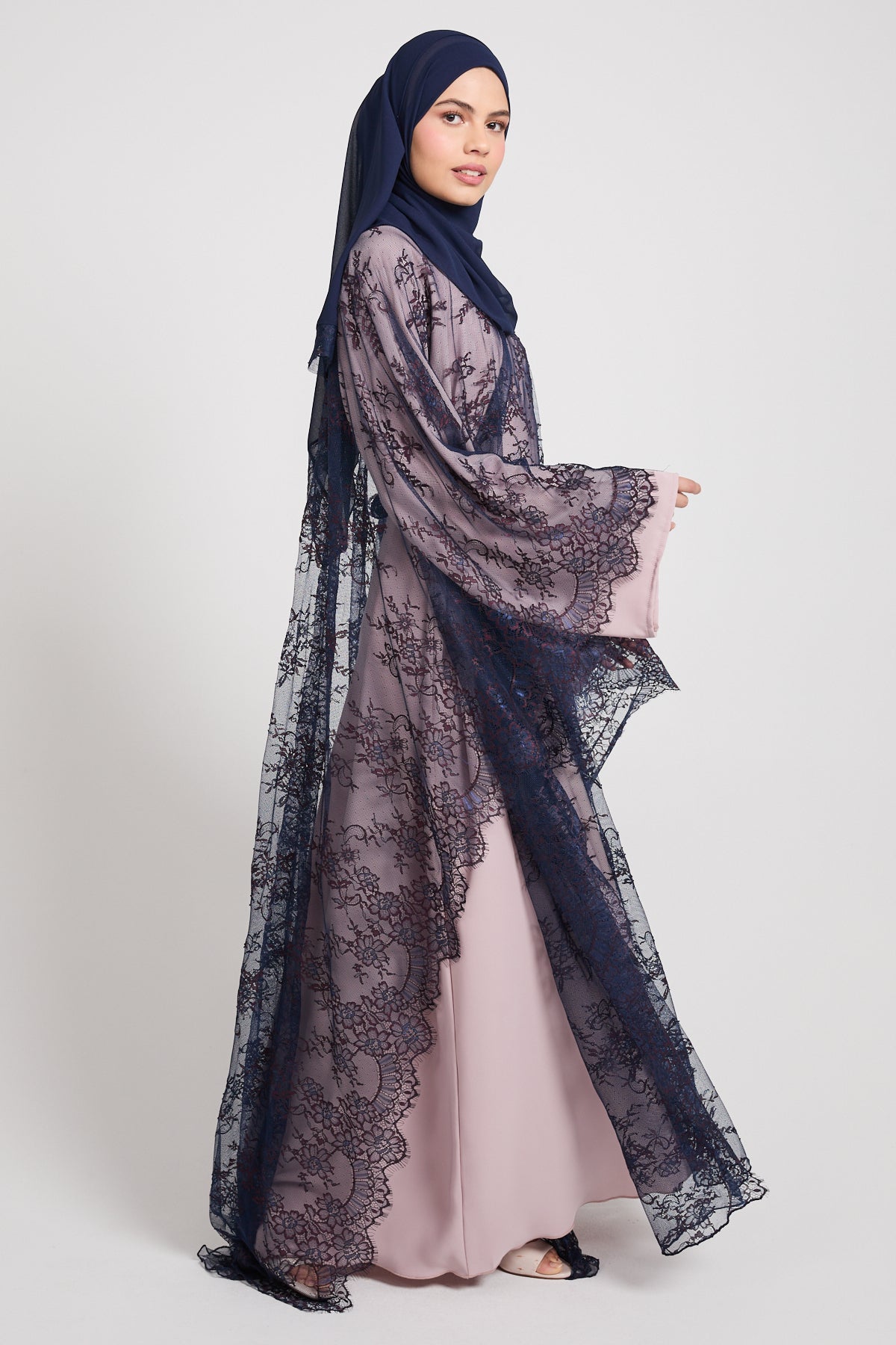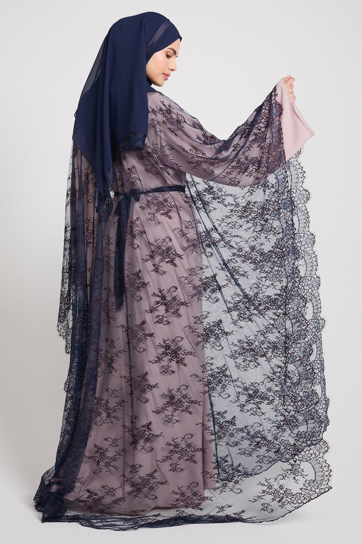 The colour Nightfall Rose blends a muted blush base with deep navy lace, creating a striking contrast that feels romantic, dramatic, and effortlessly luxurious. Perfect for evening occasions, formal gatherings, and elevated celebrations, this abaya is designed to leave a lasting impression without saying a word.