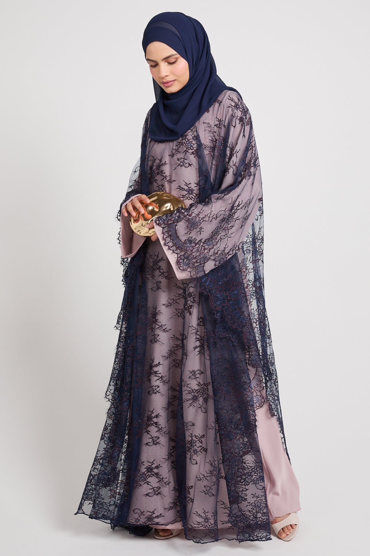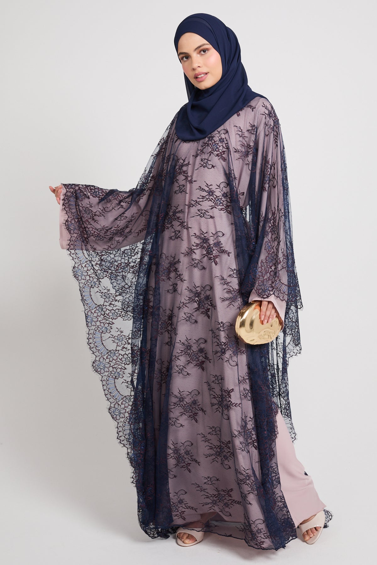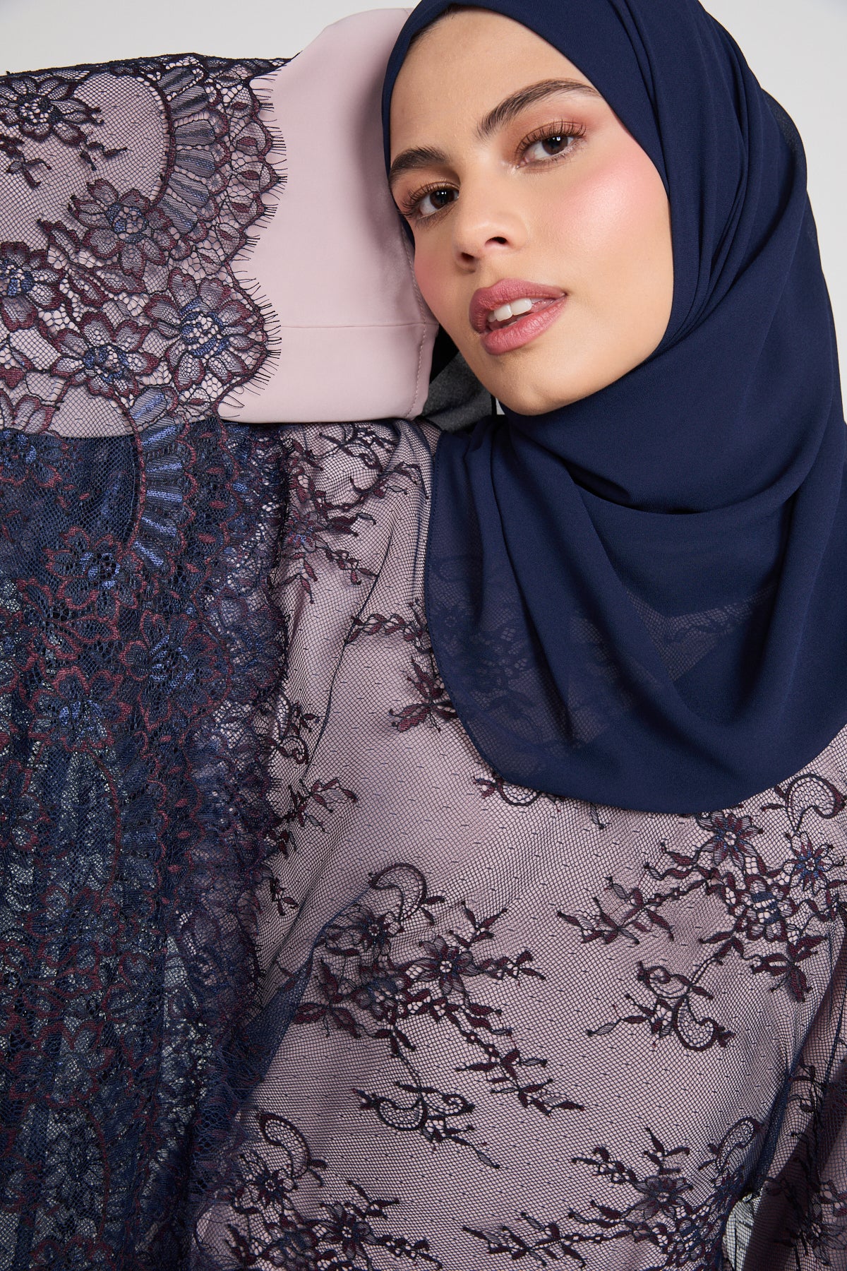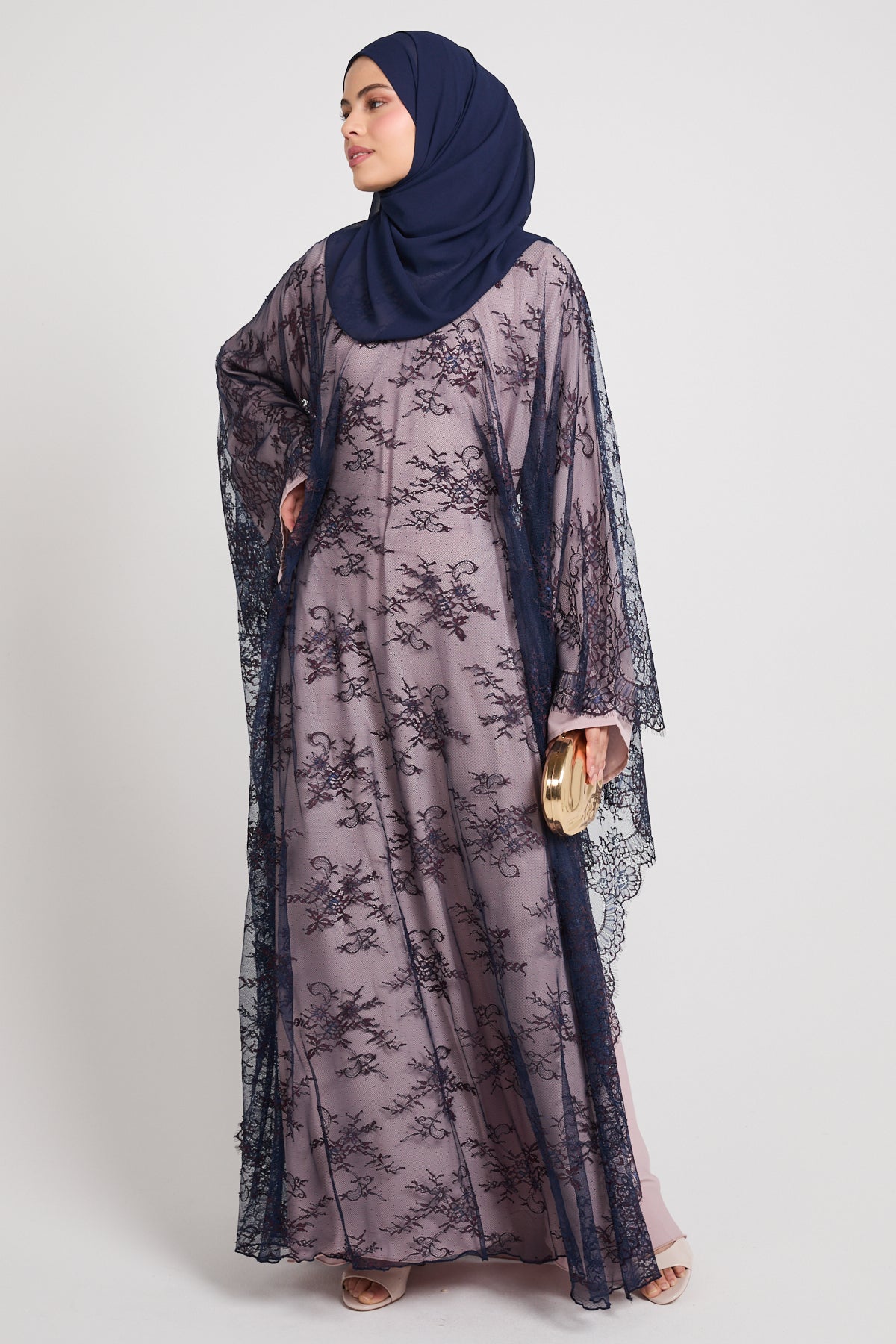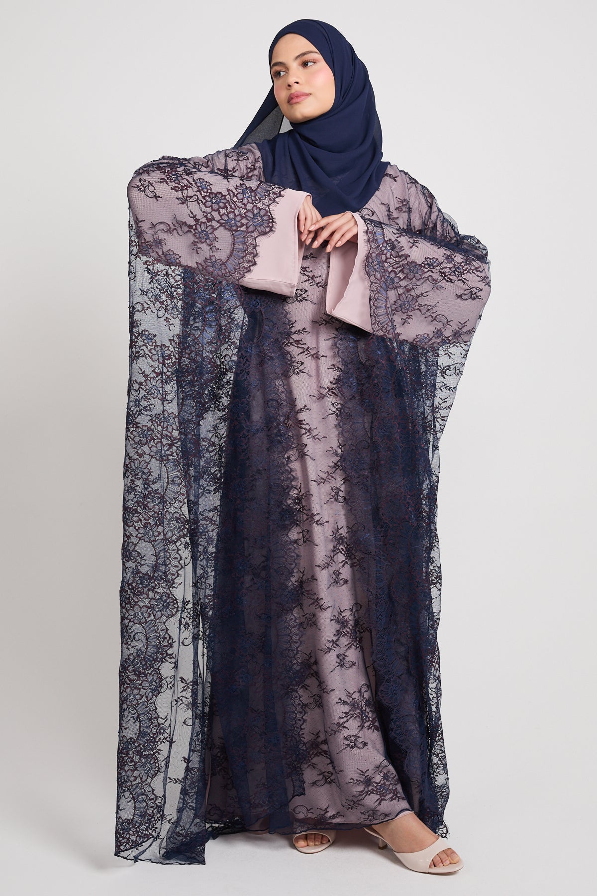 The colour Nightfall Rose blends a muted blush base with deep navy lace, creating a striking contrast that feels romantic, dramatic, and effortlessly luxurious. Perfect for evening occasions, formal gatherings, and elevated celebrations, this abaya is designed to leave a lasting impression without saying a word.