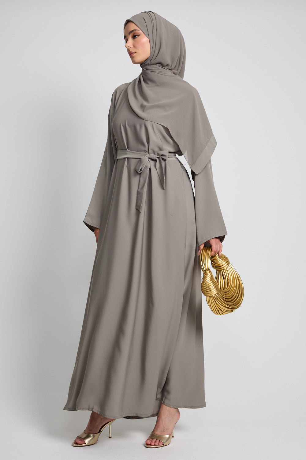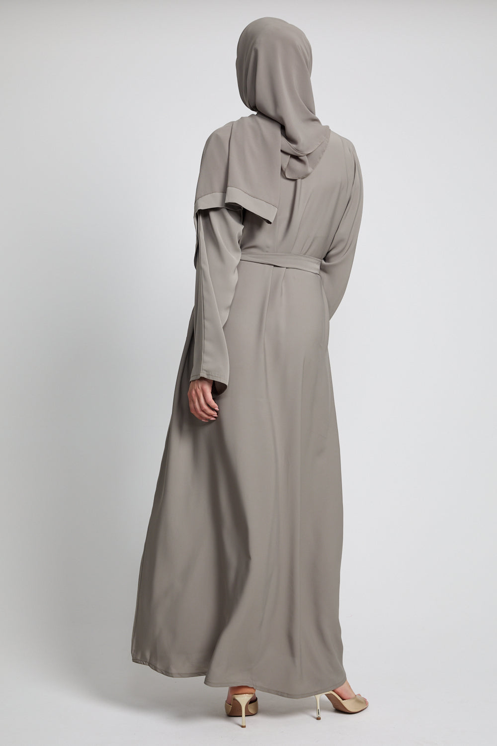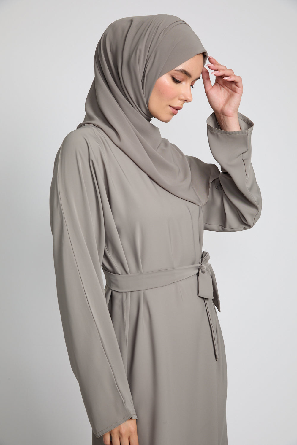 The soft Desert Olive hue brings a natural richness to your wardrobe, versatile enough for everyday wear, yet refined for spiritual journeys and formal moments. Paired with a matching premium hijab and belt, this set exudes quiet luxury from head to toe.