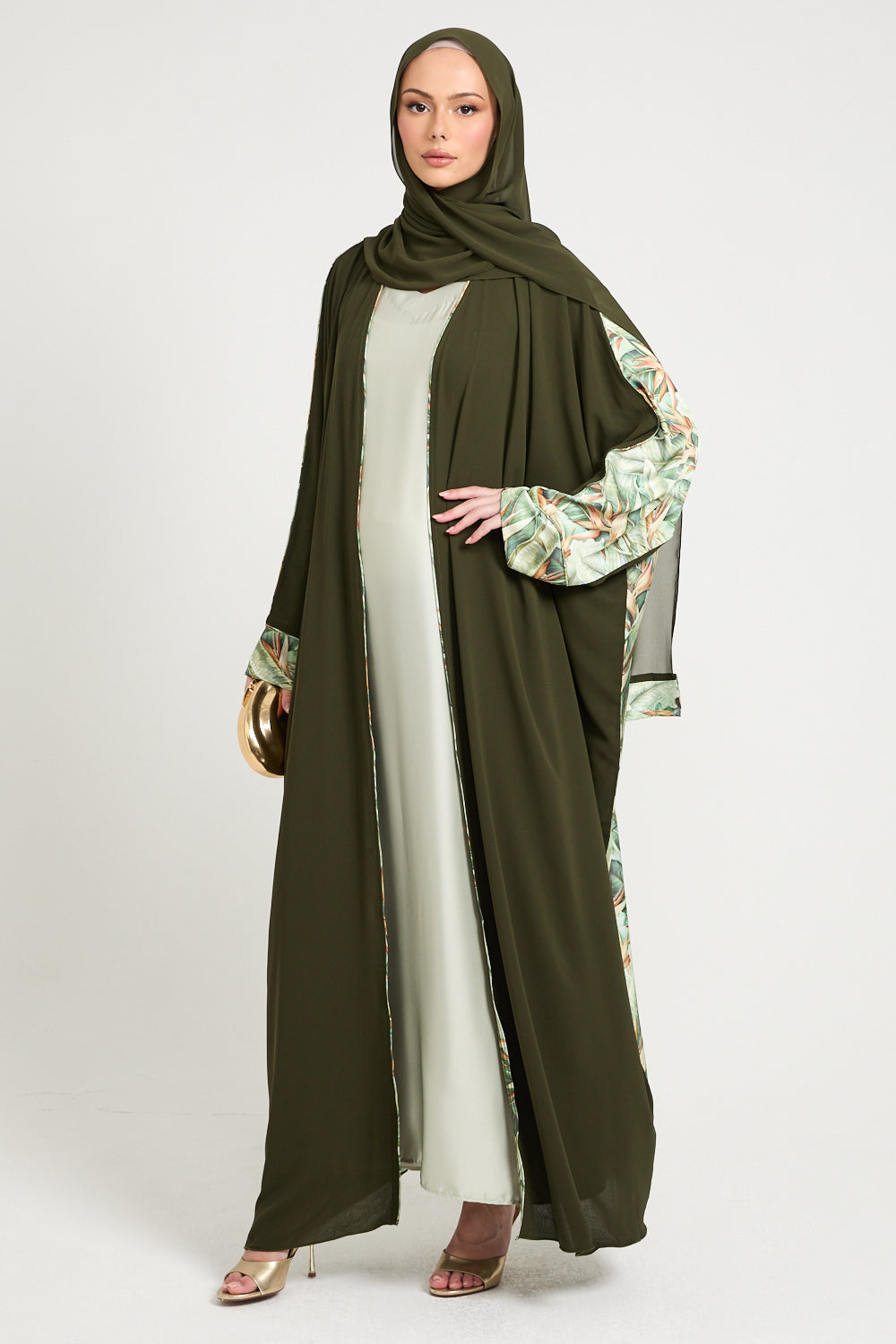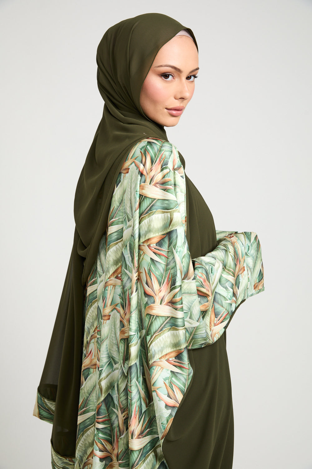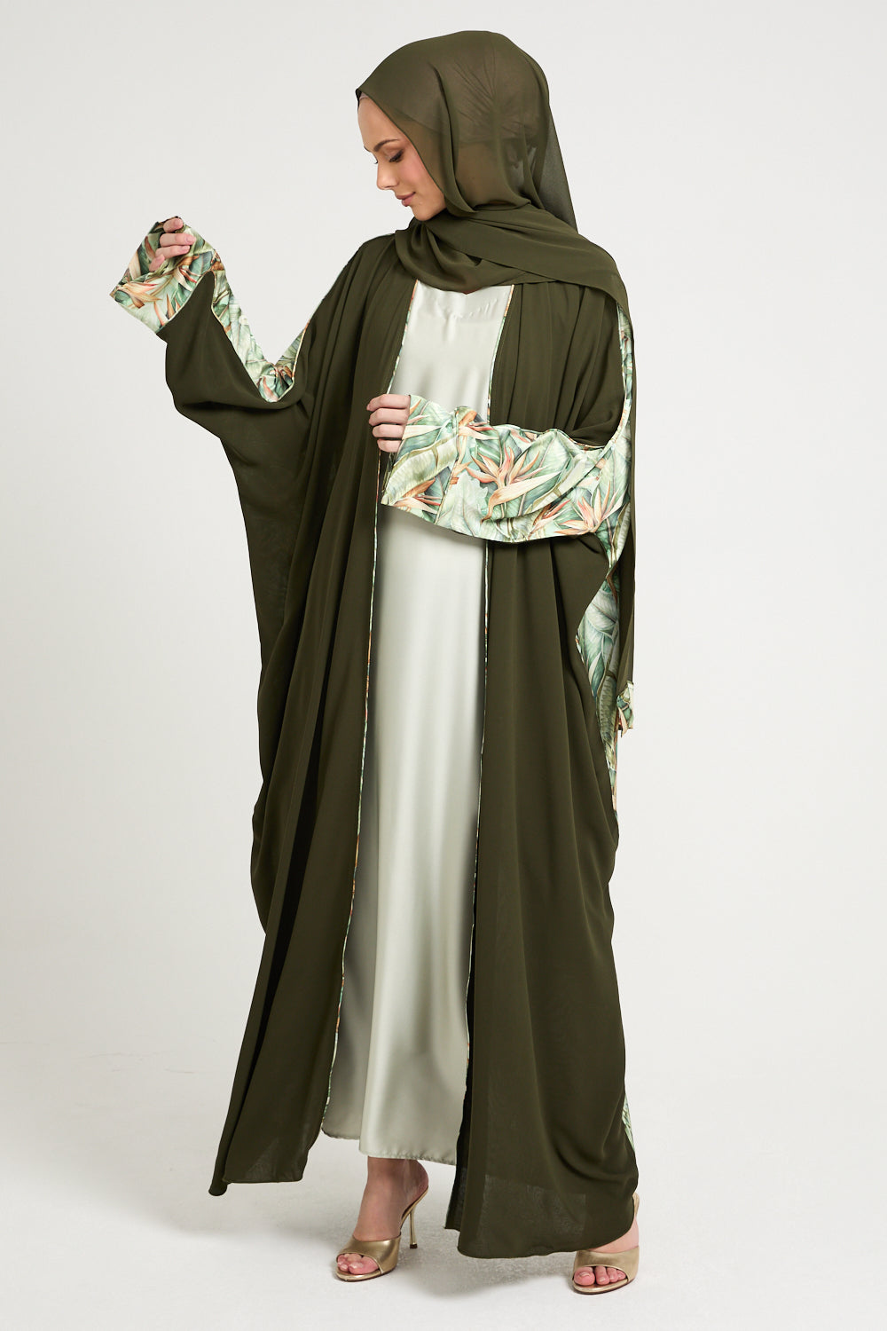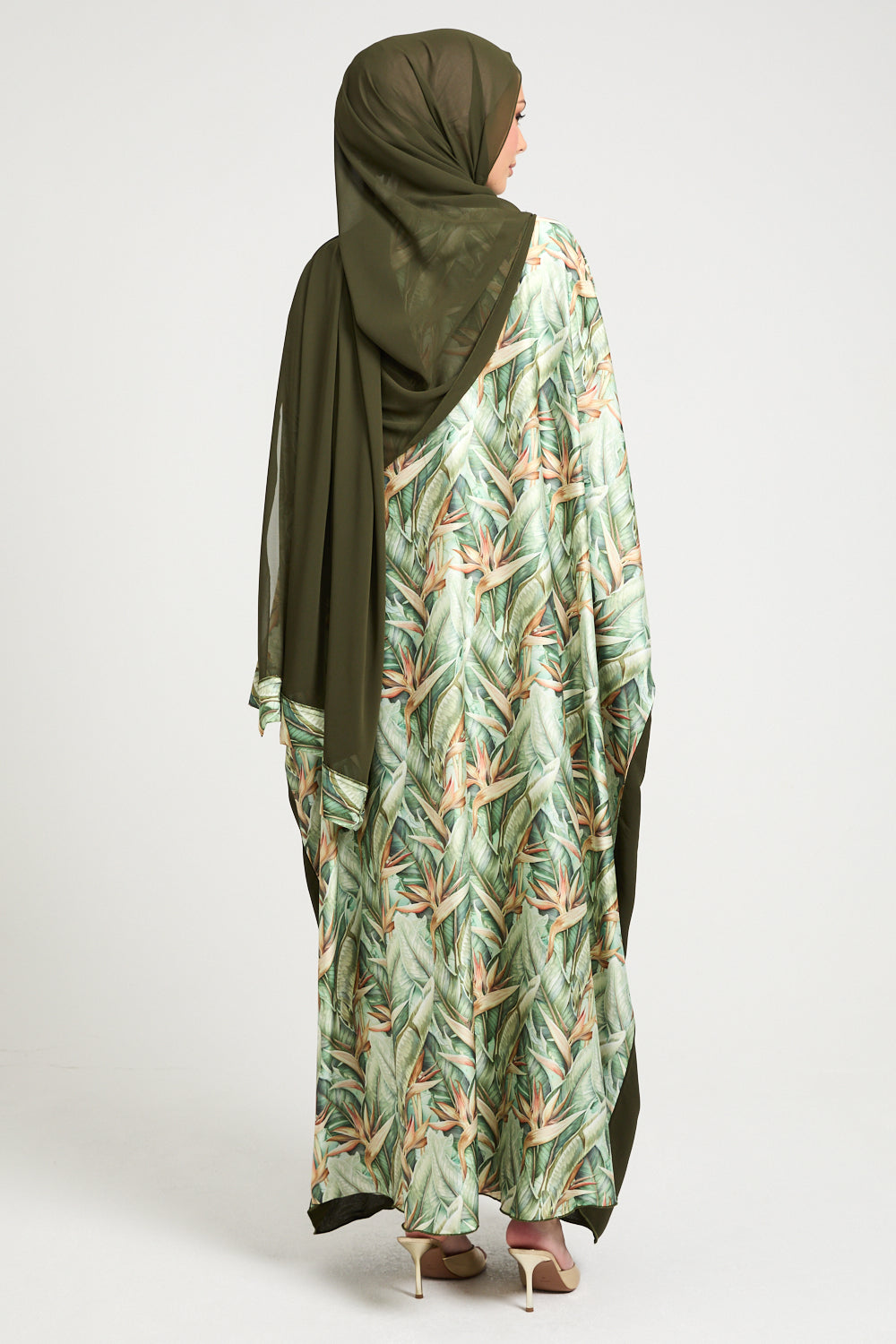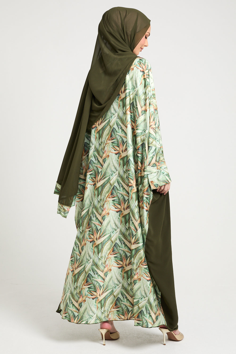 The true artistry lies in its statement features — wide draped sleeves and rear panel adorned in a delicately illustrated palm foliage print, reminiscent of upscale resort wear and tropical couture. The contrast of matte green against the soft botanical satin-finish print creates a stunning visual harmony that feels editorial, elevated, and unmistakably luxe.