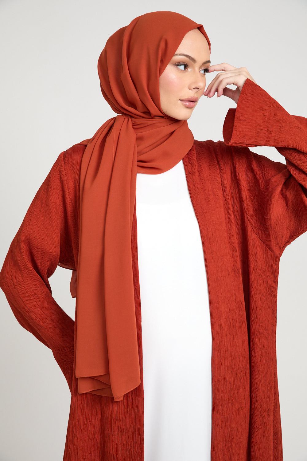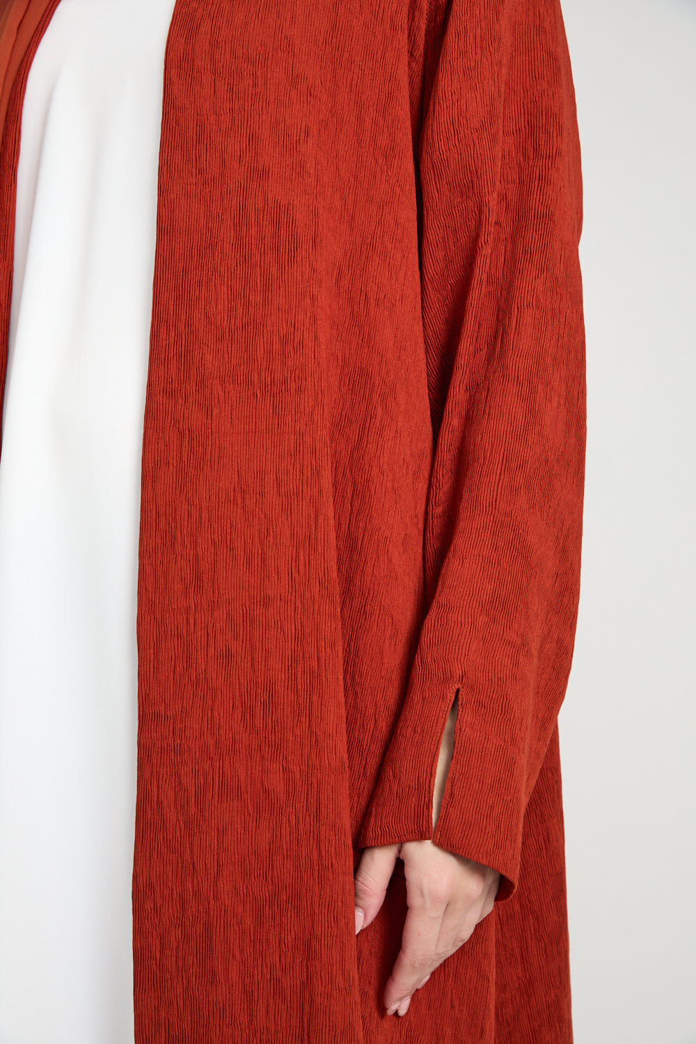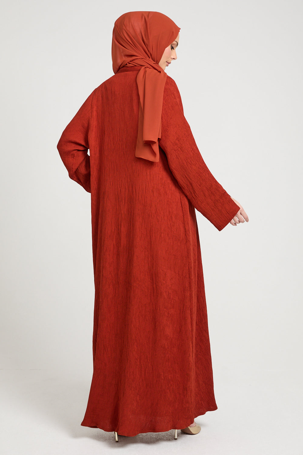 The Modern Muse Open Abaya – Terracotta Ember radiates understated strength and earthy sophistication. Crafted from premium ribbed crepe, it offers a beautifully soft drape and texture that moves effortlessly with you. The medium-weight fabric provides the perfect balance for all seasons - breathable yet structured, flowing yet refined.