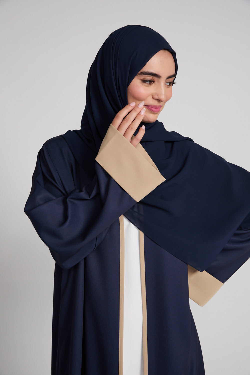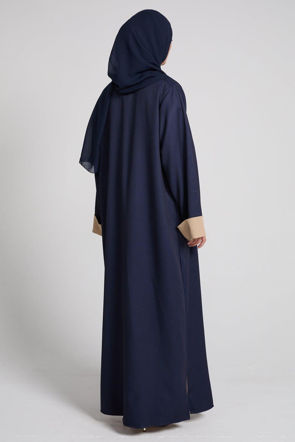 The Premium Two Tone Open Abaya in Navy Dusk & Desert Beige blends sophistication and modern minimalism in a silhouette designed for the effortlessly chic woman. The deep navy body creates a sleek, elongated frame, while the contrasting Desert Beige cuffs and inner panel add a soft, elevated harmony that feels both classic and contemporary.