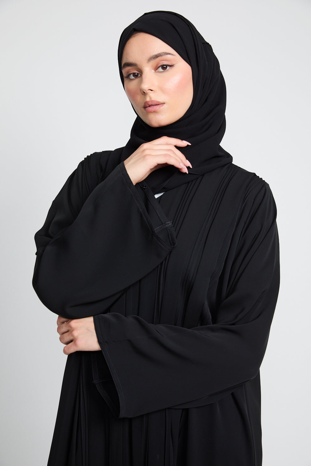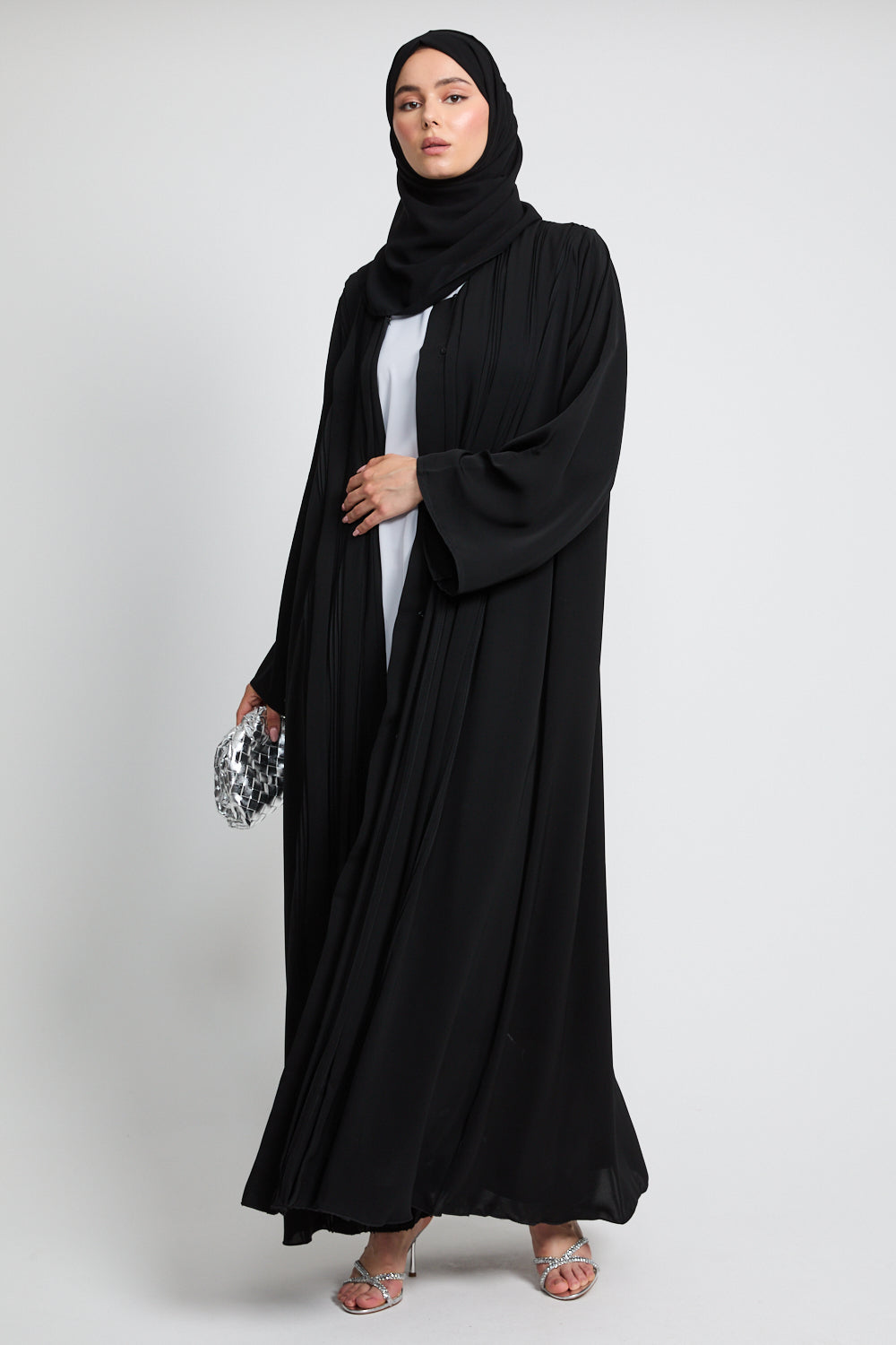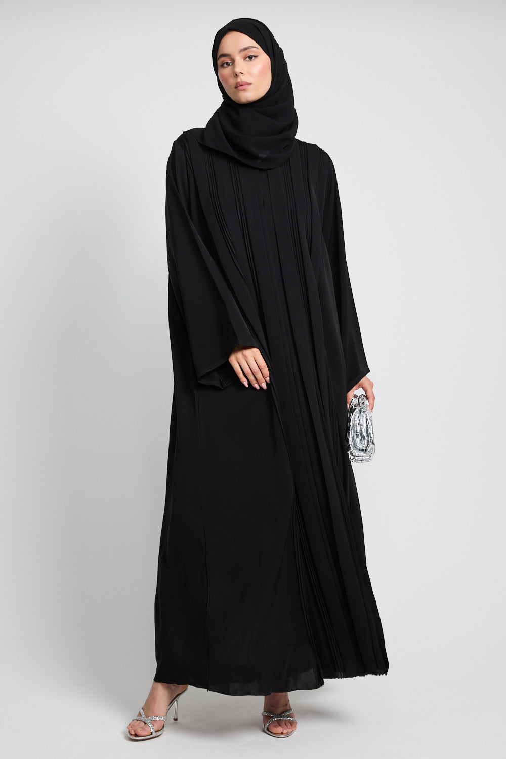 The Premium Pleated Detailing Open Abaya in Black is a refined expression of minimalist elegance. Thoughtfully placed front pleats bring subtle structure and softness to the silhouette, offering a graceful drape that moves with quiet confidence.