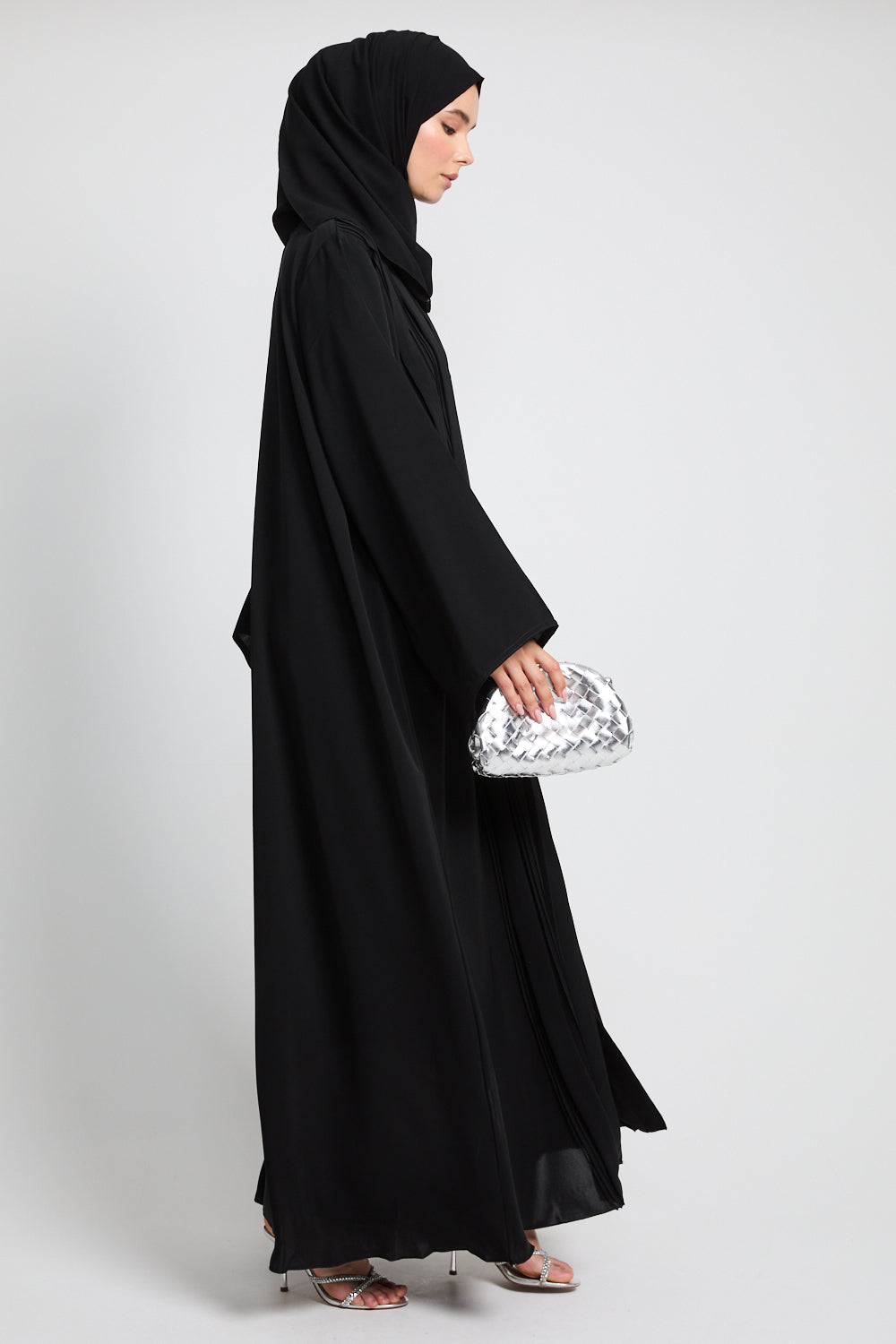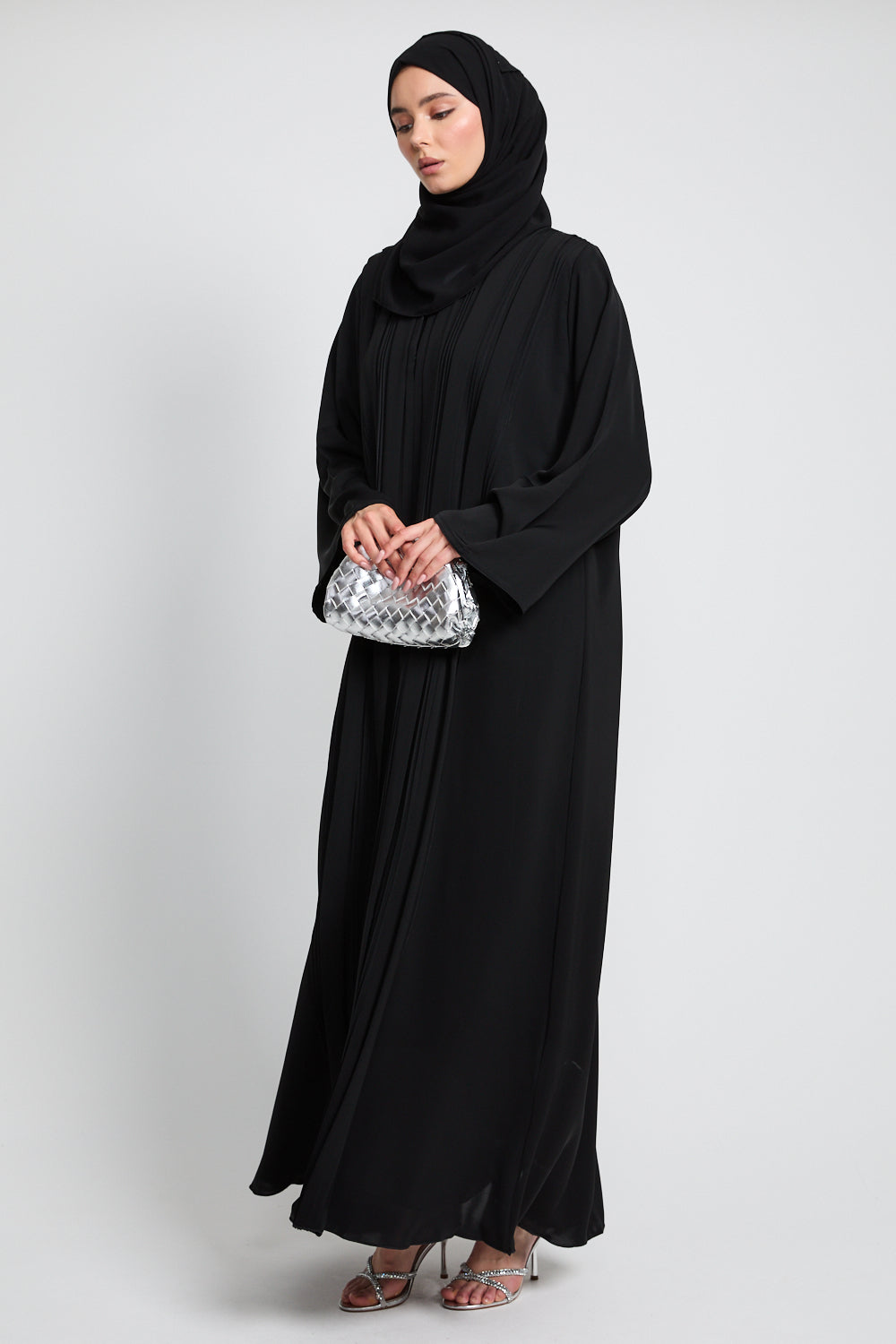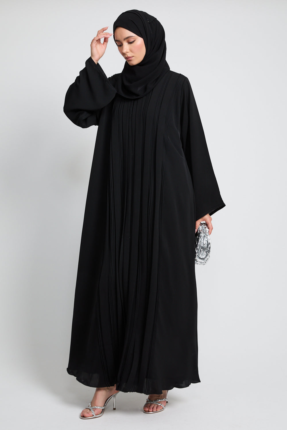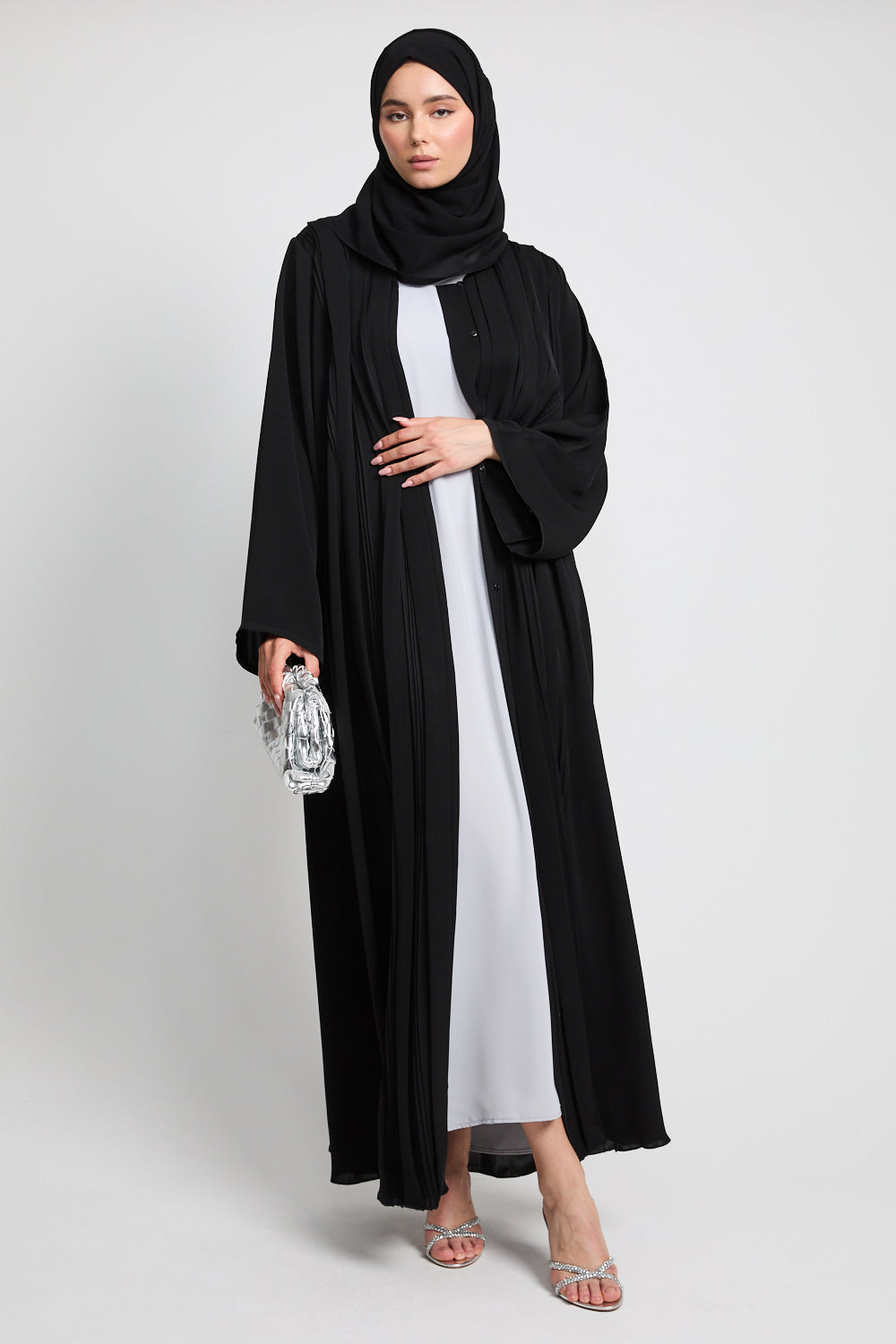 The Premium Pleated Detailing Open Abaya in Black is a refined expression of minimalist elegance. Thoughtfully placed front pleats bring subtle structure and softness to the silhouette, offering a graceful drape that moves with quiet confidence.
