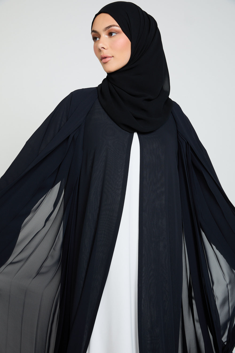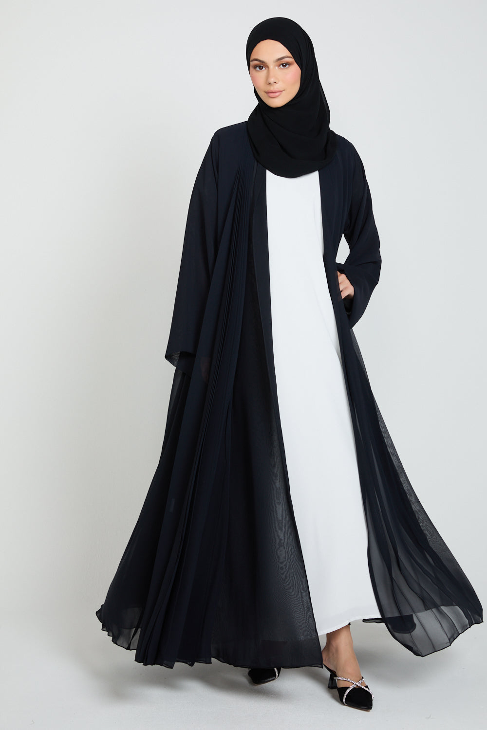 Luxury Chiffon Open Abaya with Pleated Detailing - Black