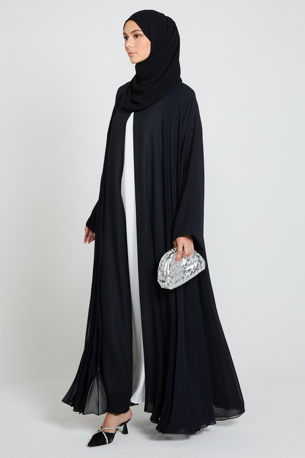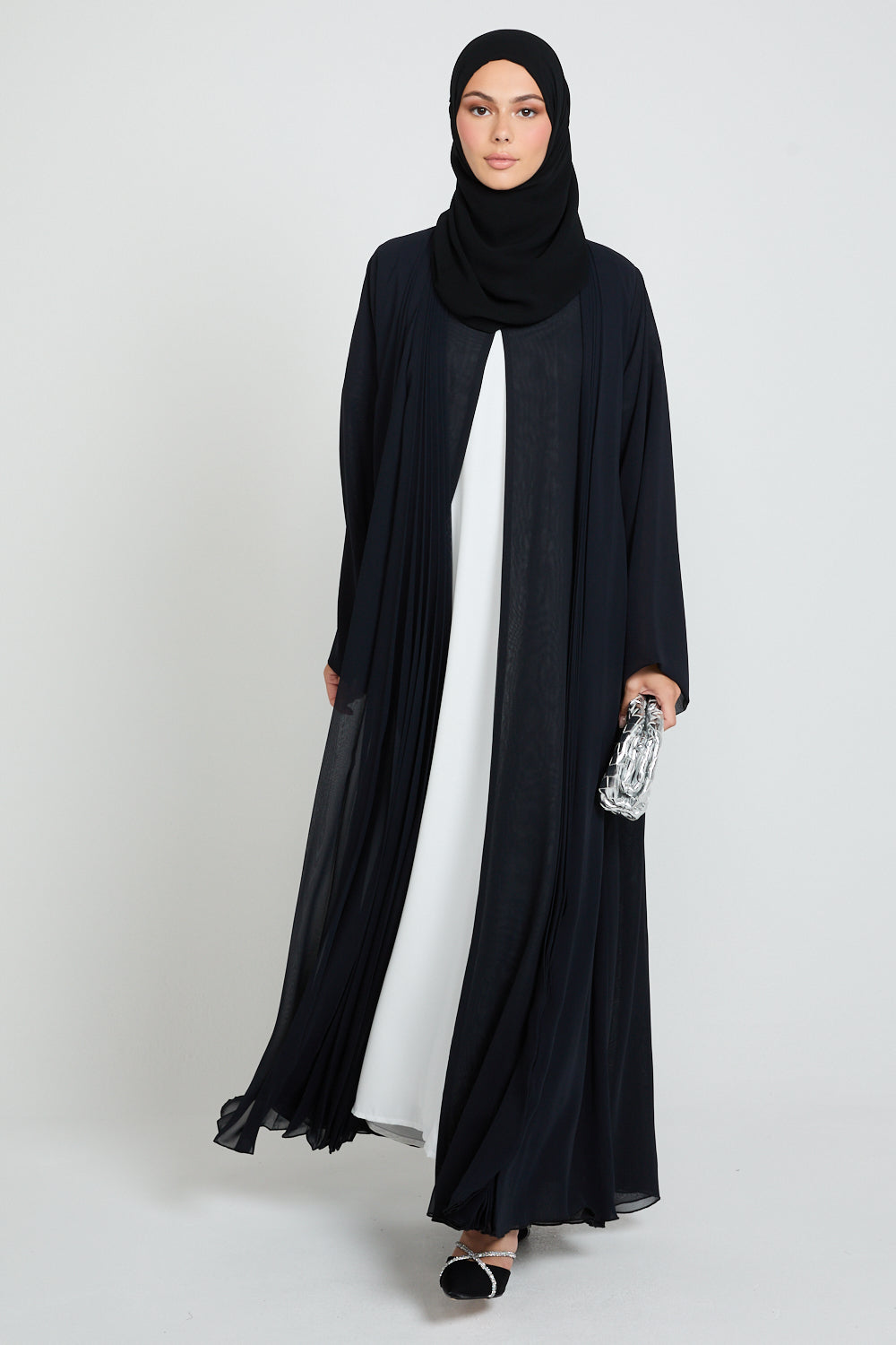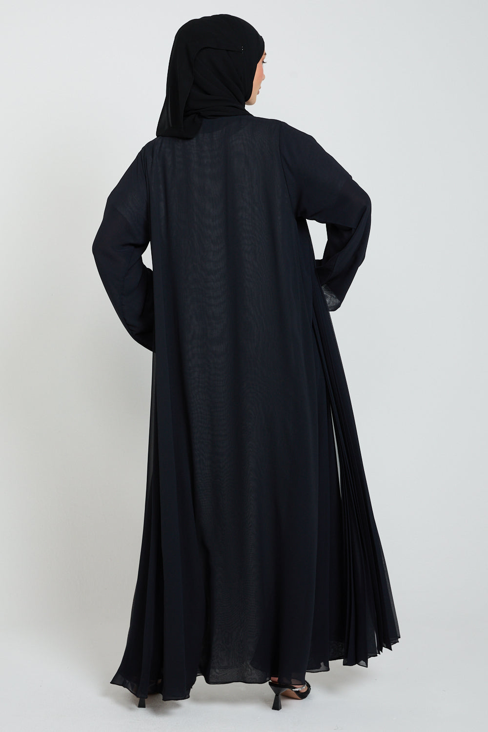 • Features: Stud fastener to allow to close the abaya. Pleated detailing at the front.