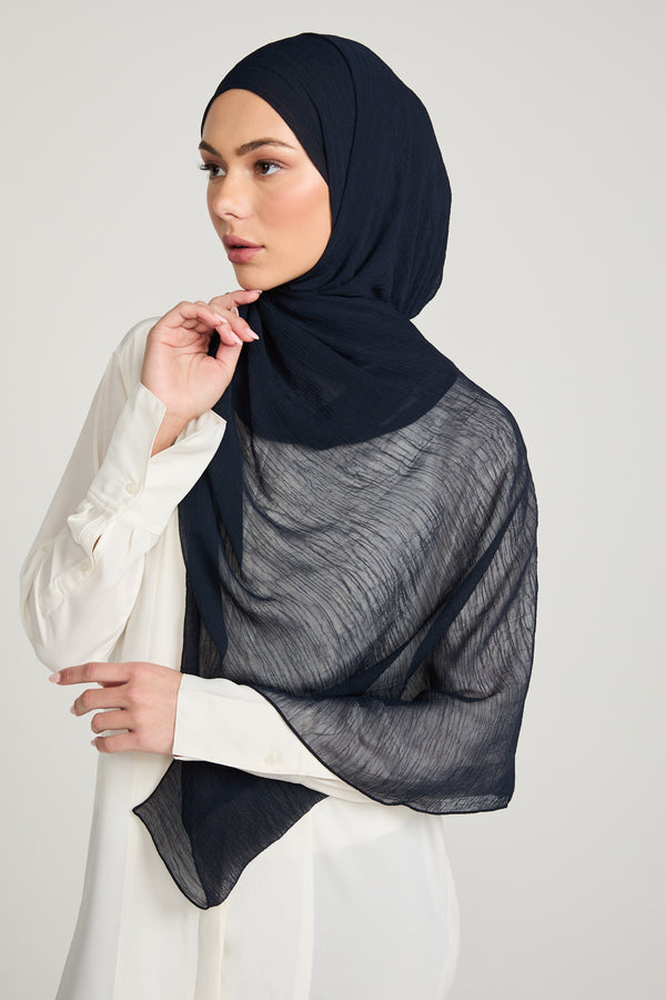 Embrace understated elegance with the Luxury Soft Crush Hijab in Navy. Made from premium soft crush fabric, this hijab features a gently textured finish that brings depth and richness to your look, all while offering a soft, lightweight drape that flows with ease.
