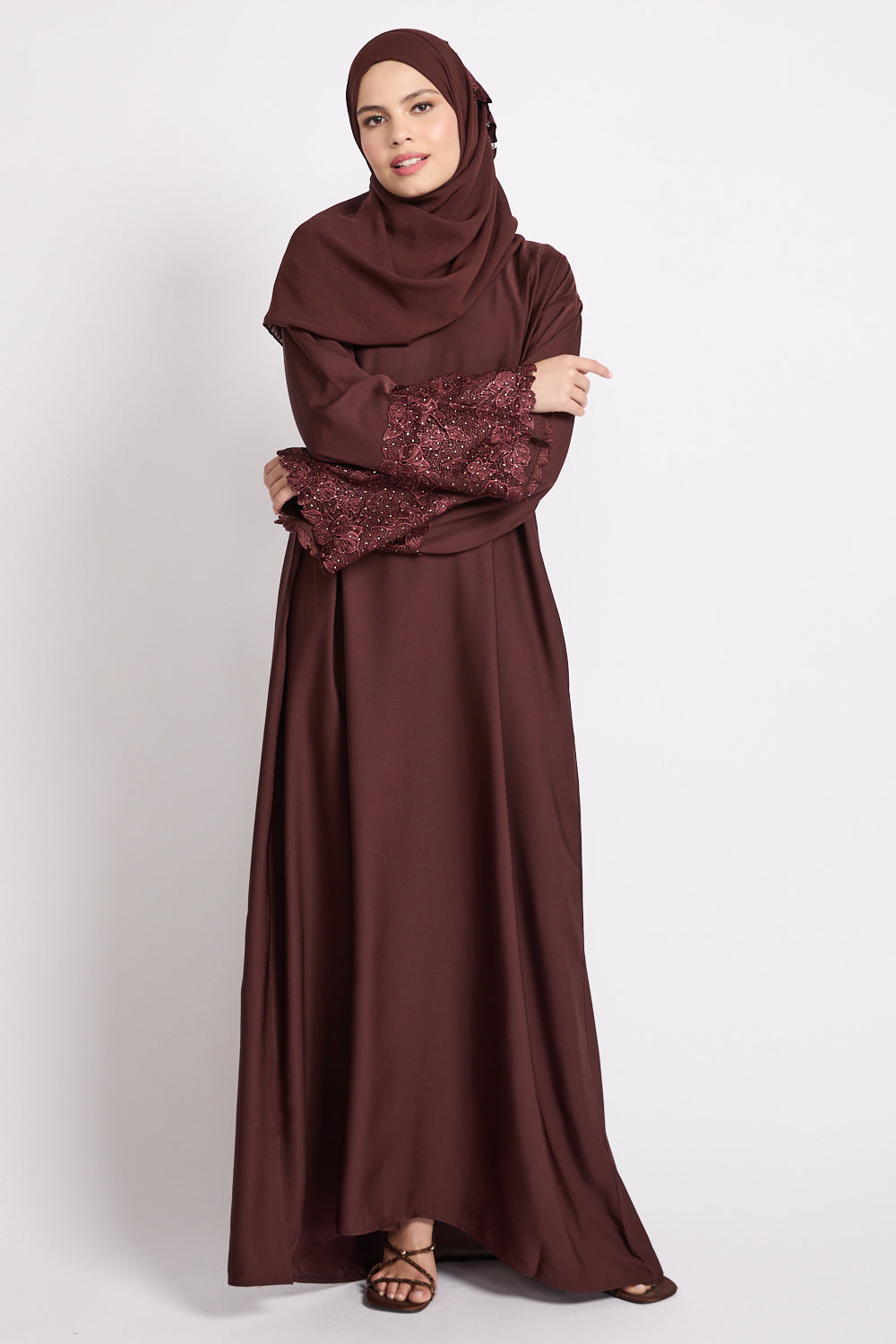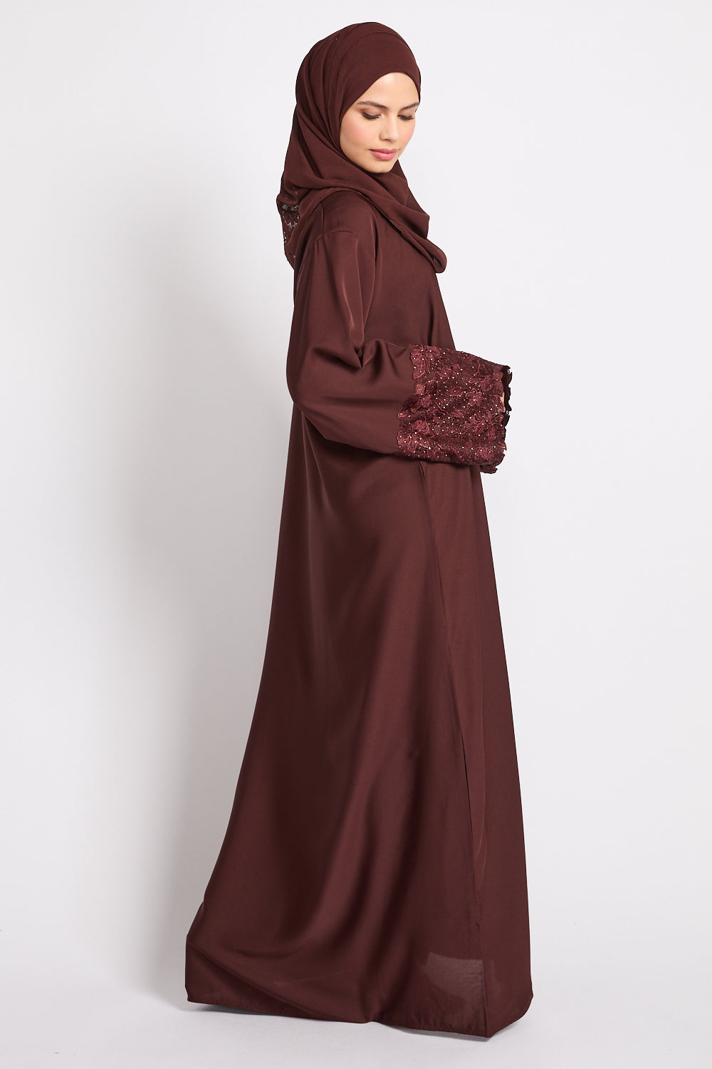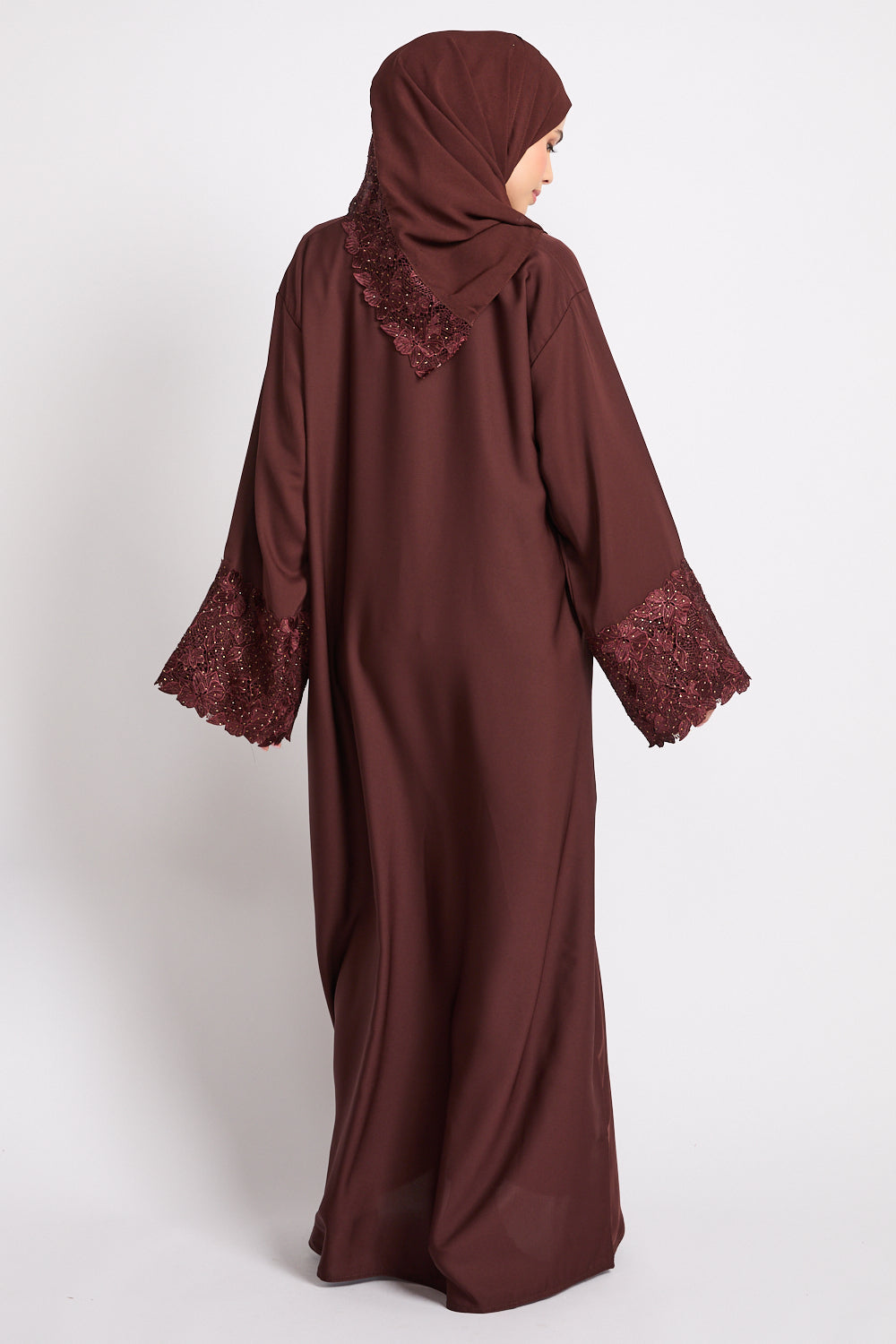 Mahogany Brown Closed Abaya with Embellished Floral Cuffs