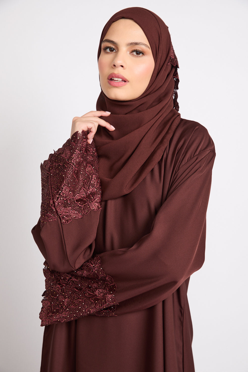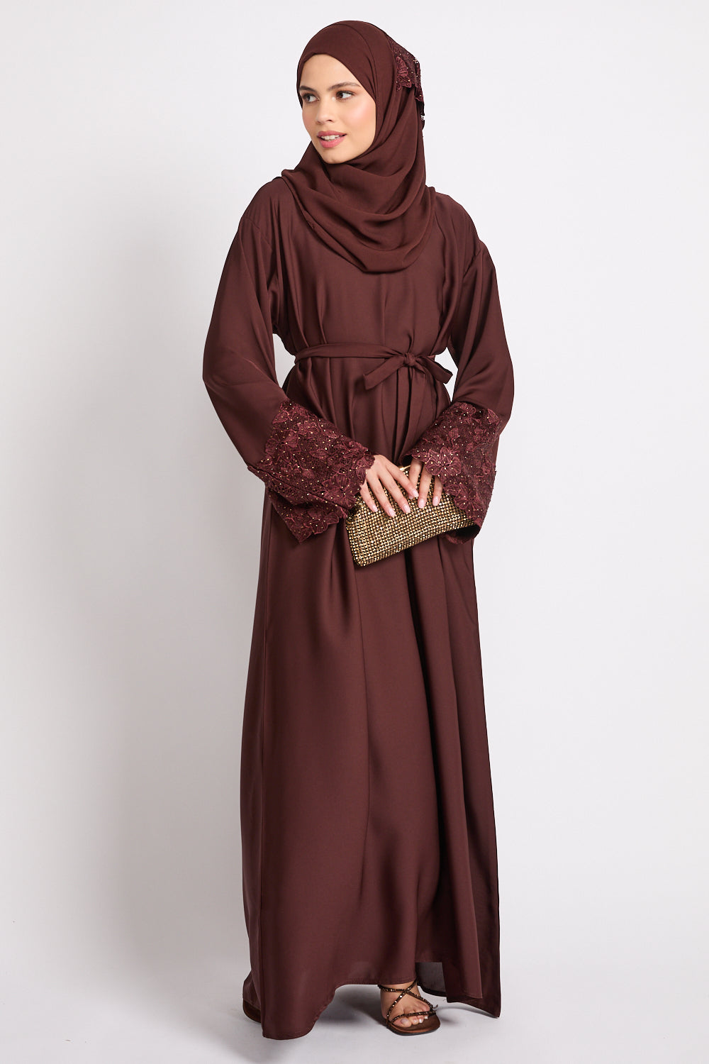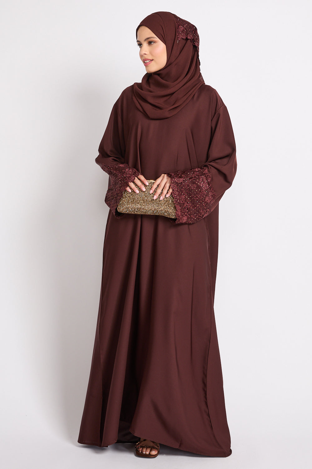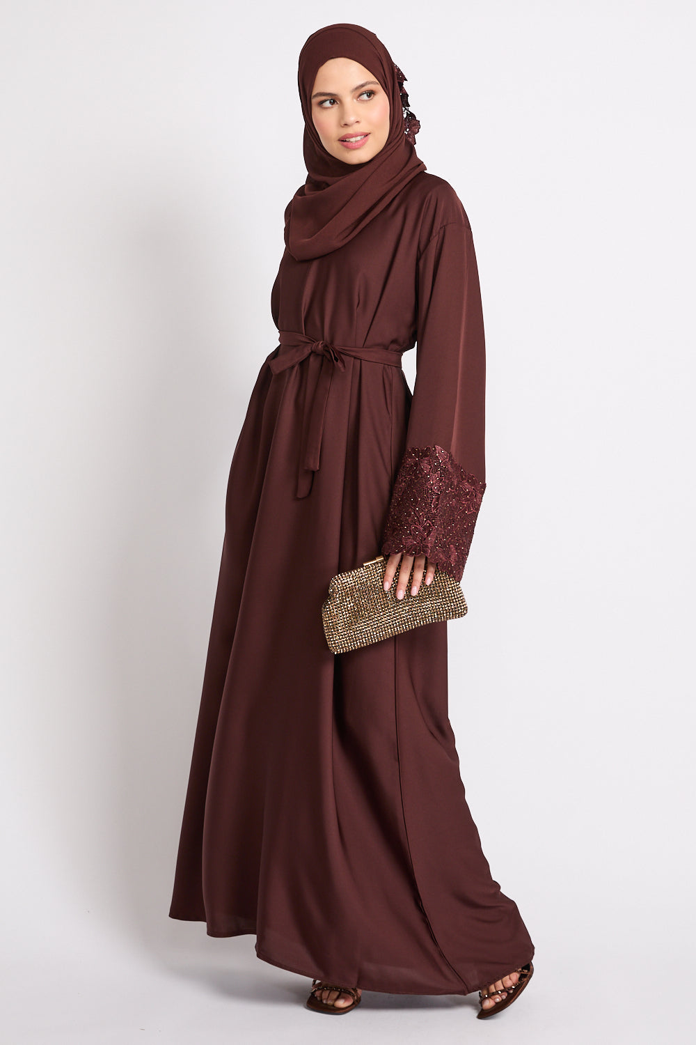 Mahogany Brown Closed Abaya with Embellished Floral Cuffs