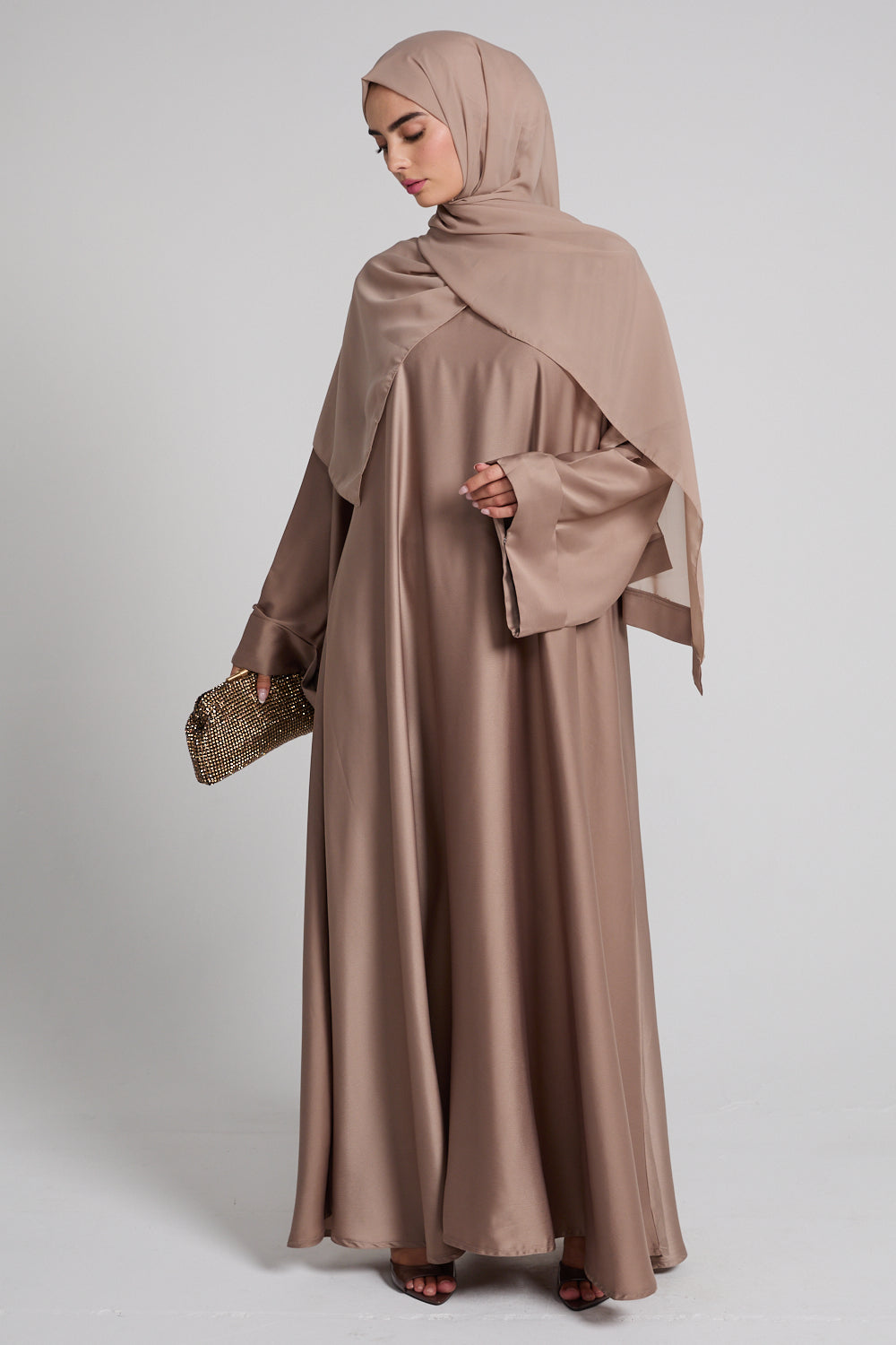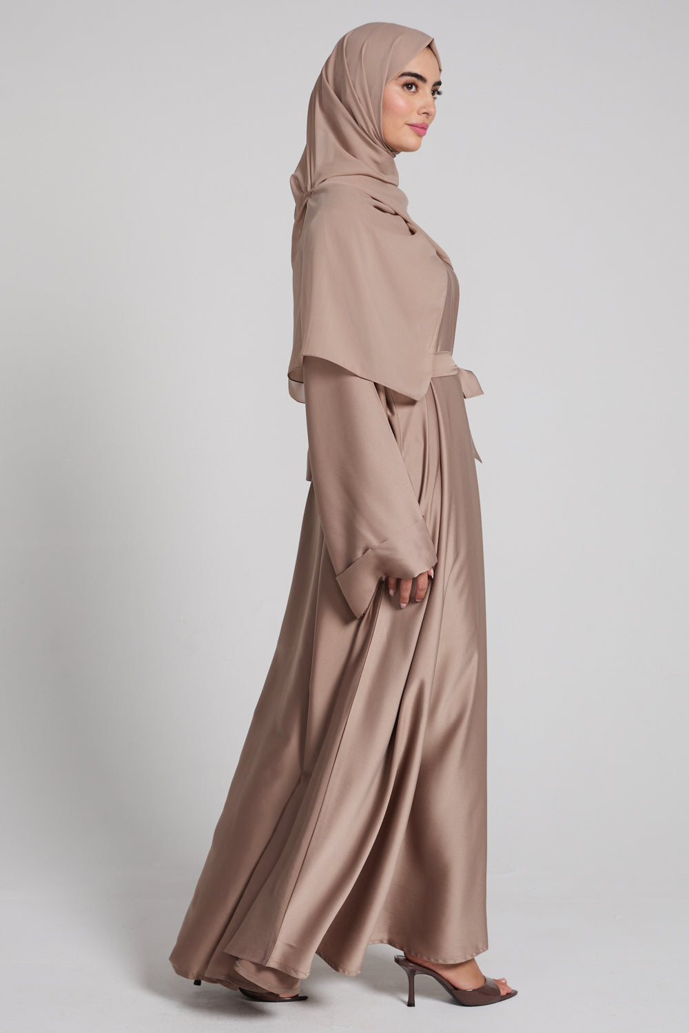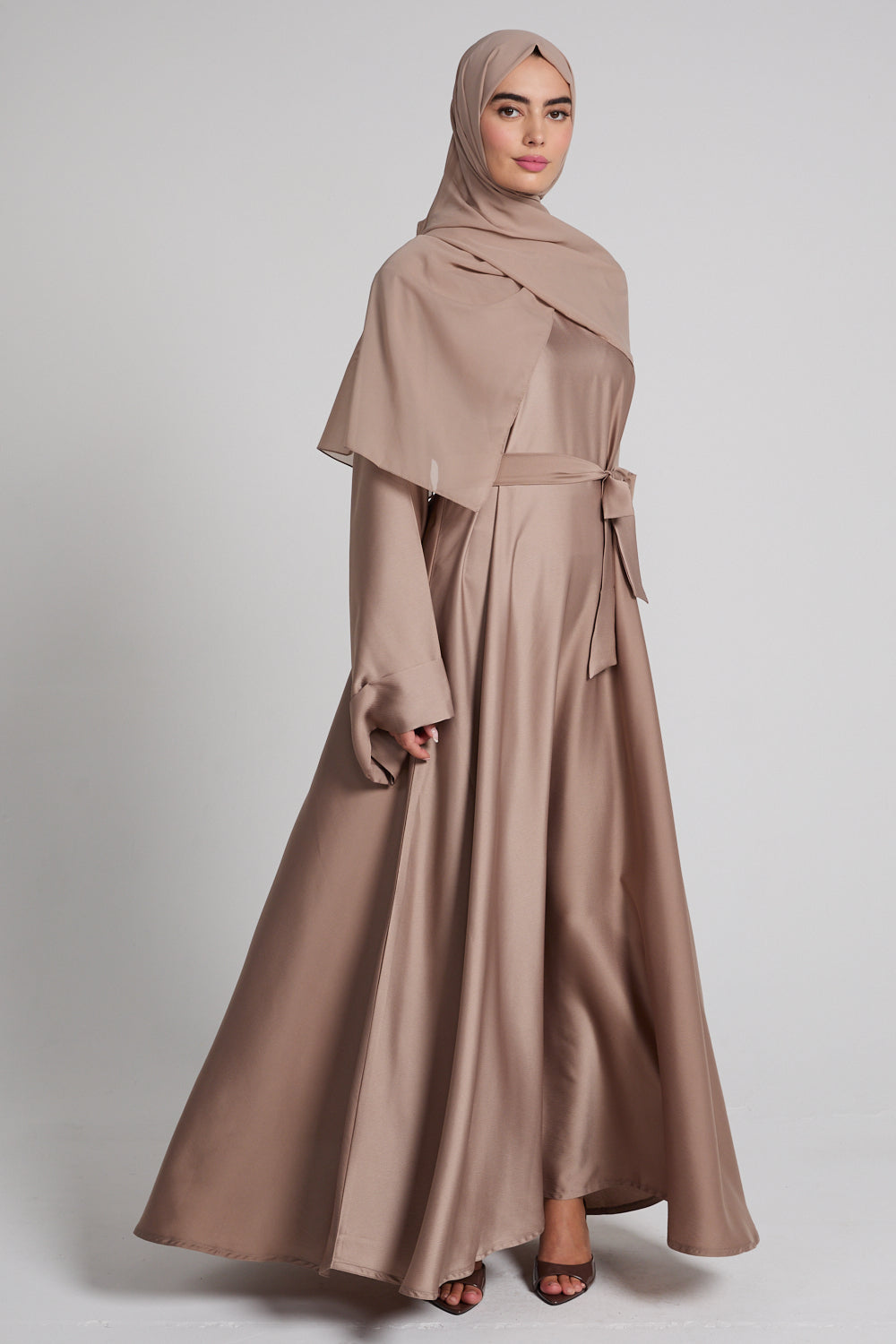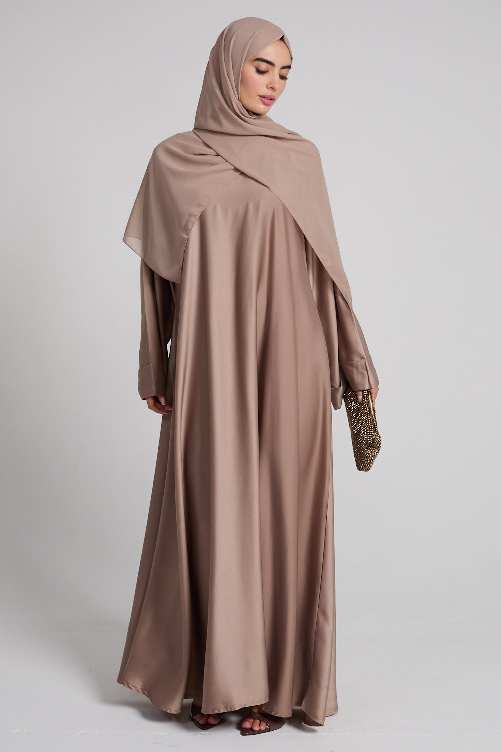 The Premium Luxe Umbrella Cut Closed Abaya – Desert Taupe is a celebration of fluidity, simplicity, and quiet luxury. Tailored from our signature satin-feel premium fabric, it drapes with a natural sheen and falls into a full, sweeping umbrella silhouette that moves beautifully with every step.