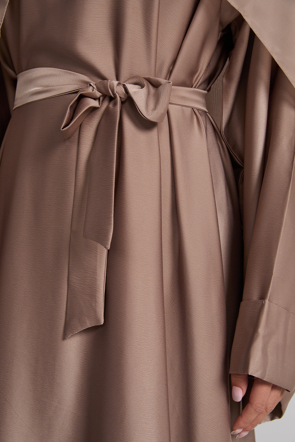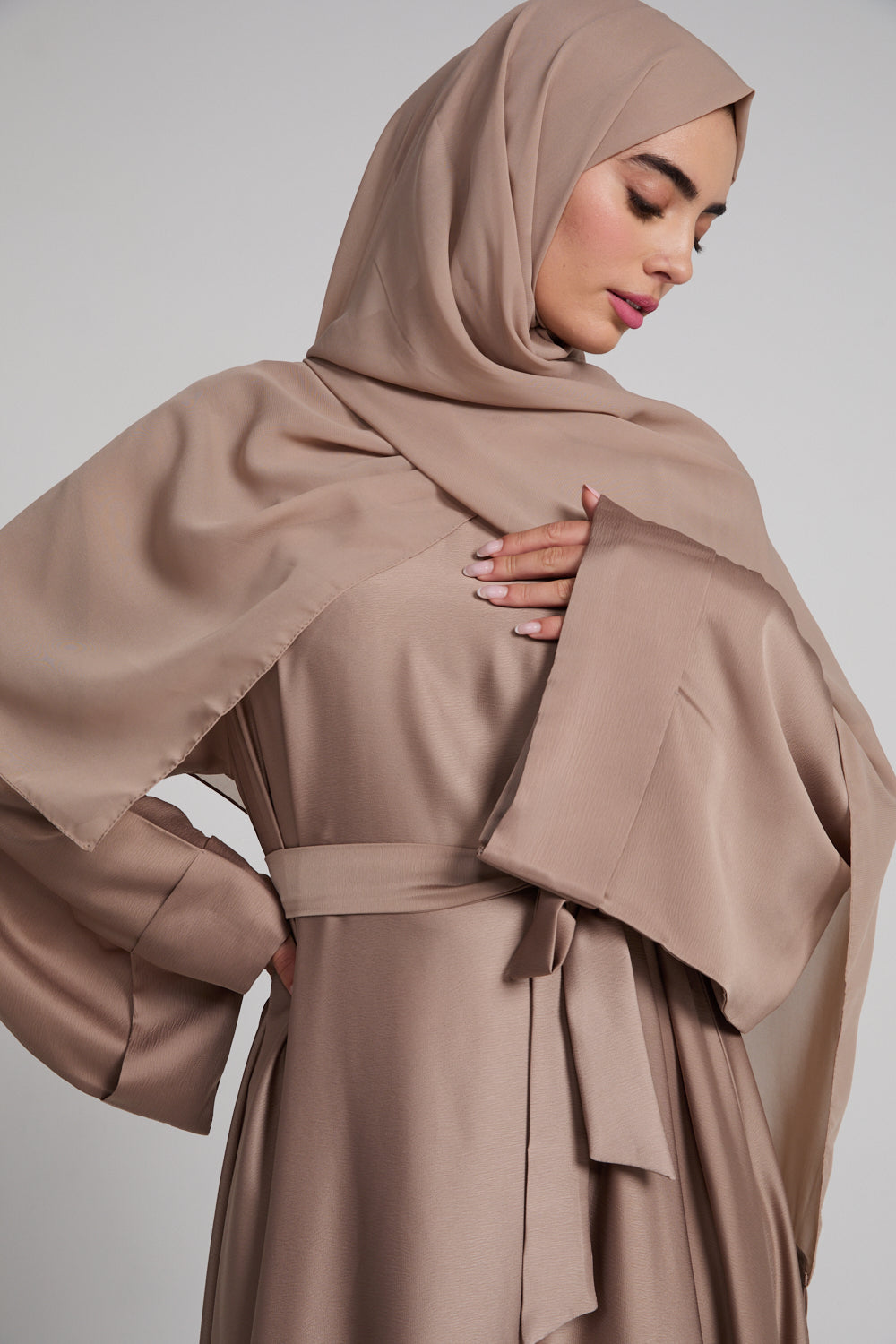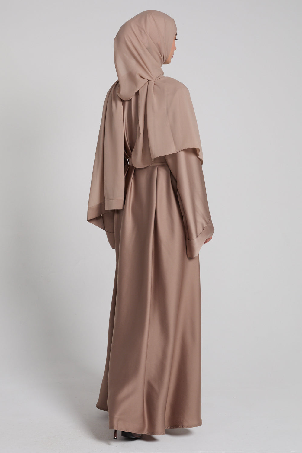 Designed as a closed abaya for ease and modesty, it slips on effortlessly and ties gently at the waist for a personalised fit. The matching hijab completes the look, crafted in the same rich Desert Taupe tone for a perfectly harmonised finish.