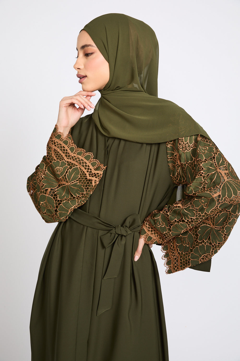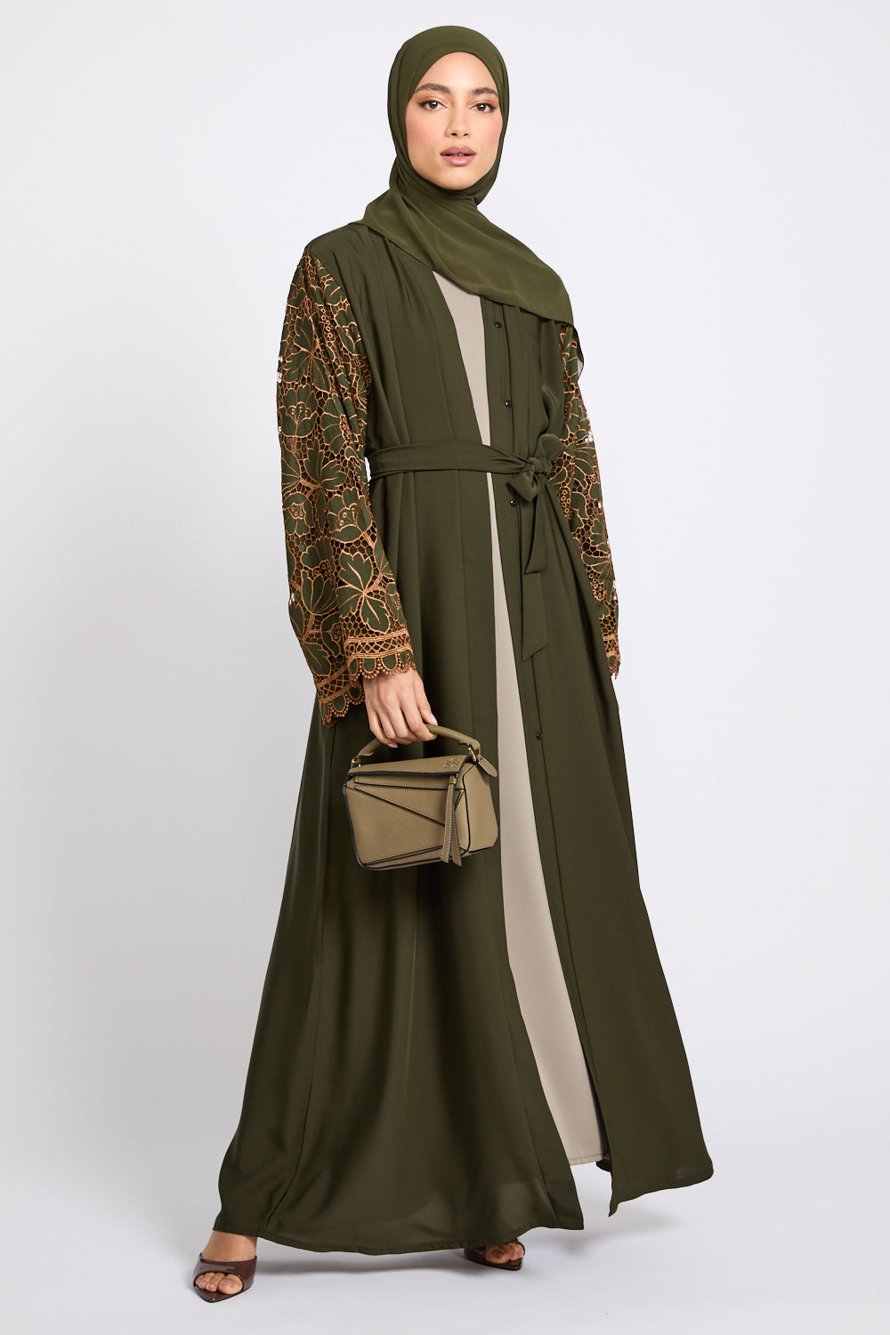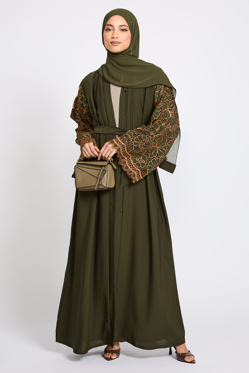 Premium Olive Blossom Lace Detail Open Abaya - LIMITED EDITION