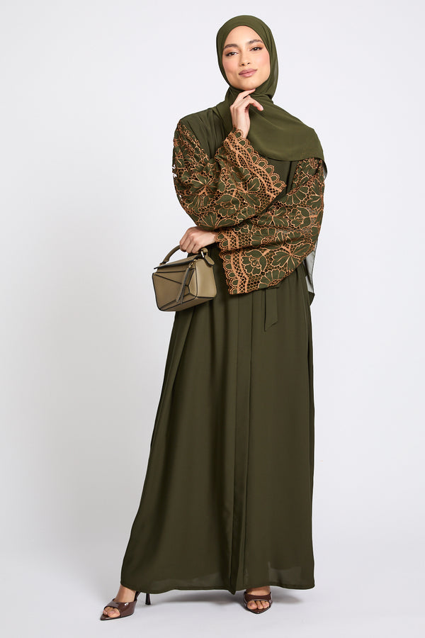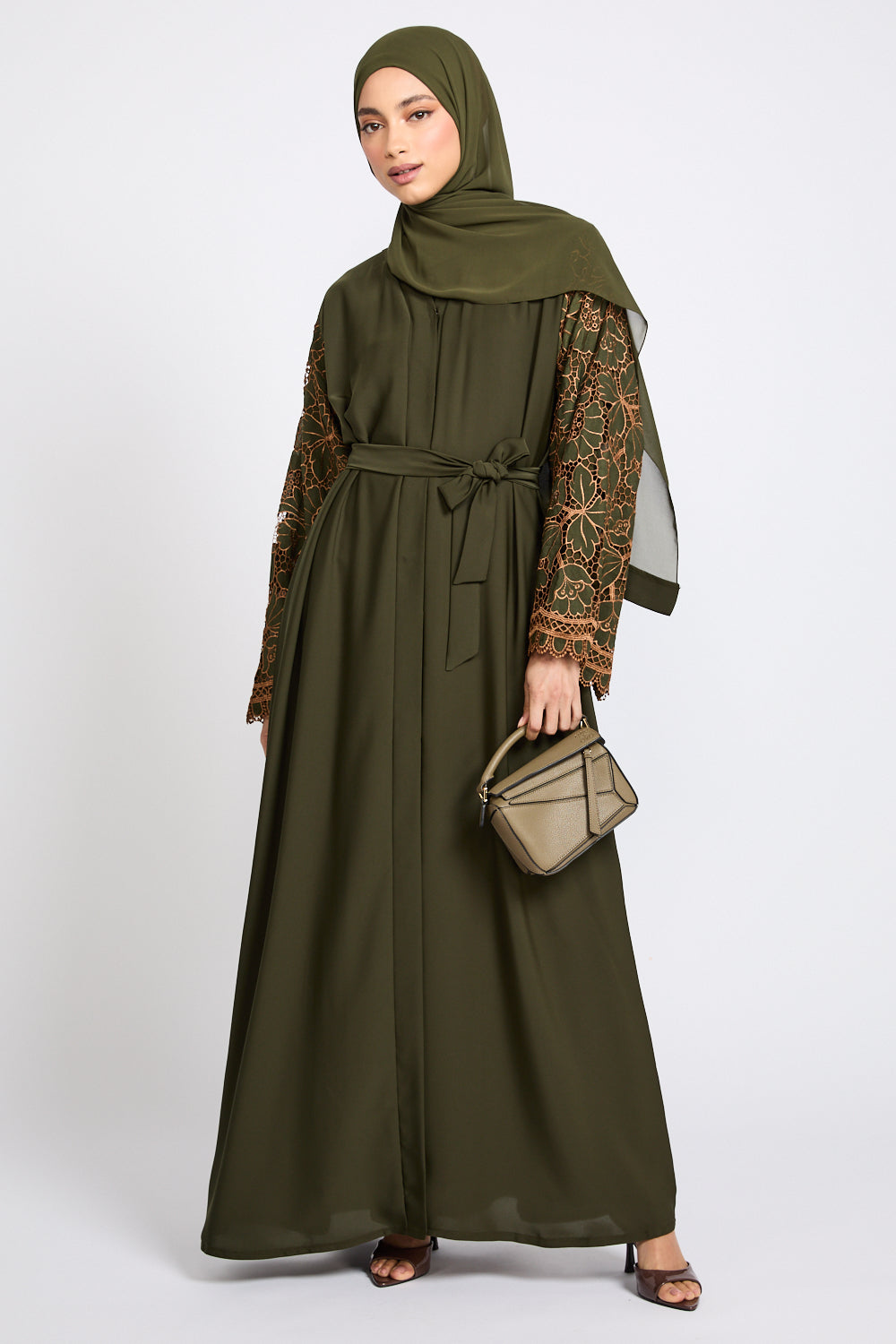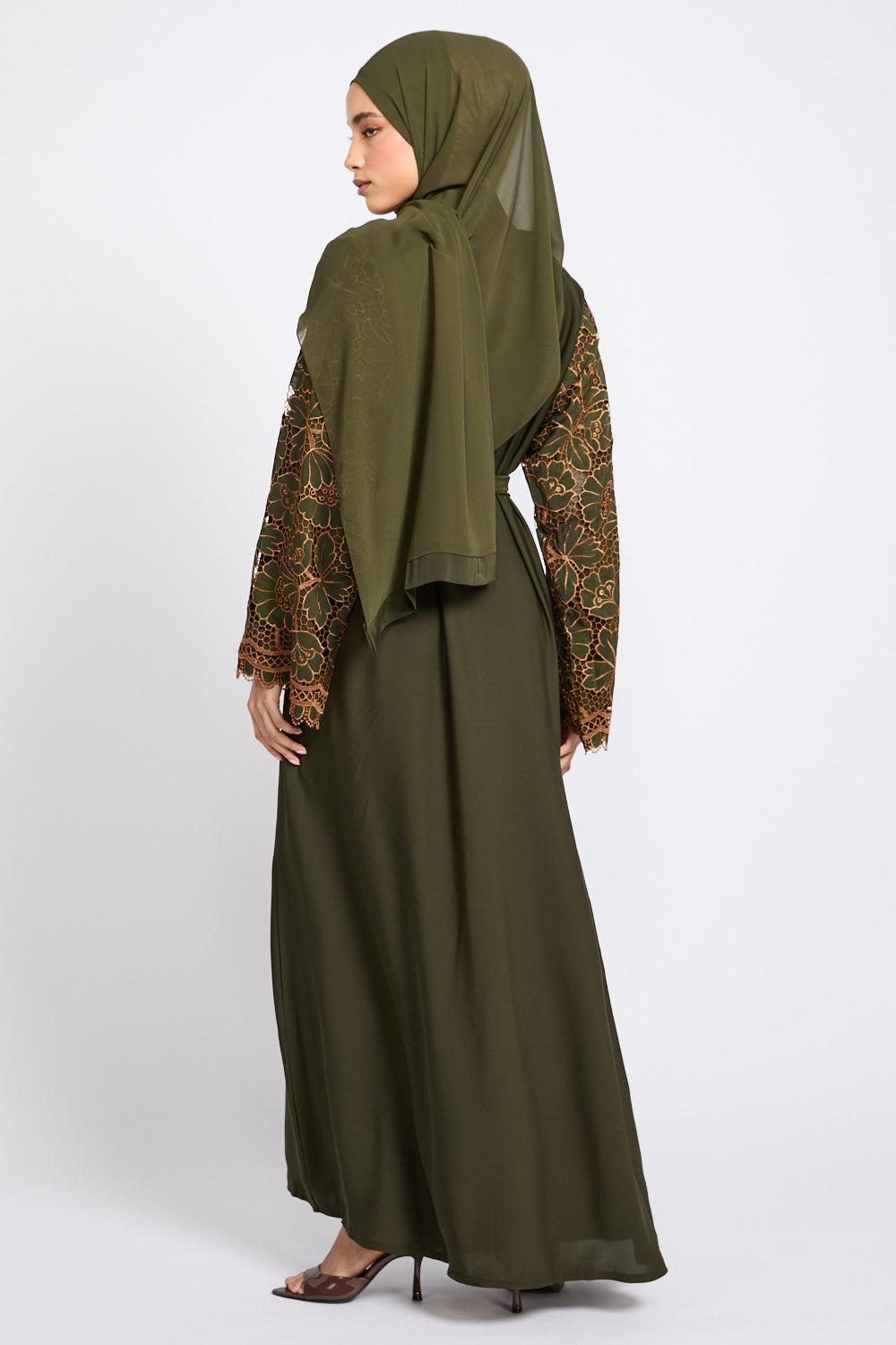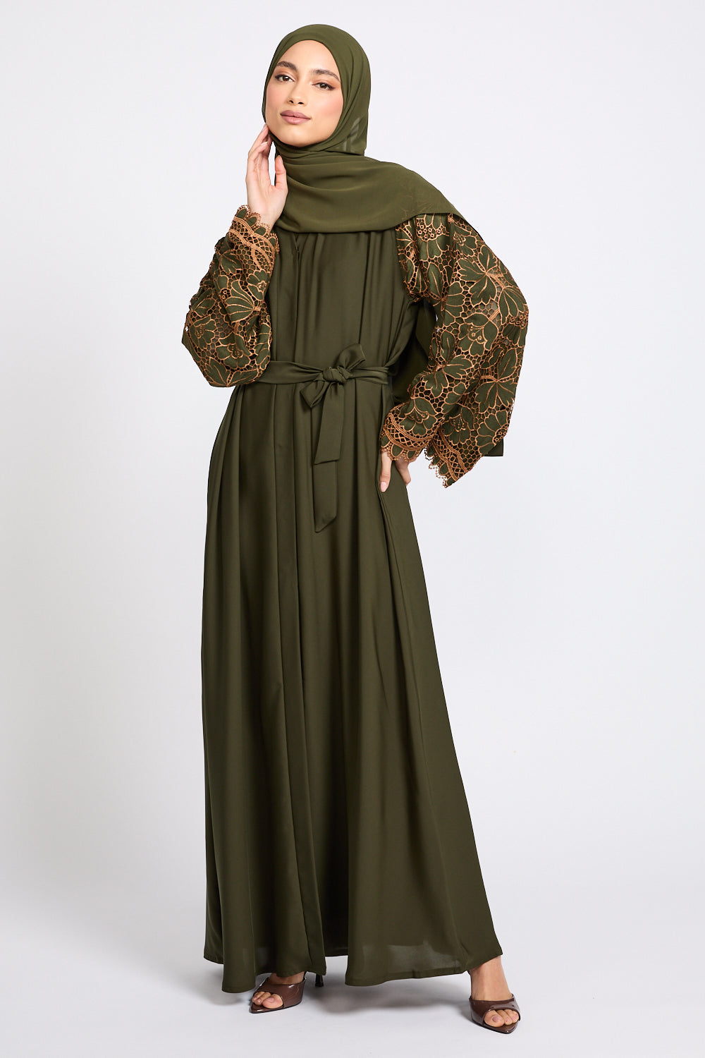 Premium Olive Blossom Lace Detail Open Abaya - LIMITED EDITION
