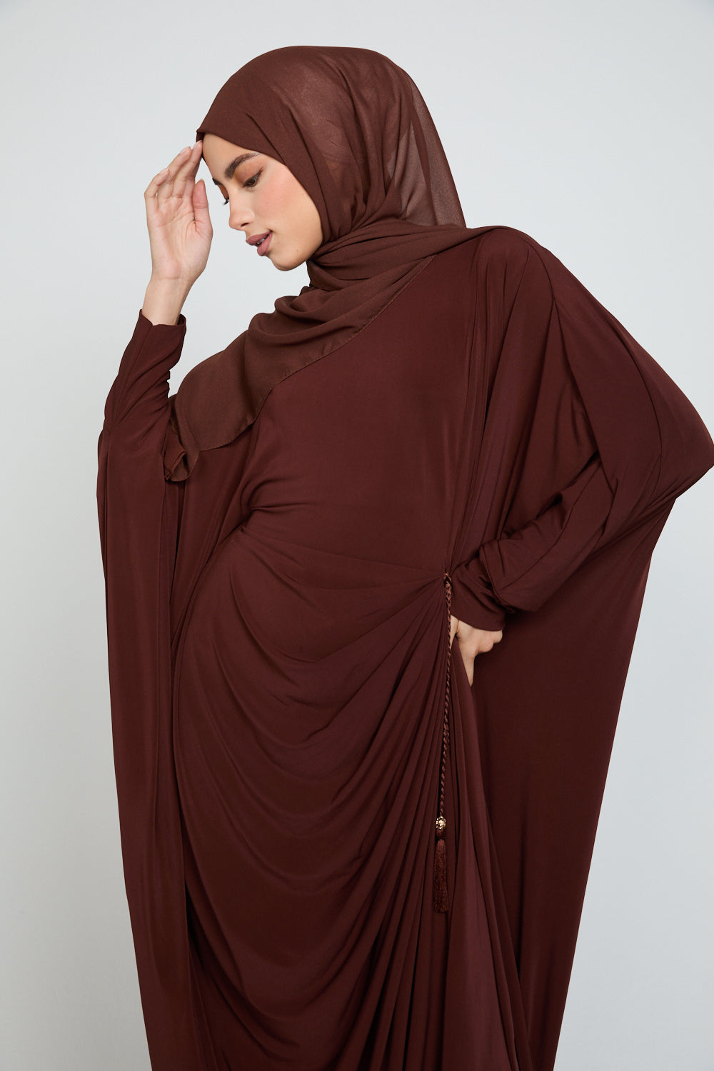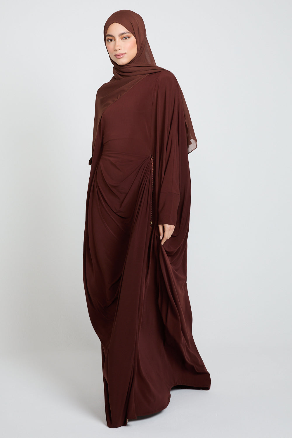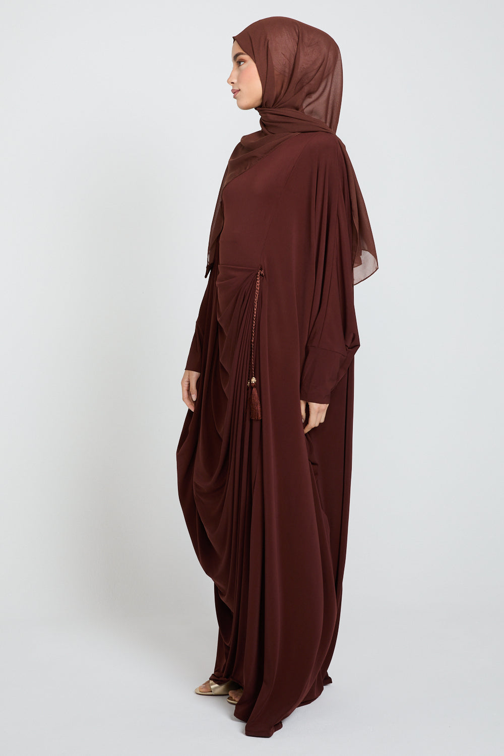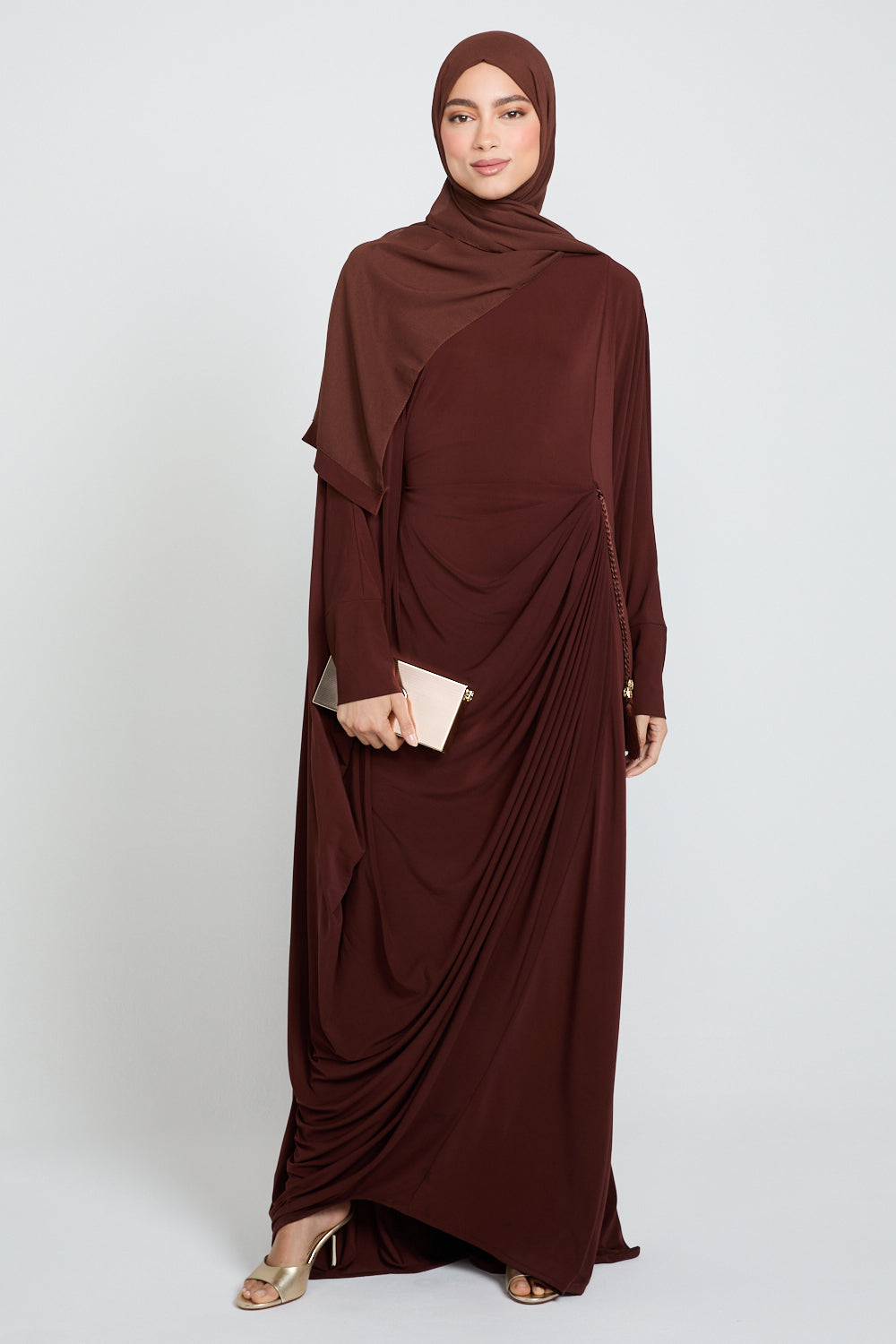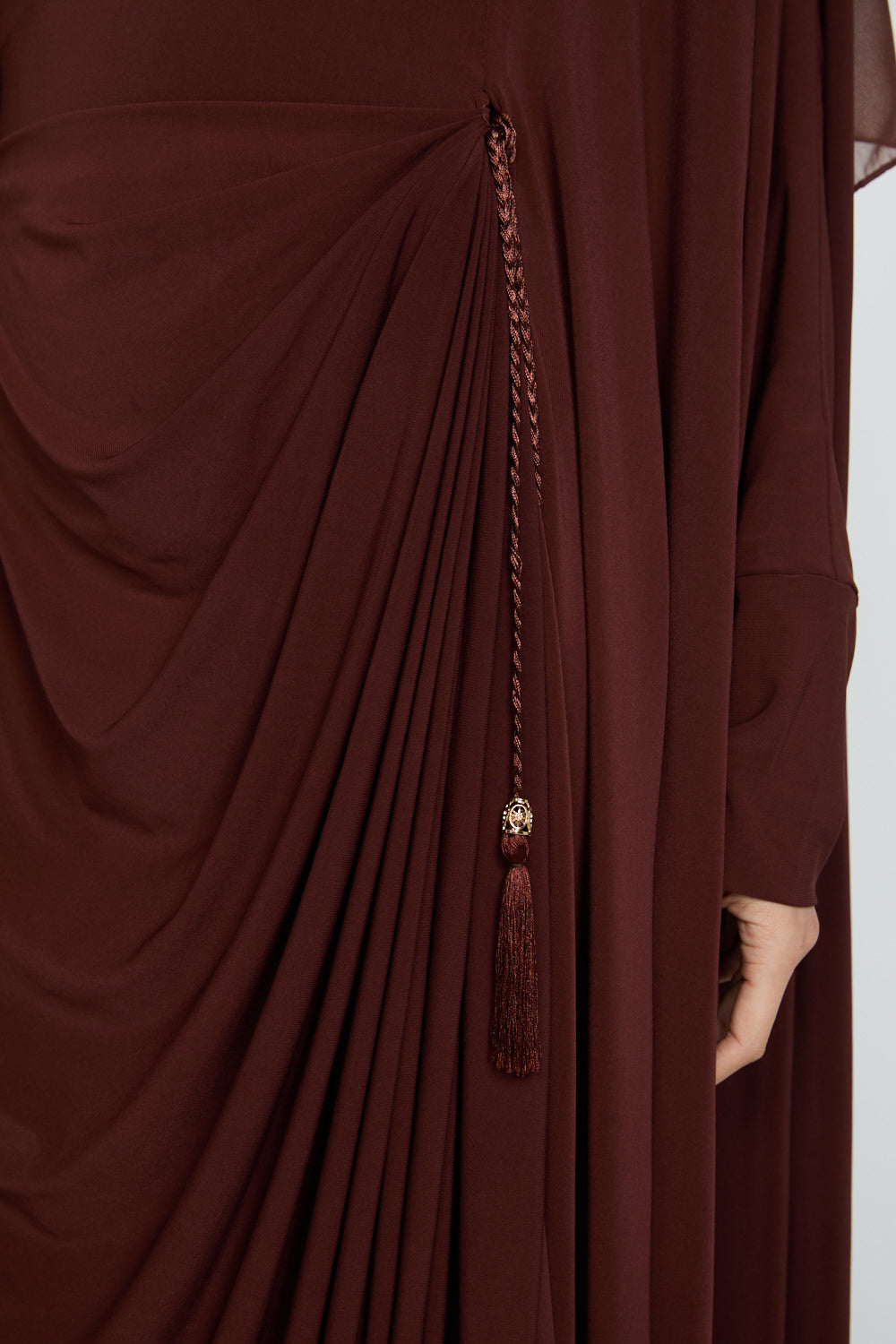 Regal Draped Jersey Abaya With Inner Belt - Mahogany Brown