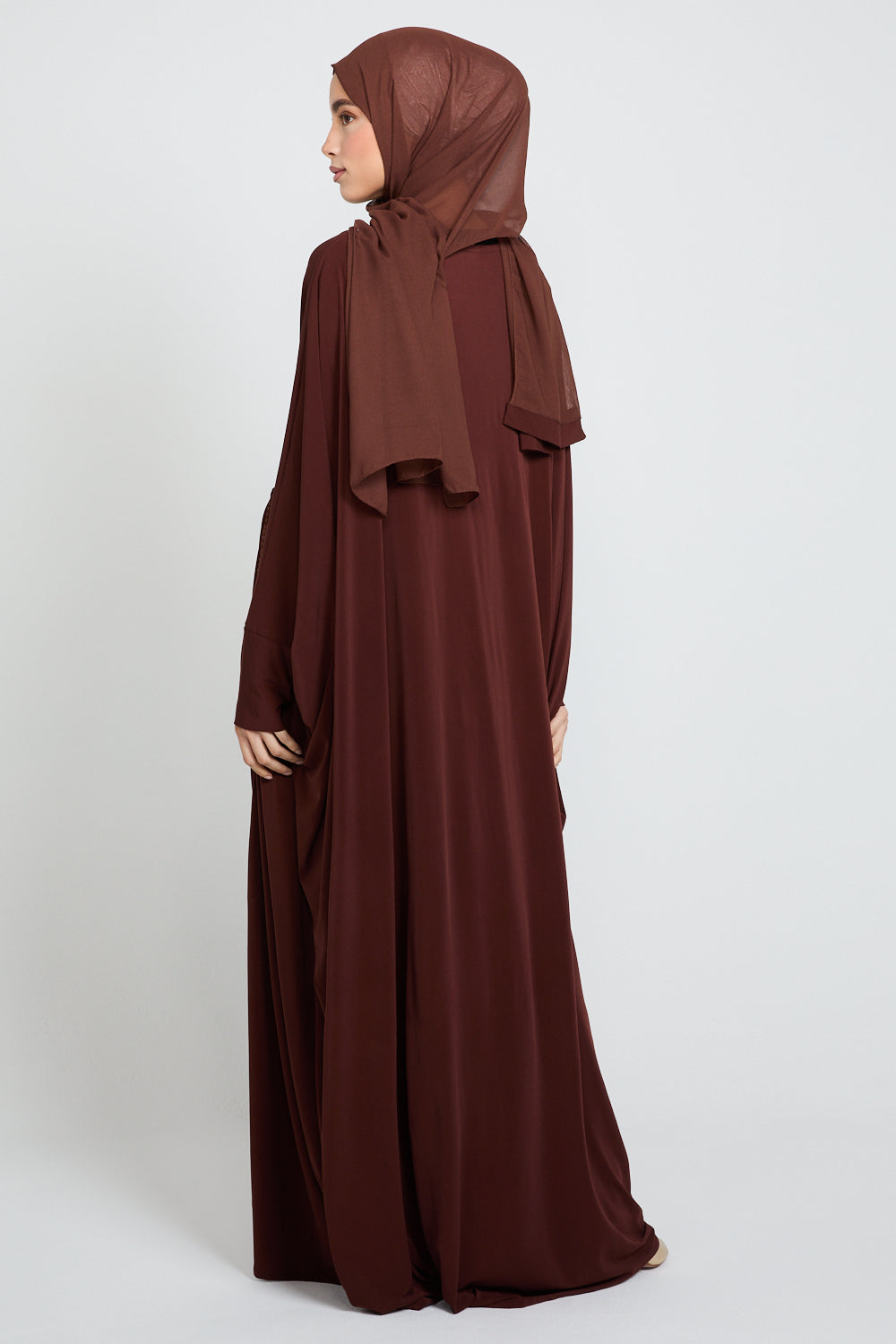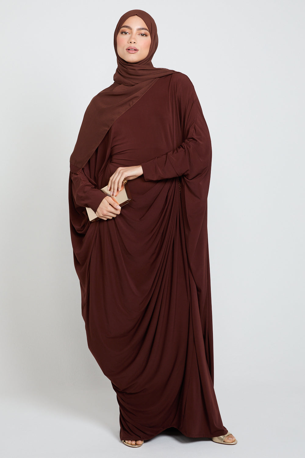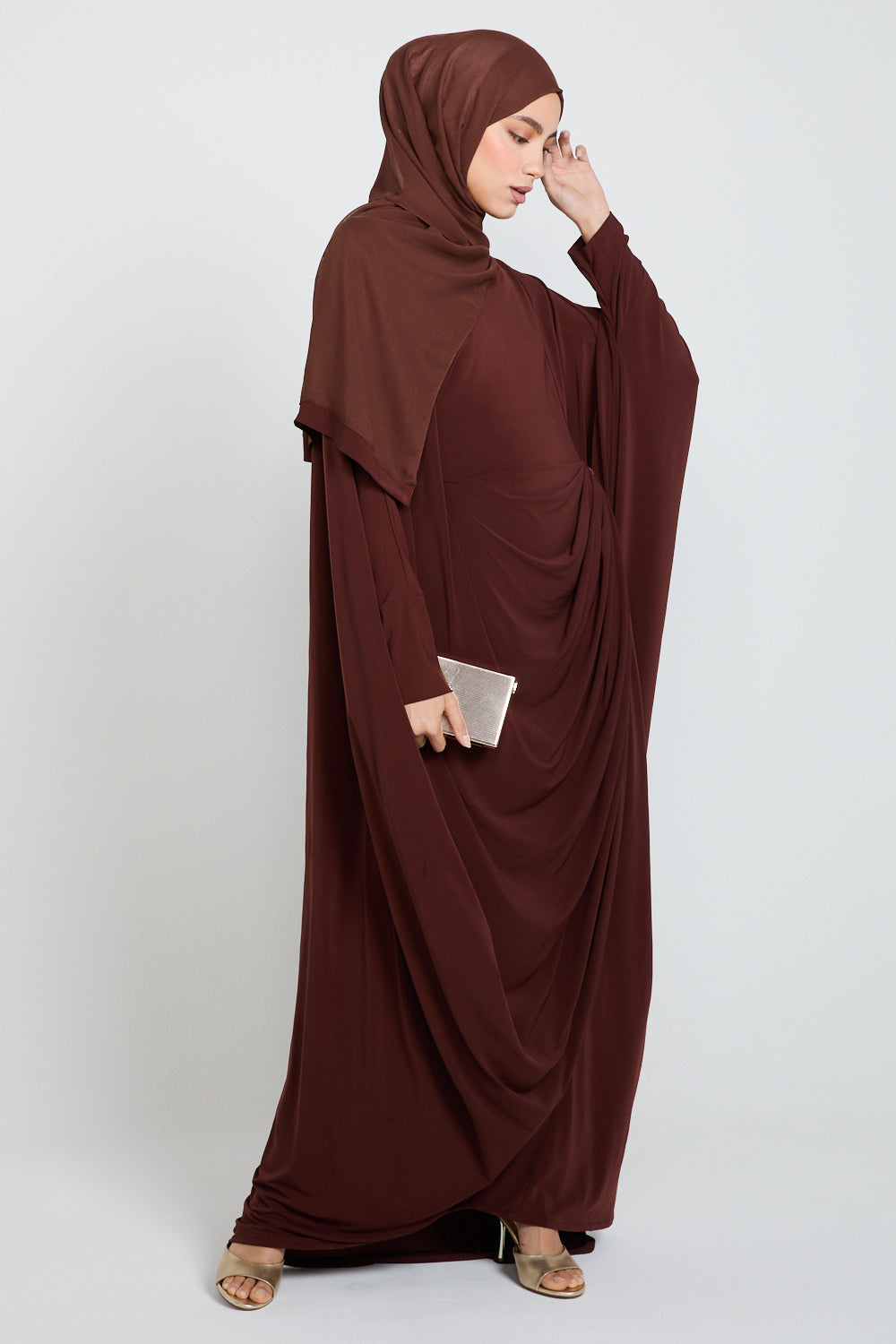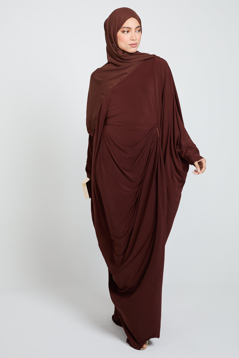The Regal Draped Jersey Abaya in Mahogany Brown is a masterclass in understated luxury, offering a beautifully flowing design that drapes gracefully with every movement. Made from premium jersey fabric, it provides a relaxed and comfortable fit, making it the perfect choice for day-to-day wear or special occasions.