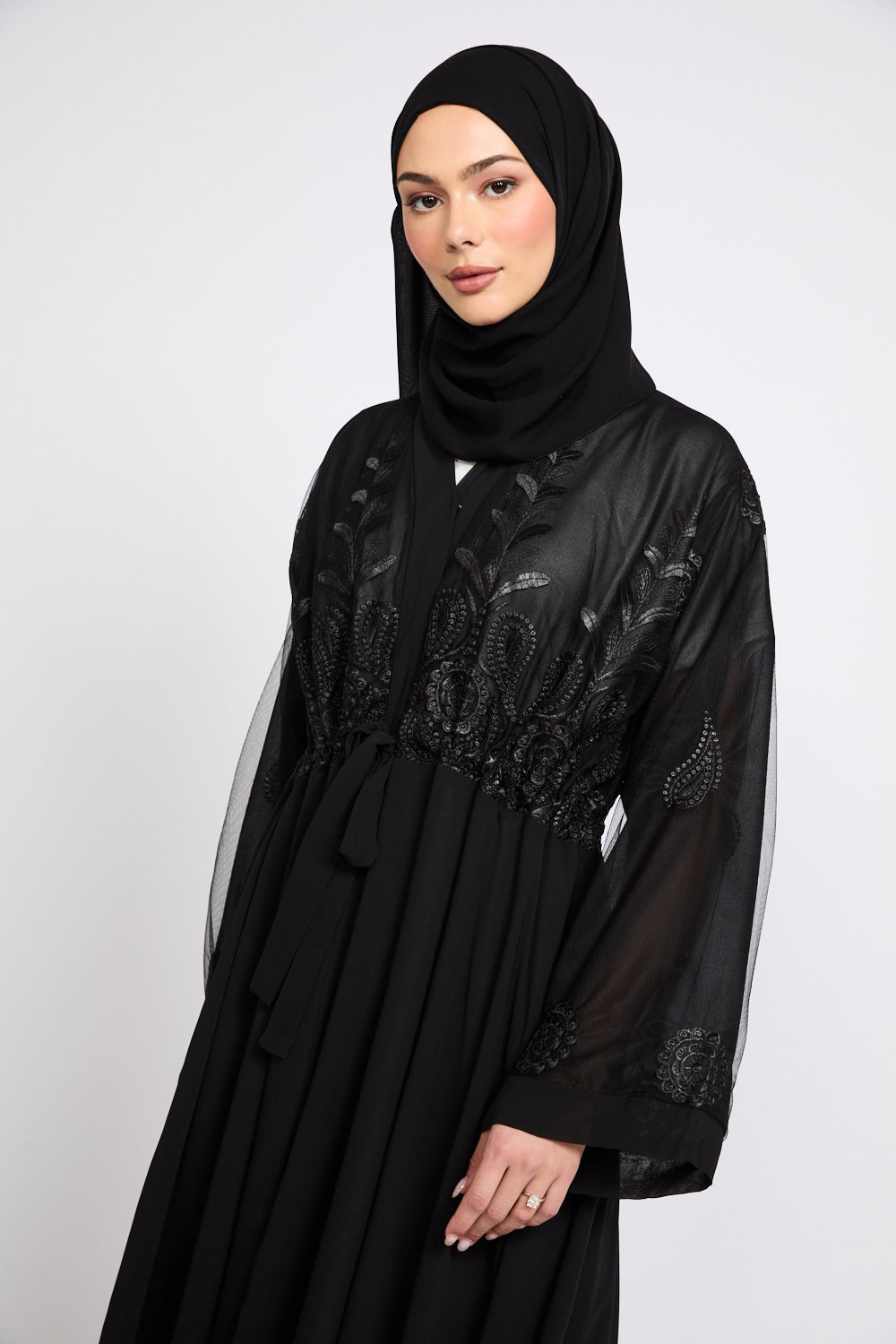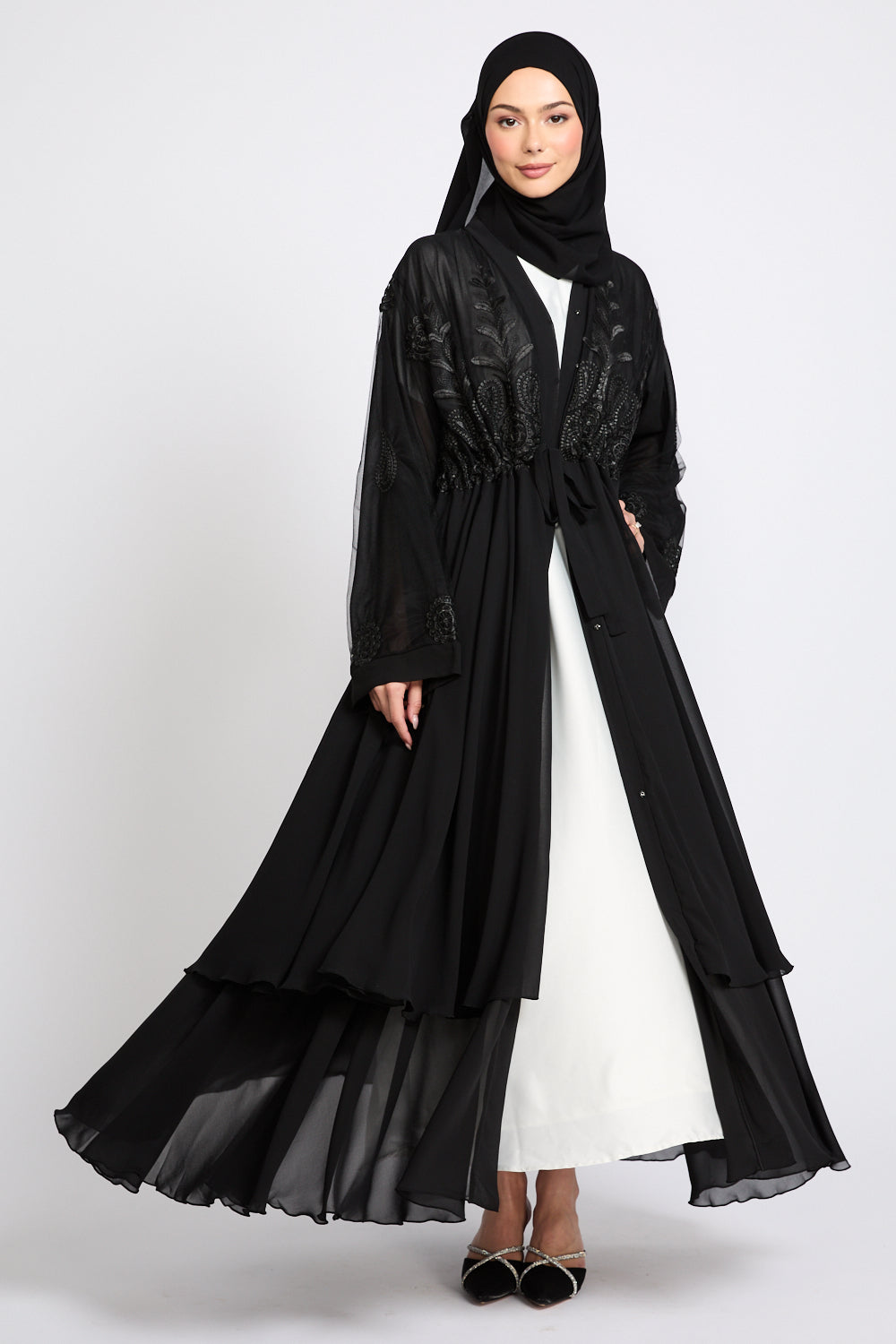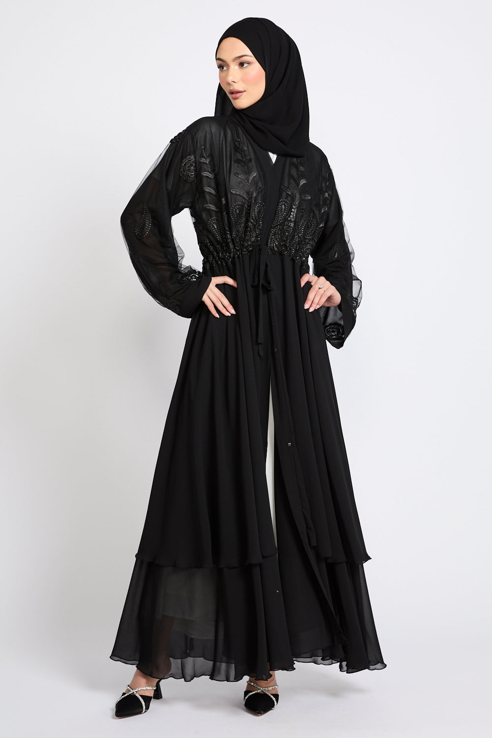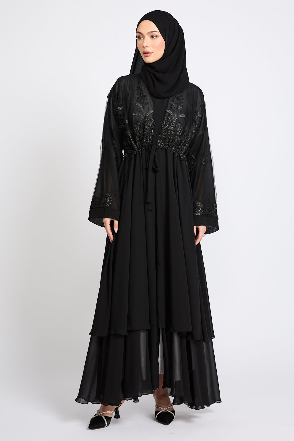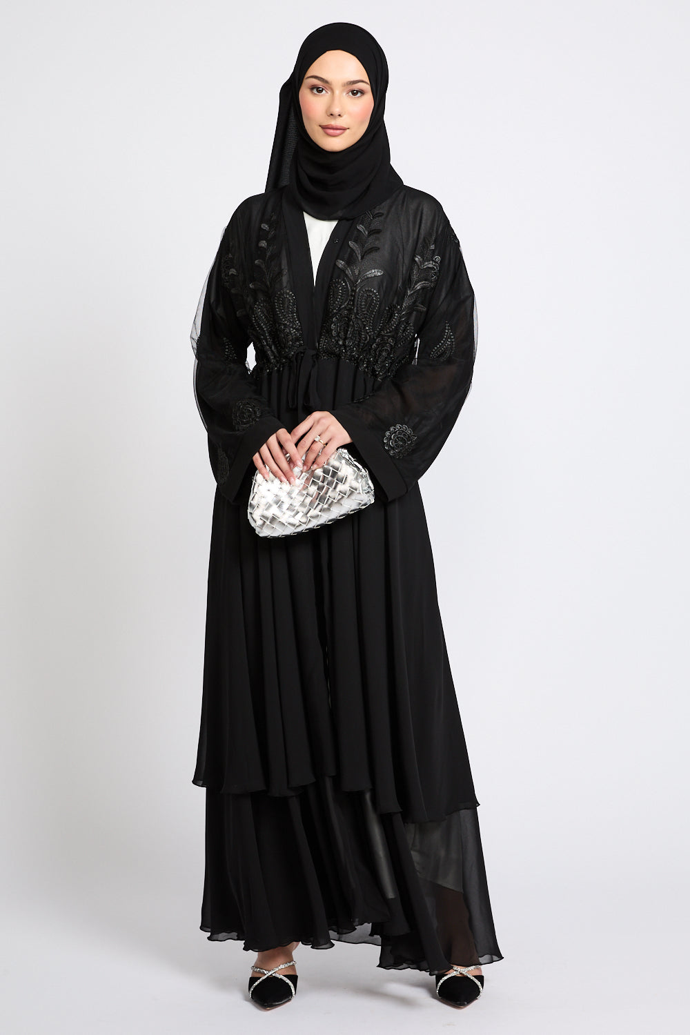 Introducing the Black Floral Lace Chiffon Layered Open Abaya, a stunning blend of delicate design and refined elegance. Crafted from lightweight chiffon, this abaya features two flowing layers that create a graceful silhouette with every step. The top half is adorned with floral lace, adding a touch of sophistication and texture, while the open cut offers versatility in styling.