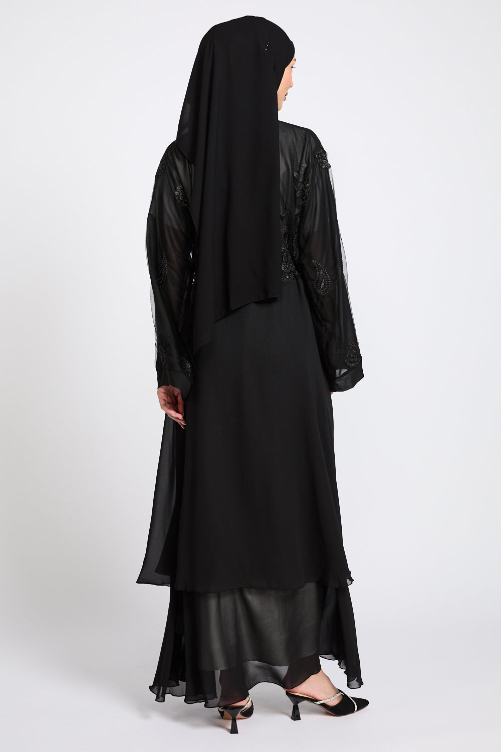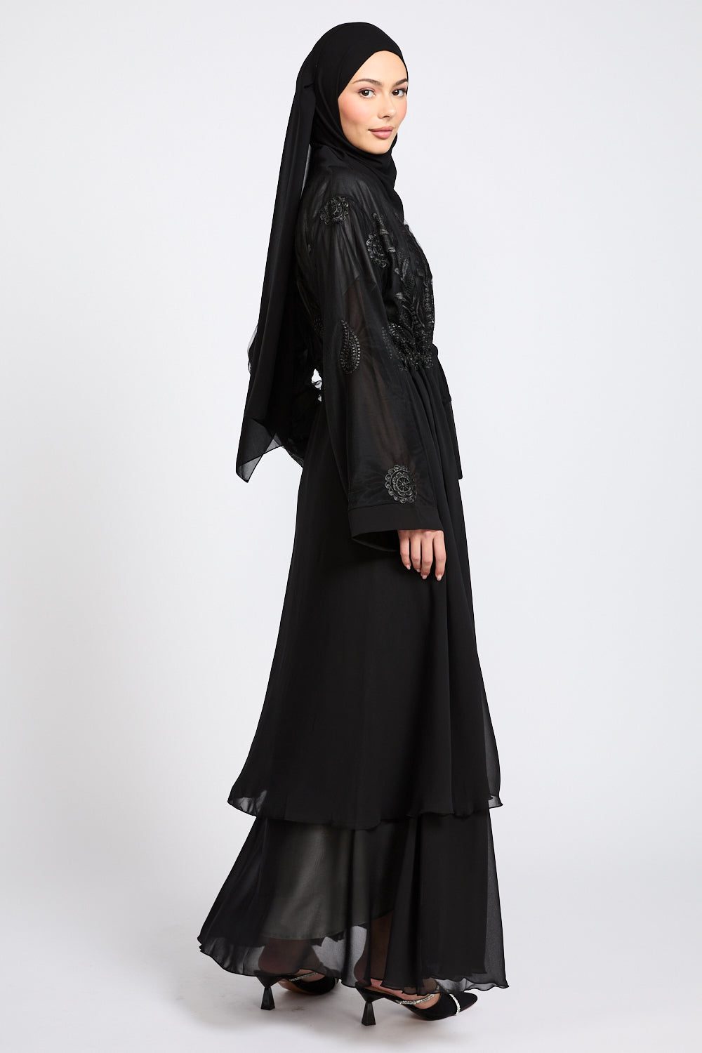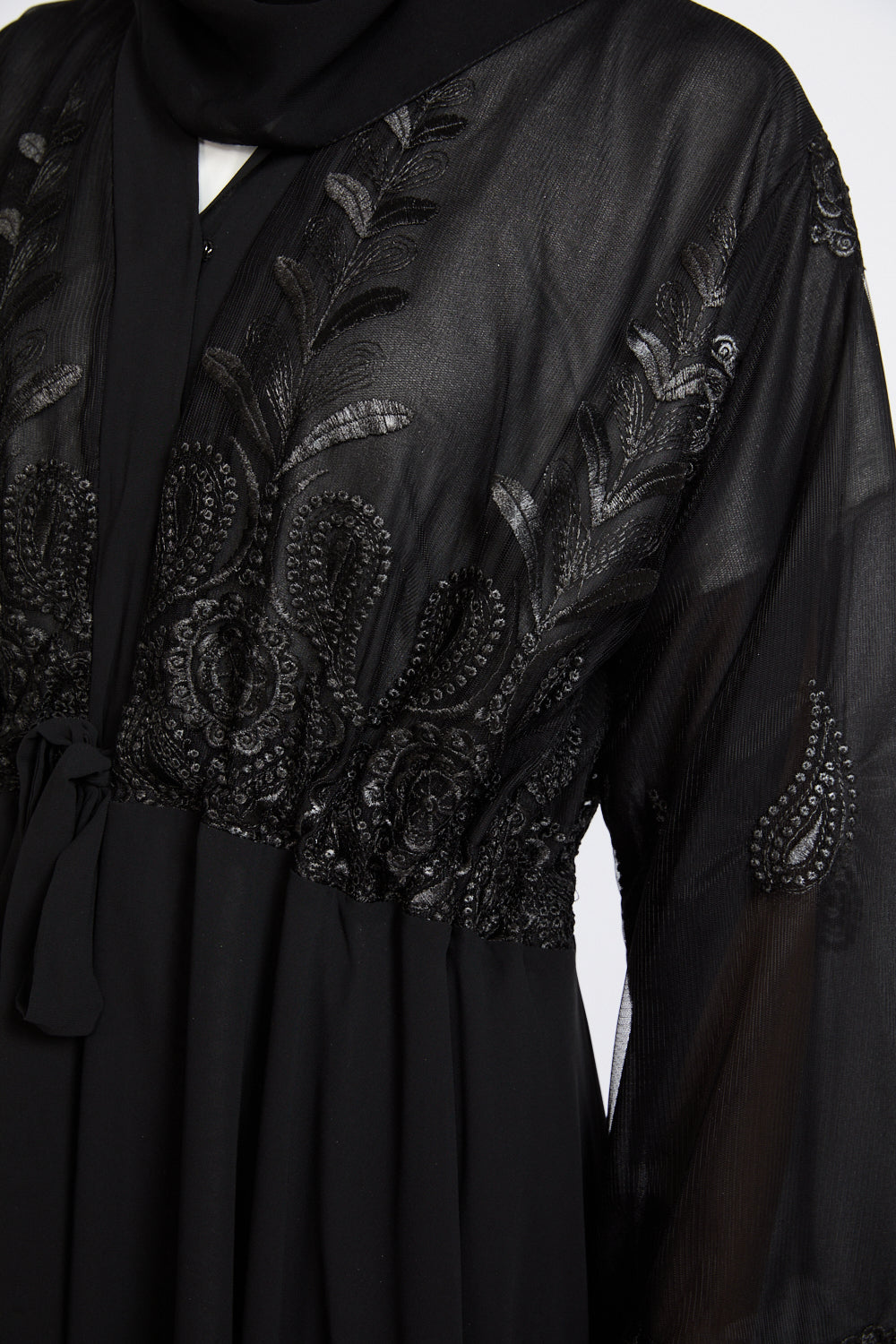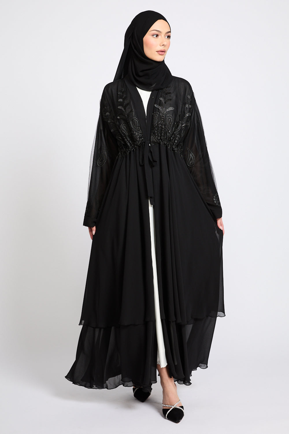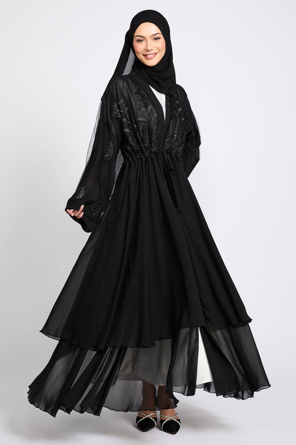 Introducing the Black Floral Lace Chiffon Layered Open Abaya, a stunning blend of delicate design and refined elegance. Crafted from lightweight chiffon, this abaya features two flowing layers that create a graceful silhouette with every step. The top half is adorned with floral lace, adding a touch of sophistication and texture, while the open cut offers versatility in styling.