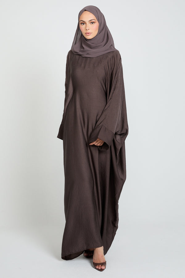 Embrace timeless simplicity with the Classic Soft Sheen Closed Abaya in Smoky Coffee Bean — a refined essential crafted for both everyday wear and special occasions.