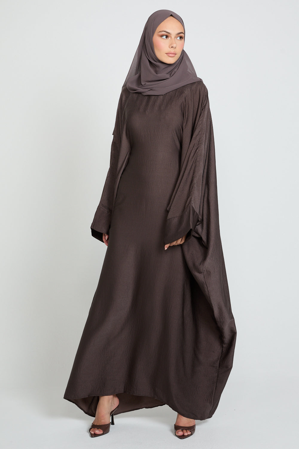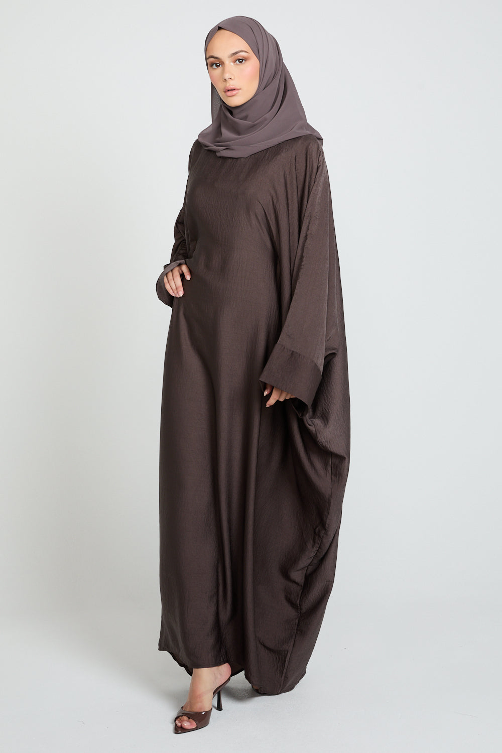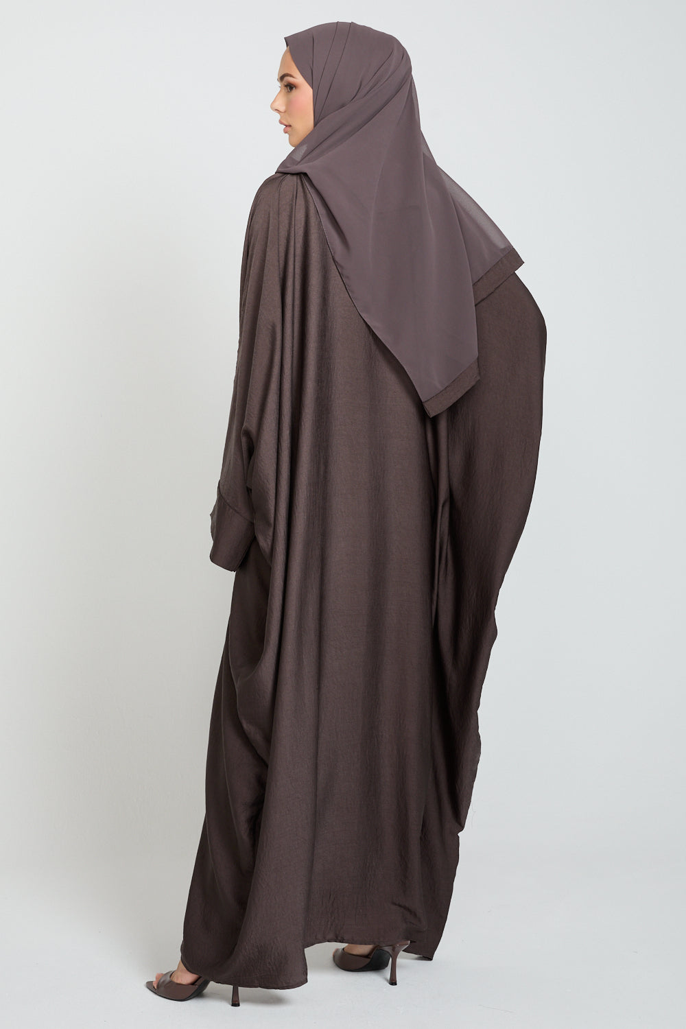 Finished with plain cuffs and a minimal aesthetic, its rich smoky coffee bean tone brings warm sophistication to any wardrobe — versatile, modest, and effortlessly graceful.
