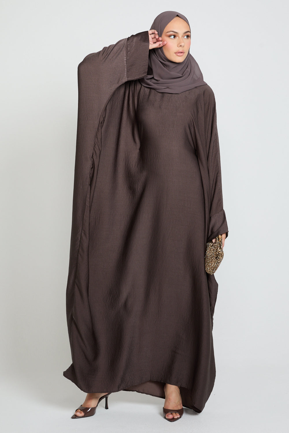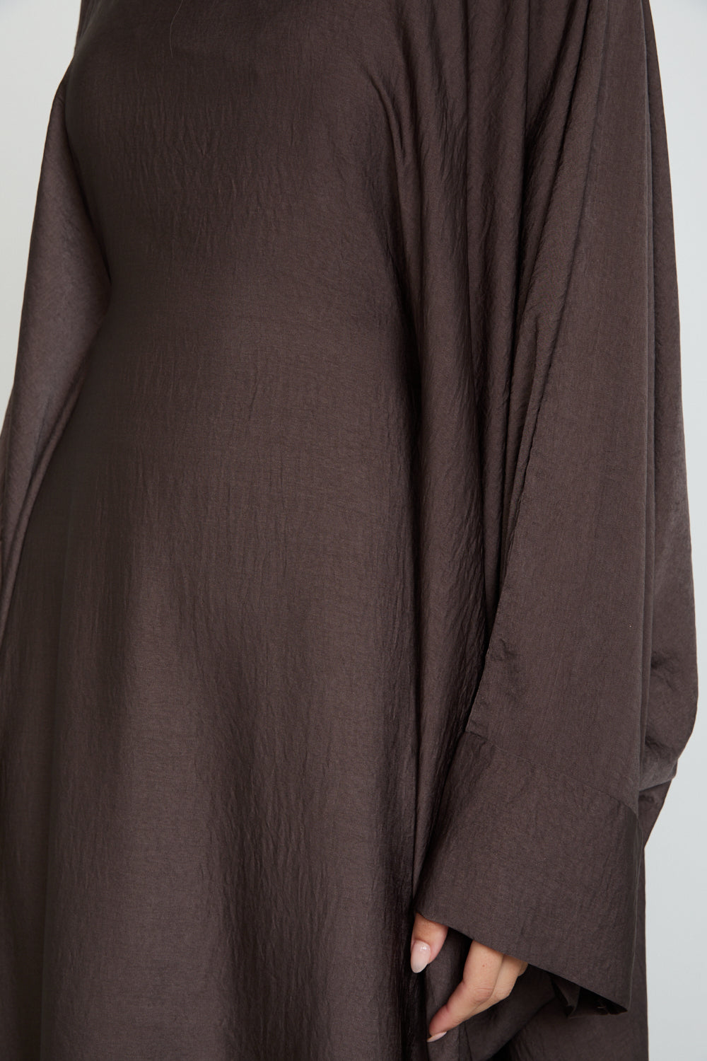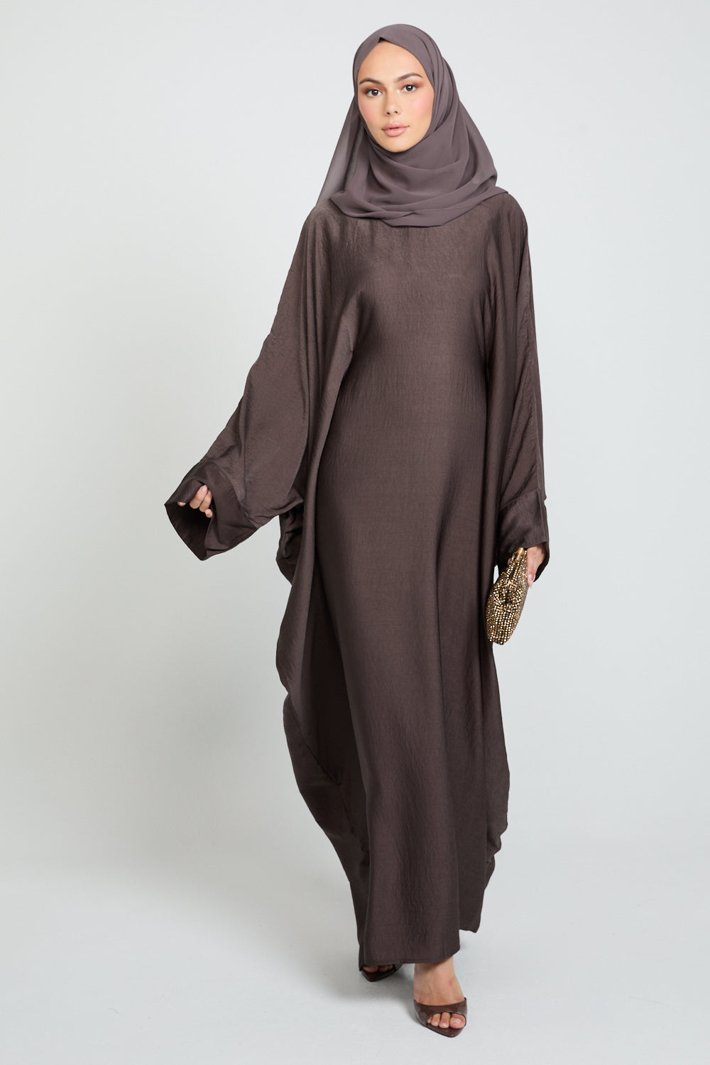 Finished with plain cuffs and a minimal aesthetic, its rich smoky coffee bean tone brings warm sophistication to any wardrobe — versatile, modest, and effortlessly graceful.