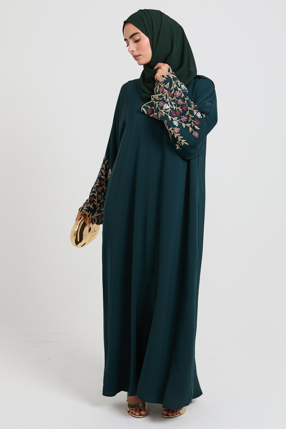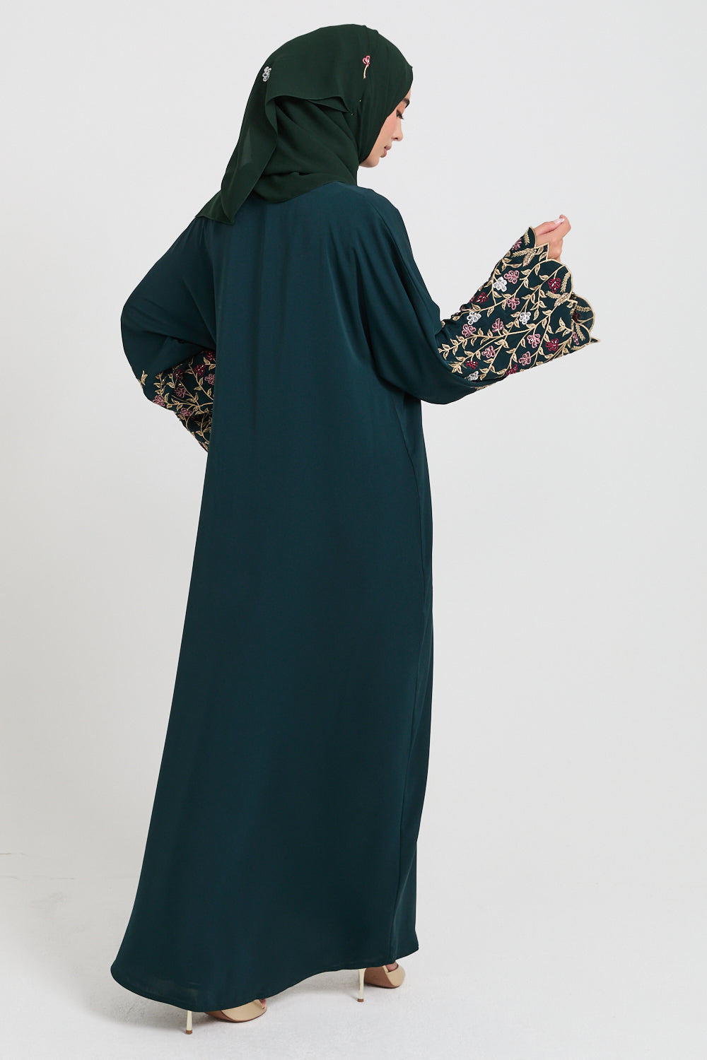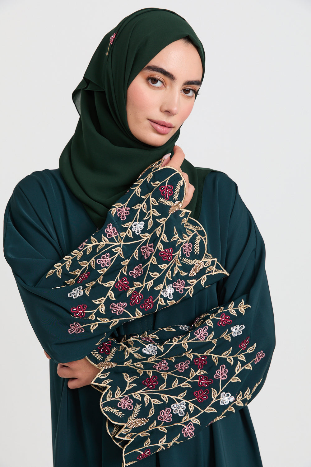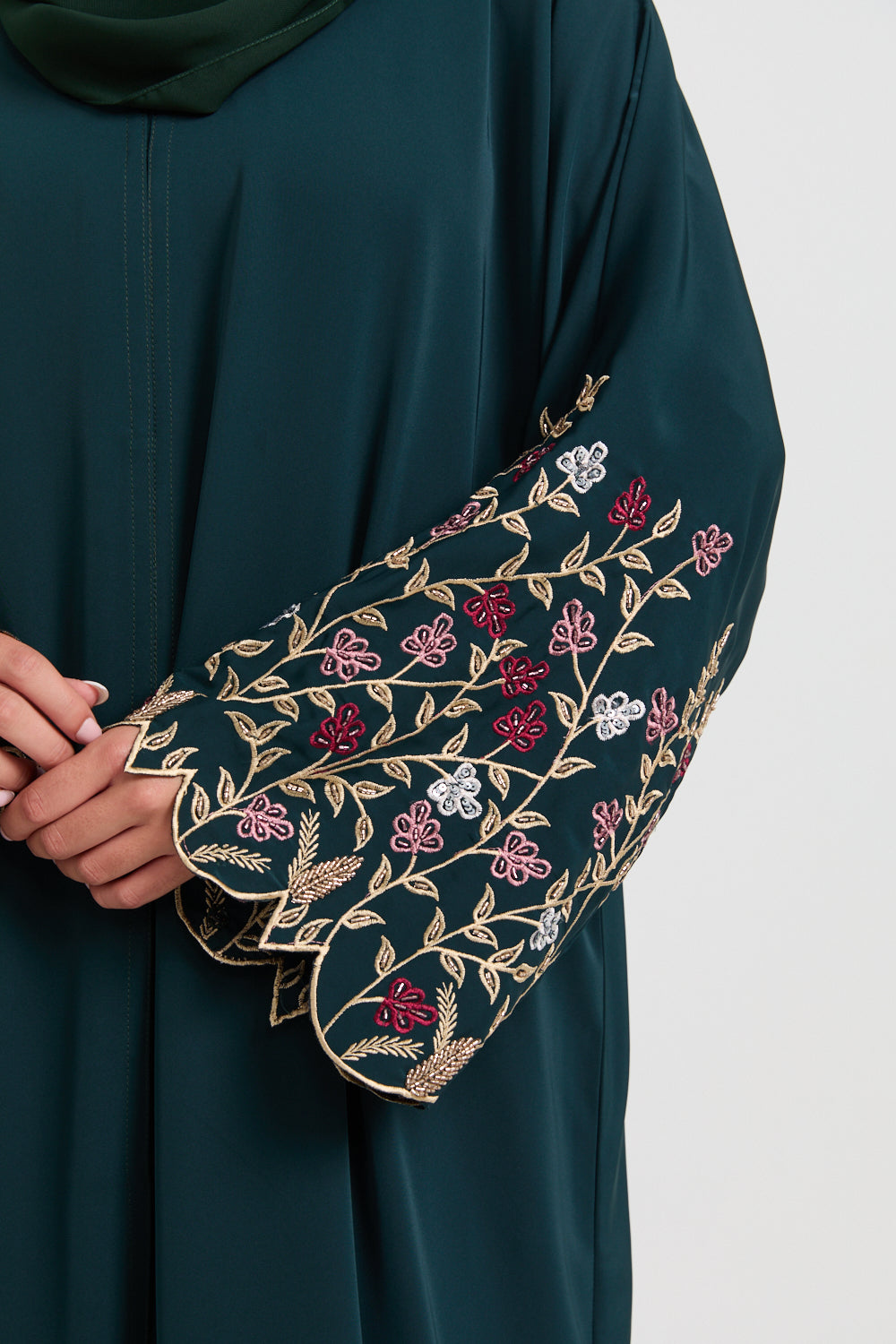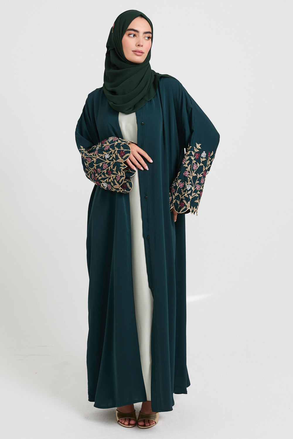 The Emerald Bloom Open Embroidered Abaya is a graceful fusion of classic modest wear and artistic detailing. Crafted in a rich emerald green hue, its flowing silhouette is elevated by the beautifully embroidered flared cuffs, adorned with intricate gold vines and delicate berry-toned blooms that add a touch of vibrant charm.