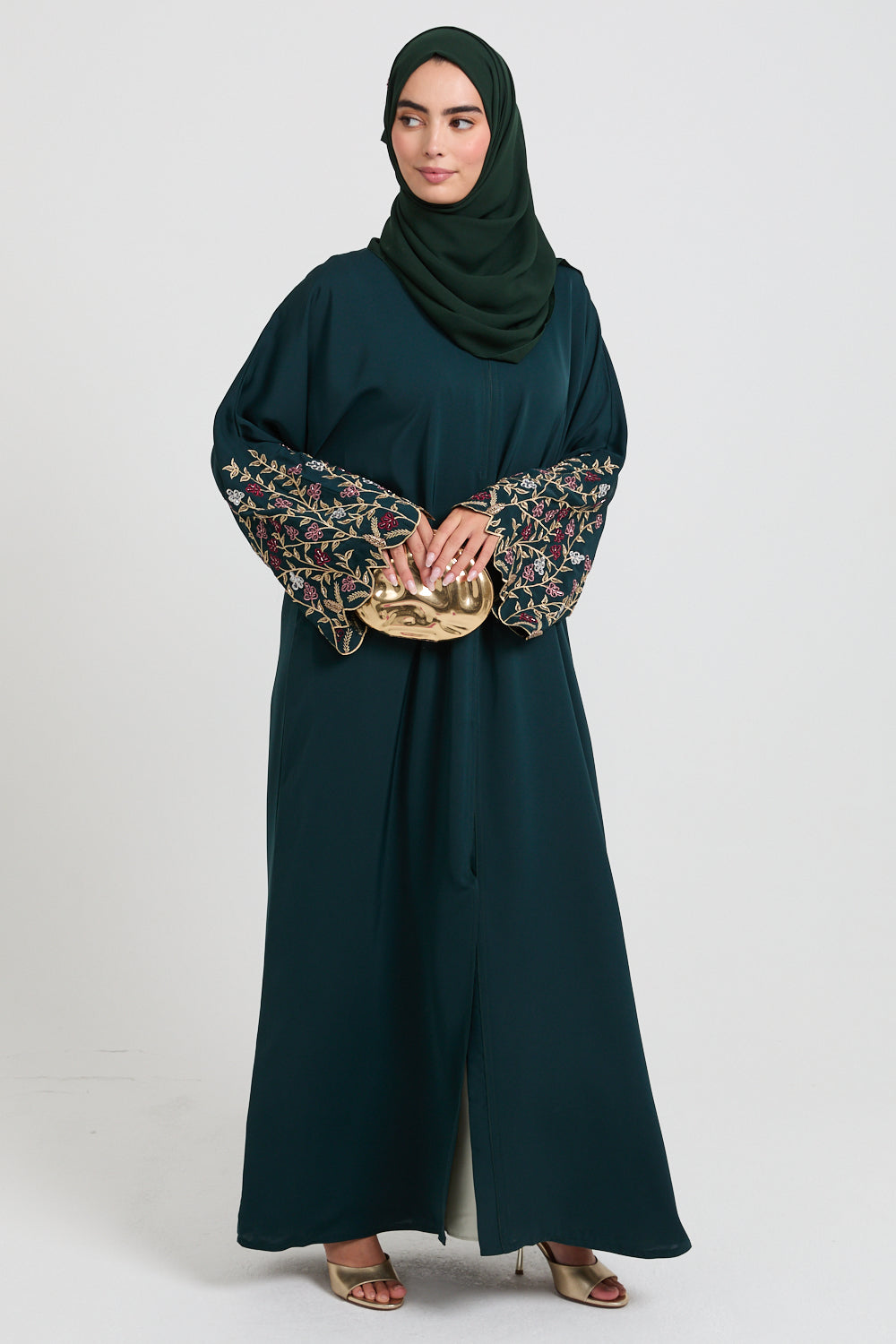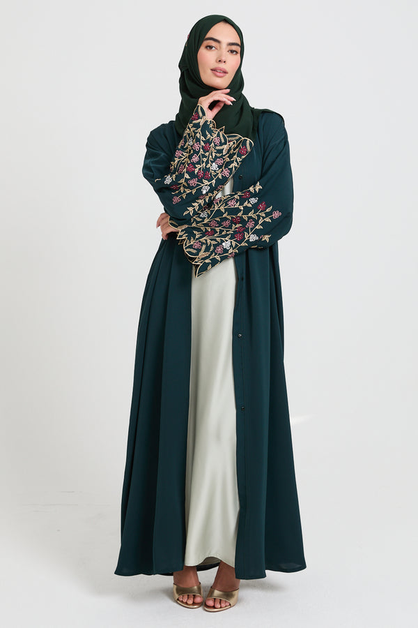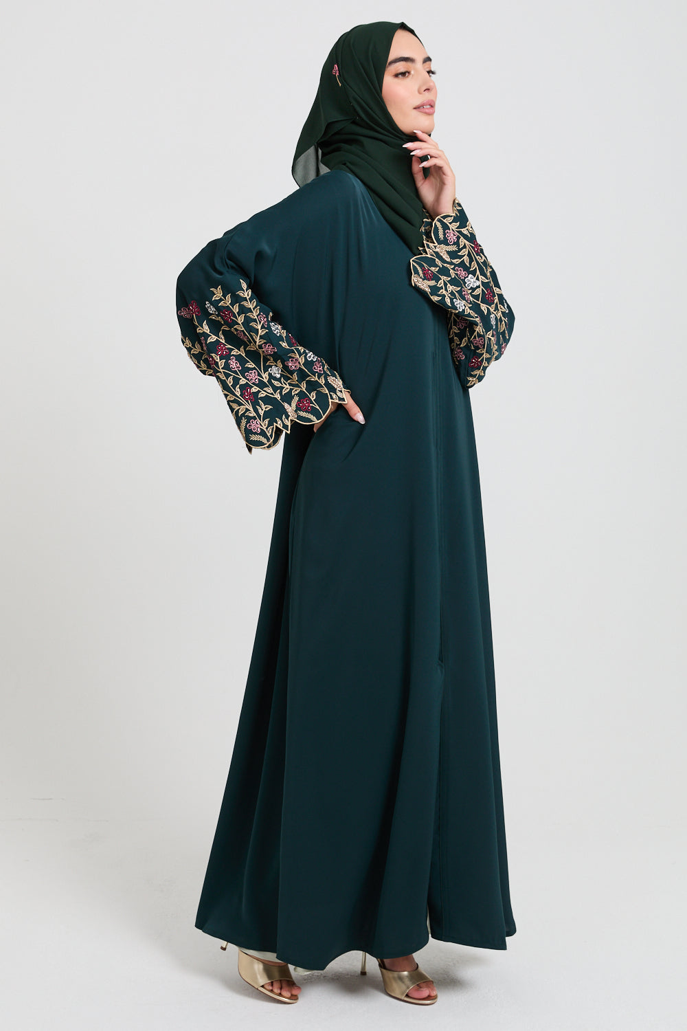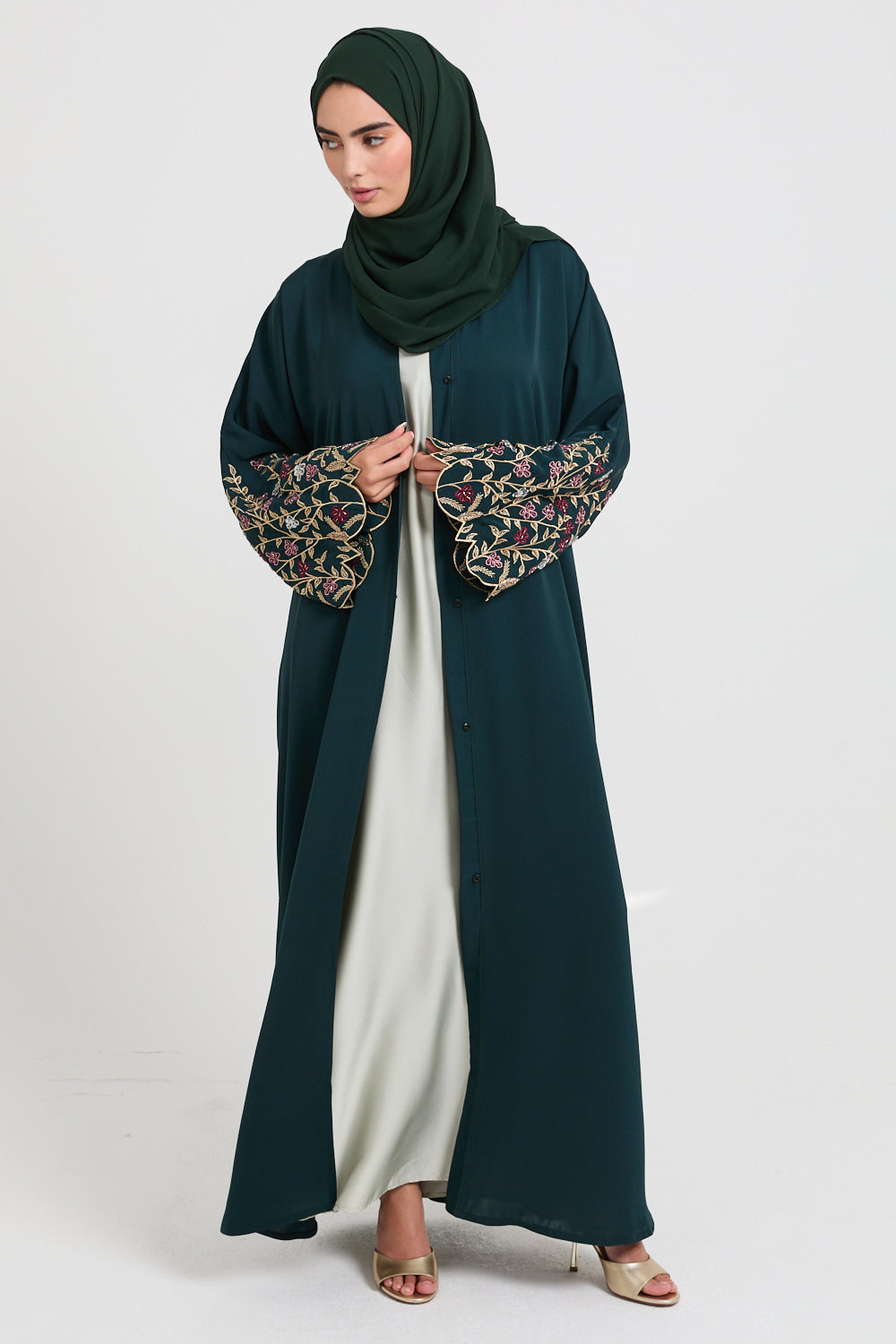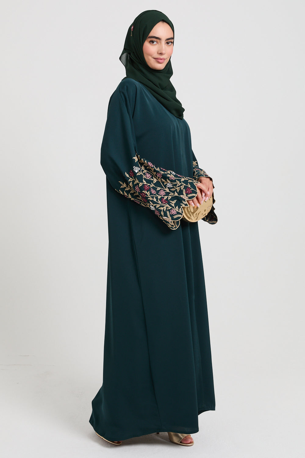 The Emerald Bloom Open Embroidered Abaya is a graceful fusion of classic modest wear and artistic detailing. Crafted in a rich emerald green hue, its flowing silhouette is elevated by the beautifully embroidered flared cuffs, adorned with intricate gold vines and delicate berry-toned blooms that add a touch of vibrant charm.