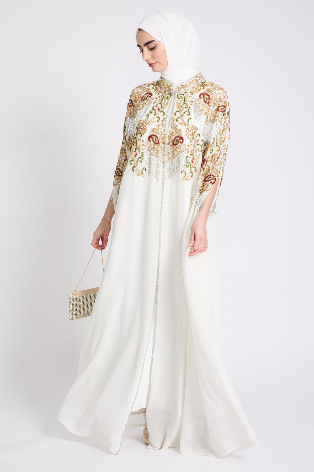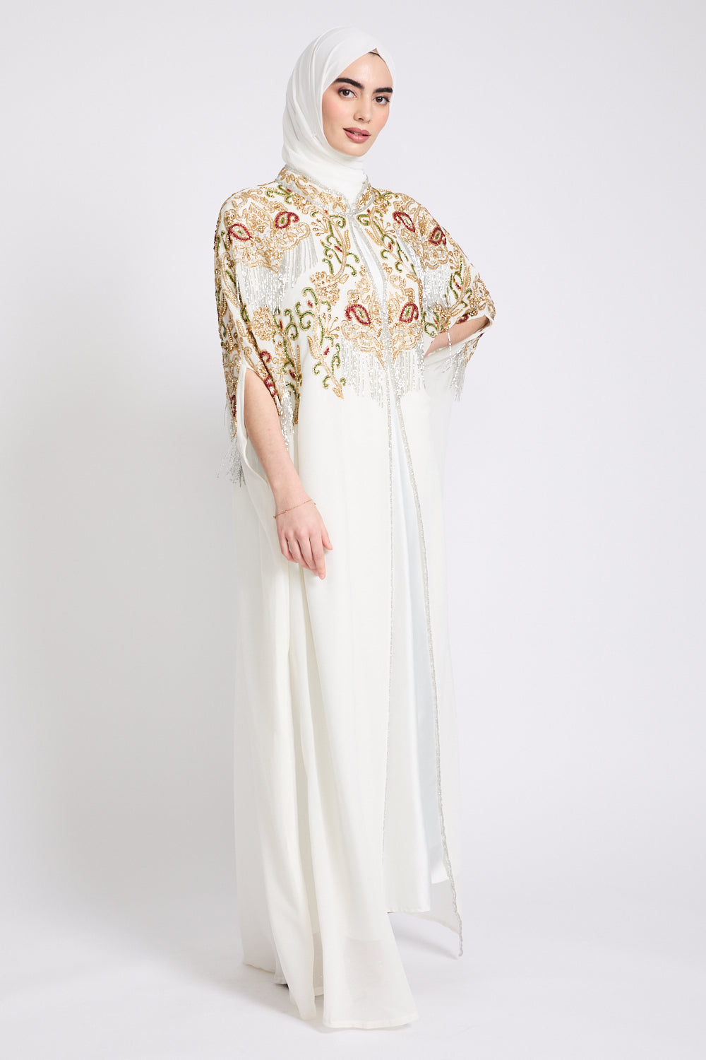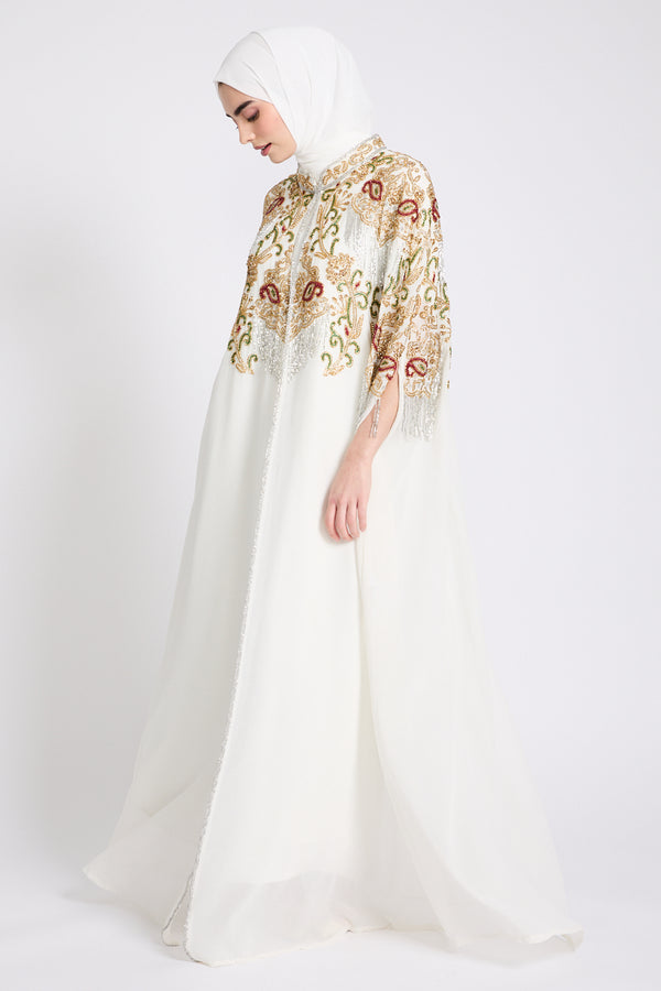 In a gentle off-white tone, this cape offers a clean, timeless look with a sense of calm sophistication. The fabric drapes effortlessly, providing a fluid silhouette that moves naturally with you. Hand-stitched embellishments adorn the front and back, inspired by regal designs and applied with care for a refined yet subtle finish.