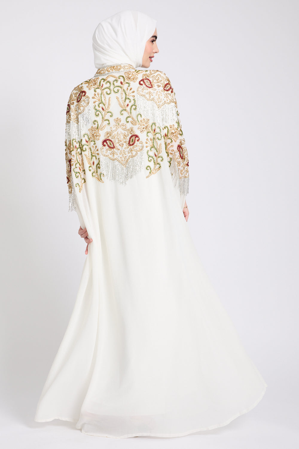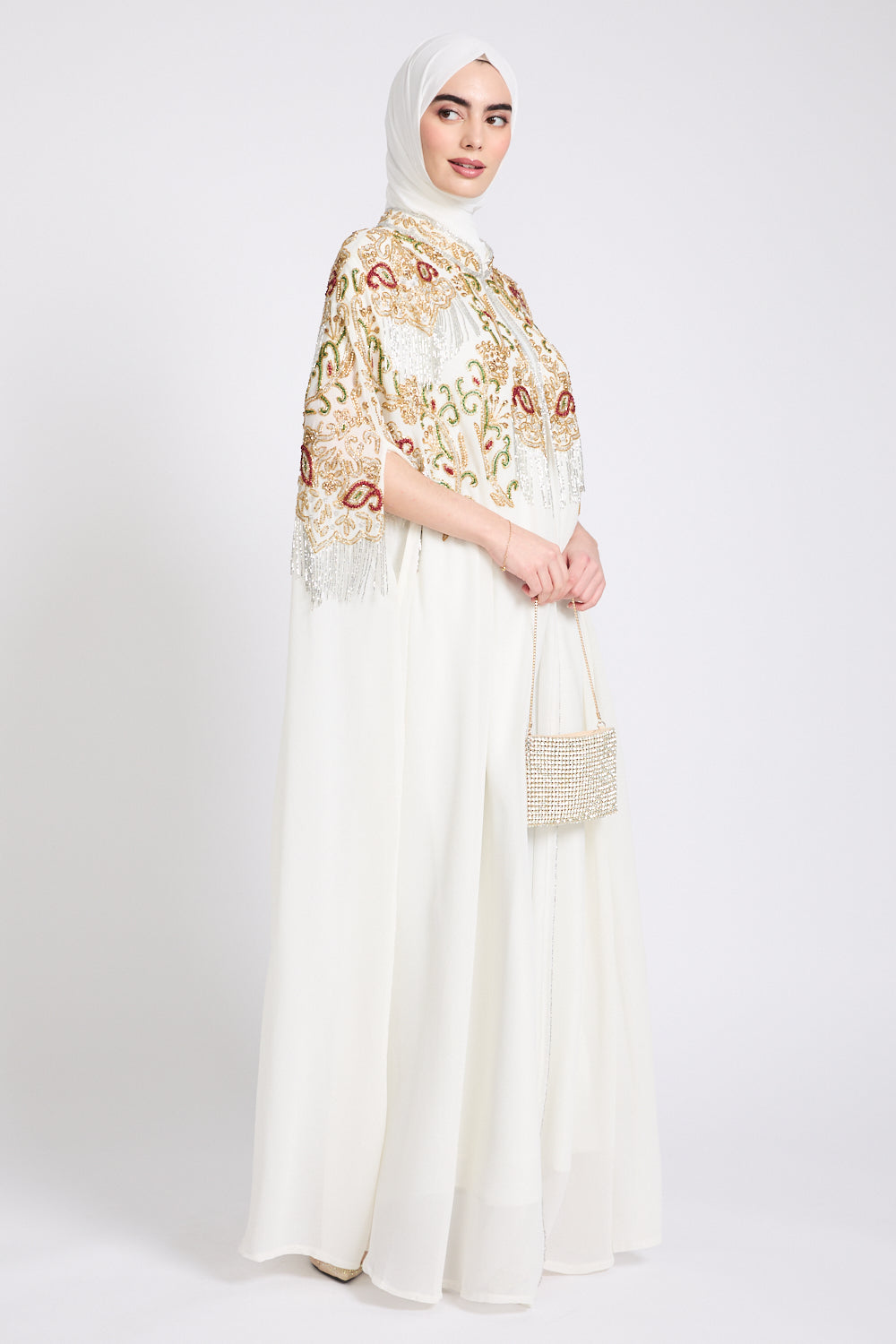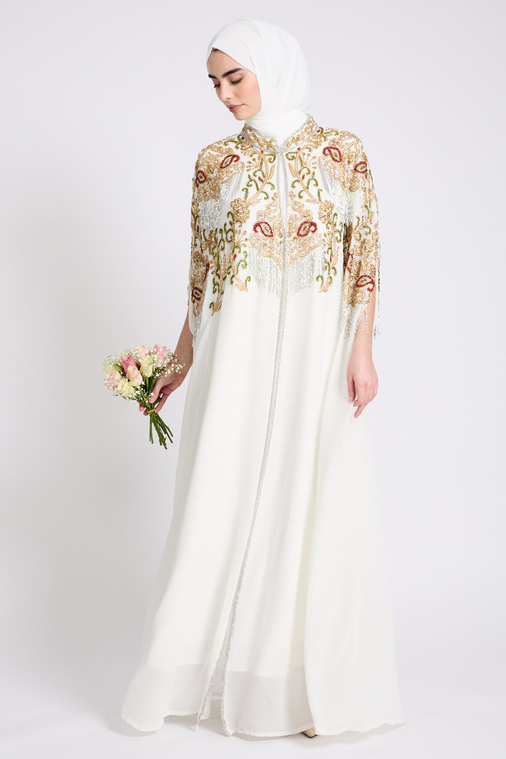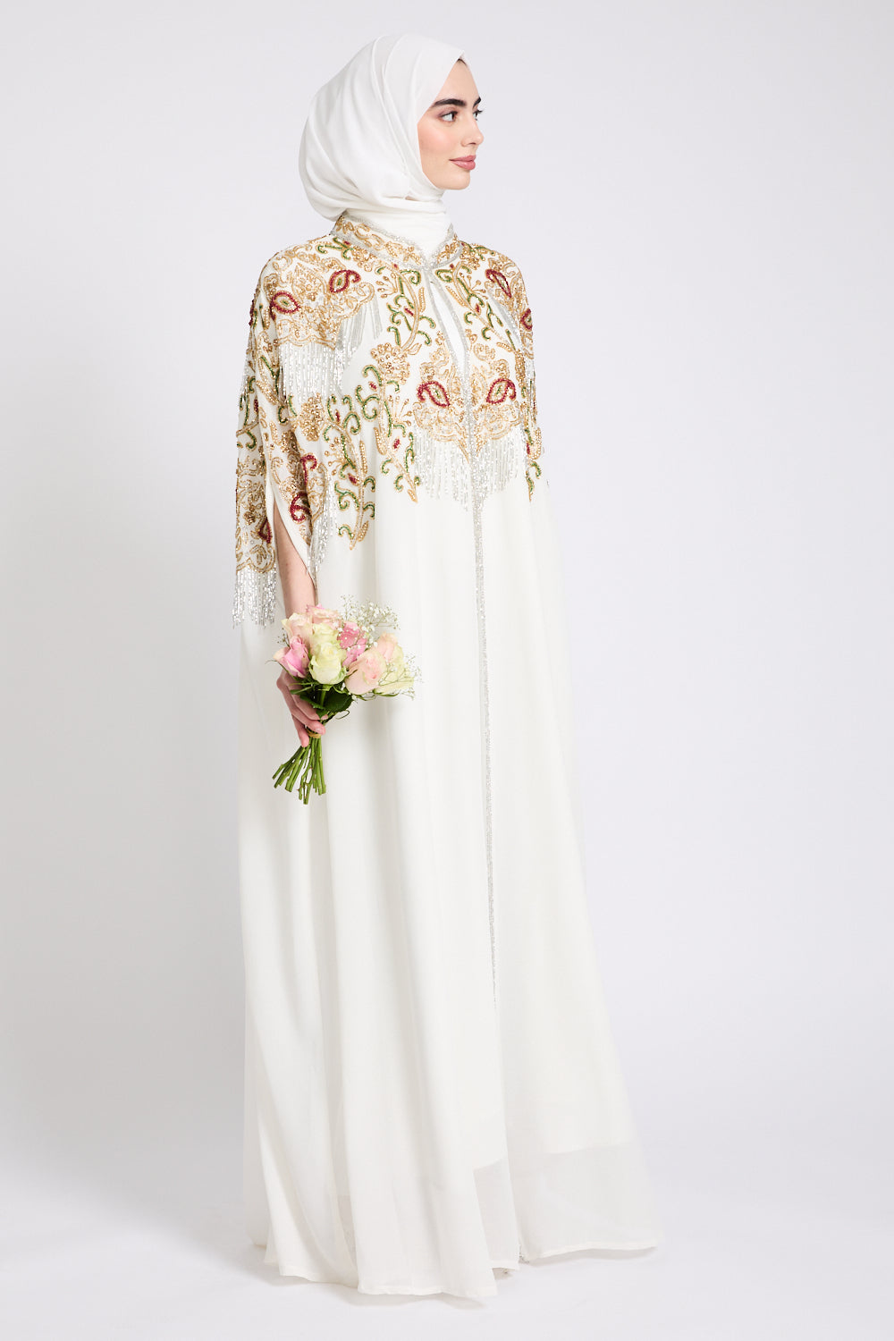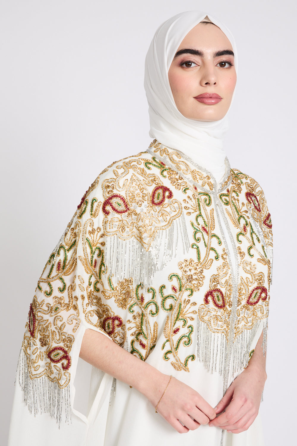 The Luxury Crown Jewel Embellished Cape in Off White is a graceful, understated piece crafted for moments that call for softness, poise, and thoughtful detail.