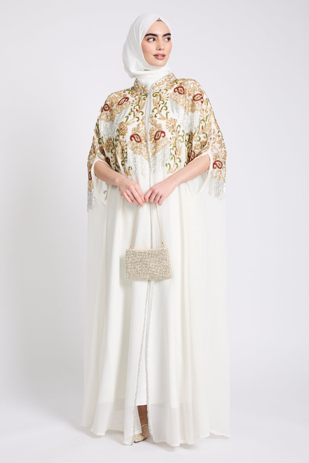 • Features: High neck collar, 2 x clasps to close top half of cape, intricate hand stitched embellishments on the front and back of the abaya