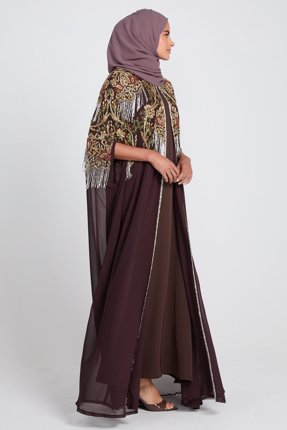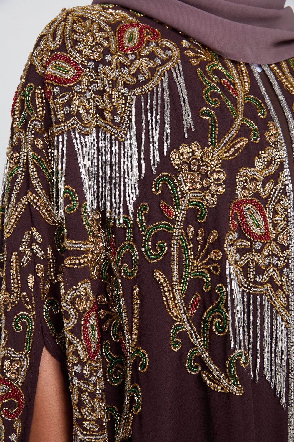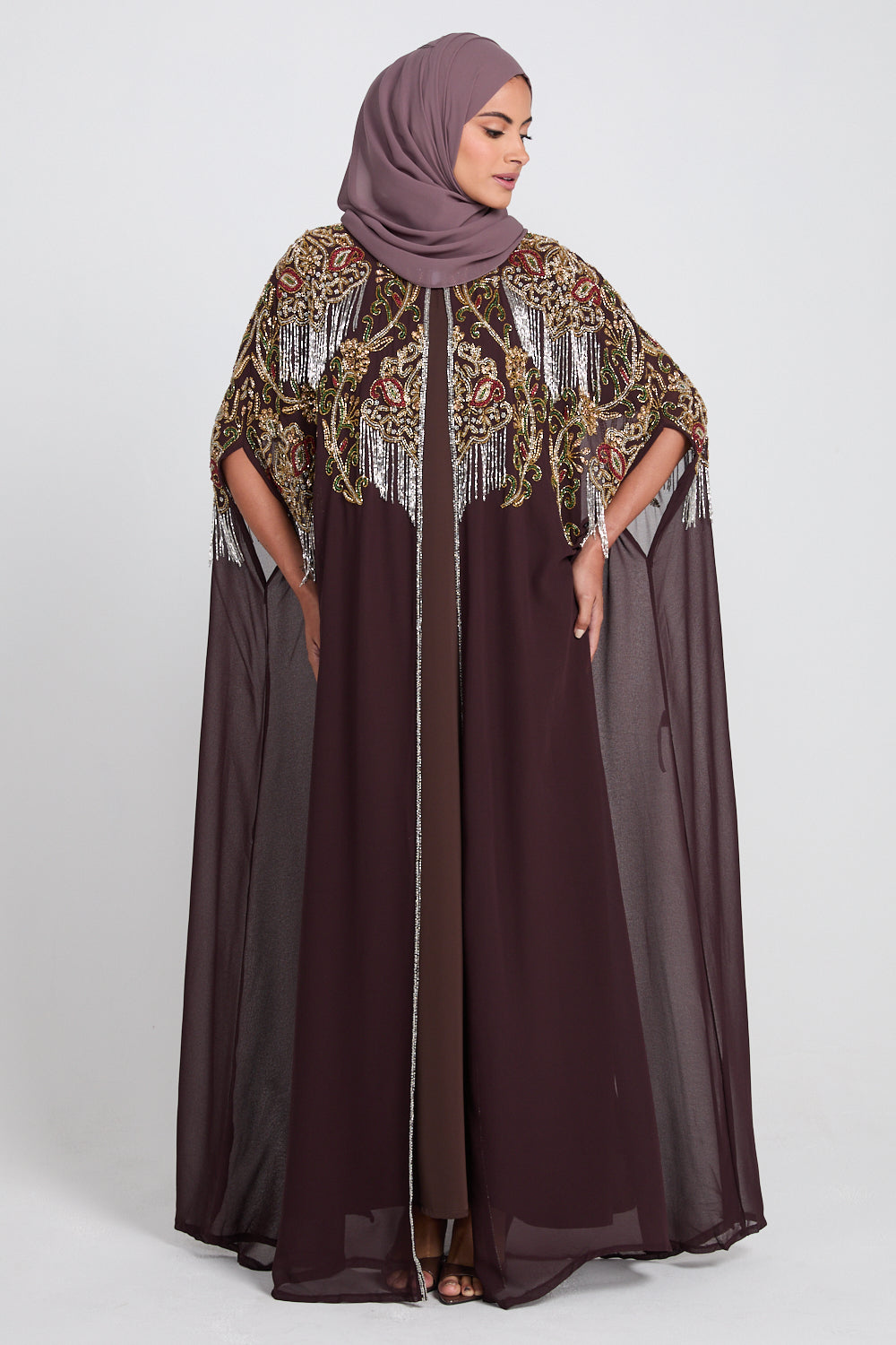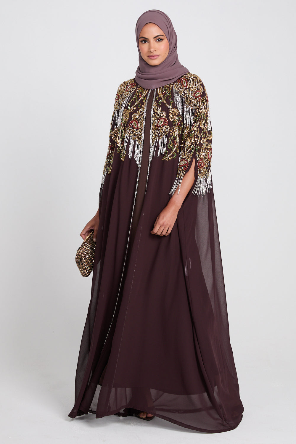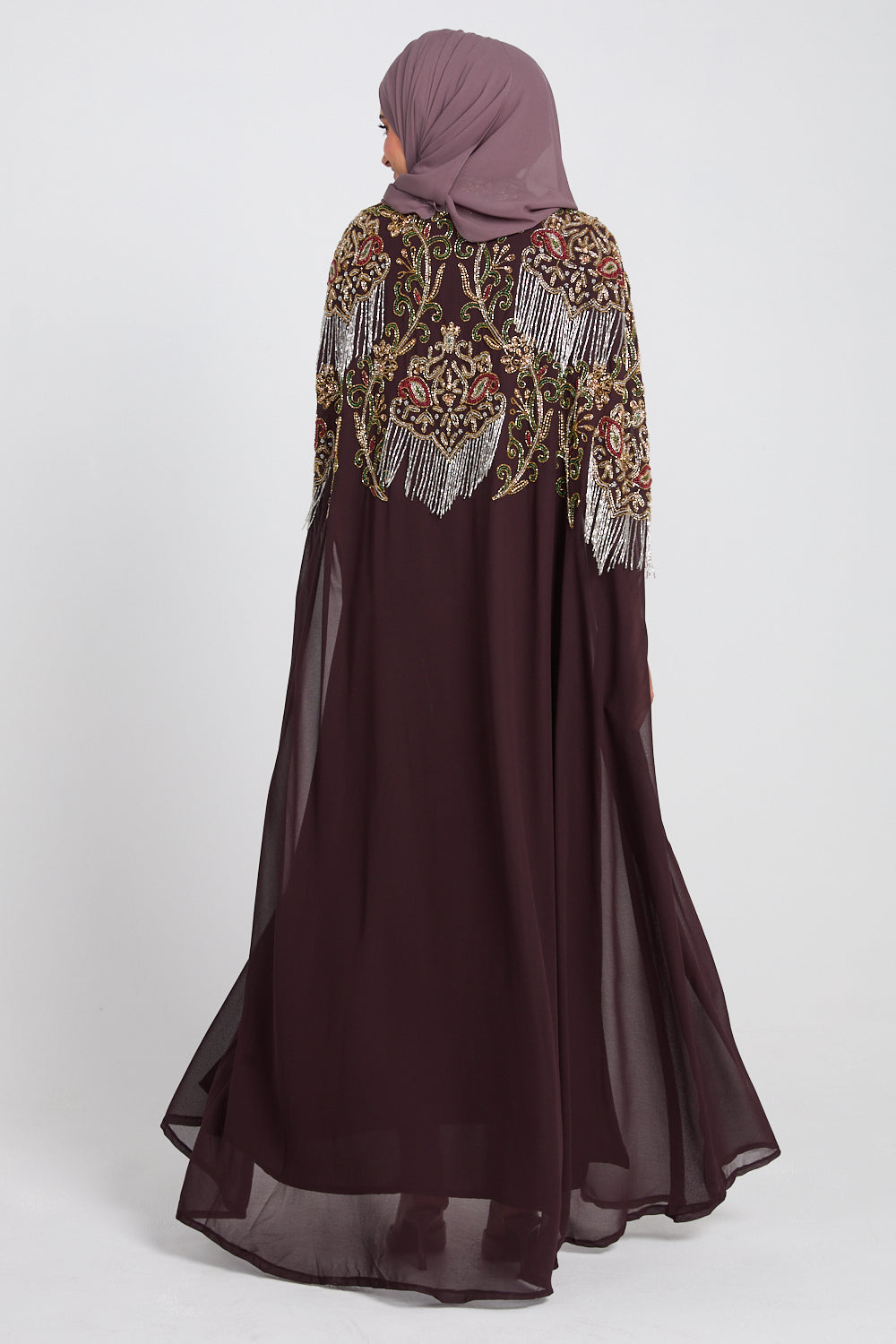 • Features: High neck collar, 2 x clasps to close top half of cape, intricate hand stitched embellishments on the front and back of the abaya