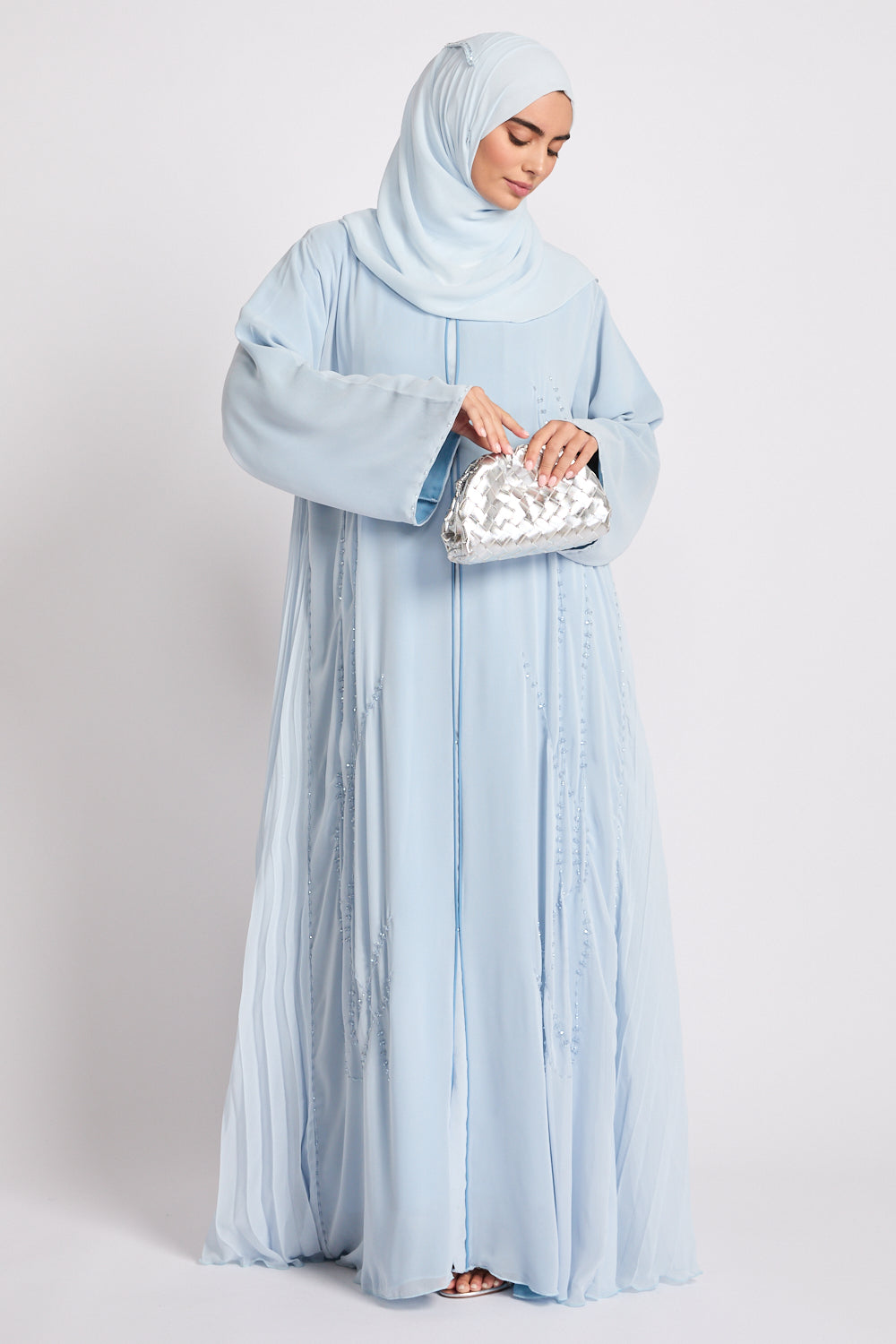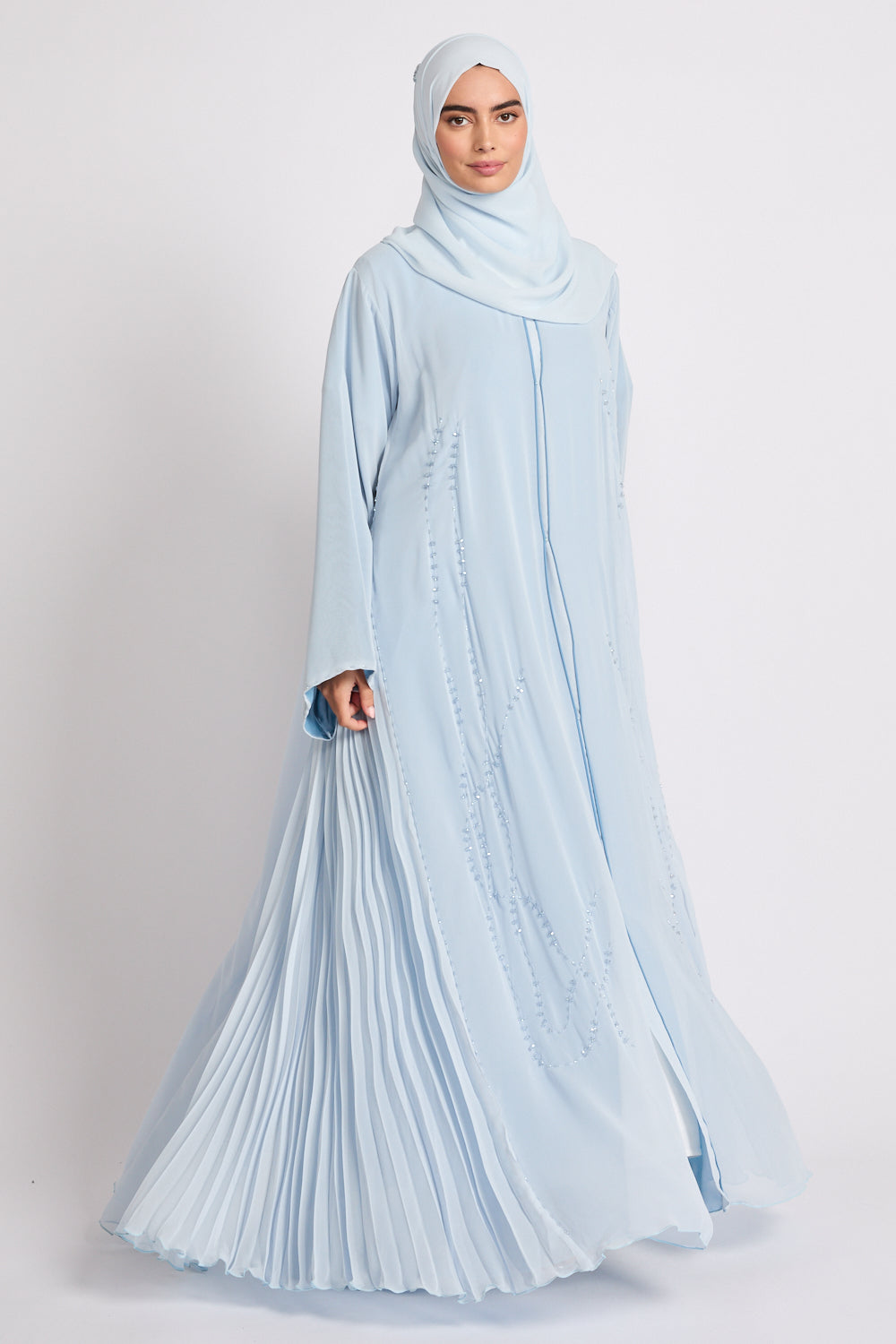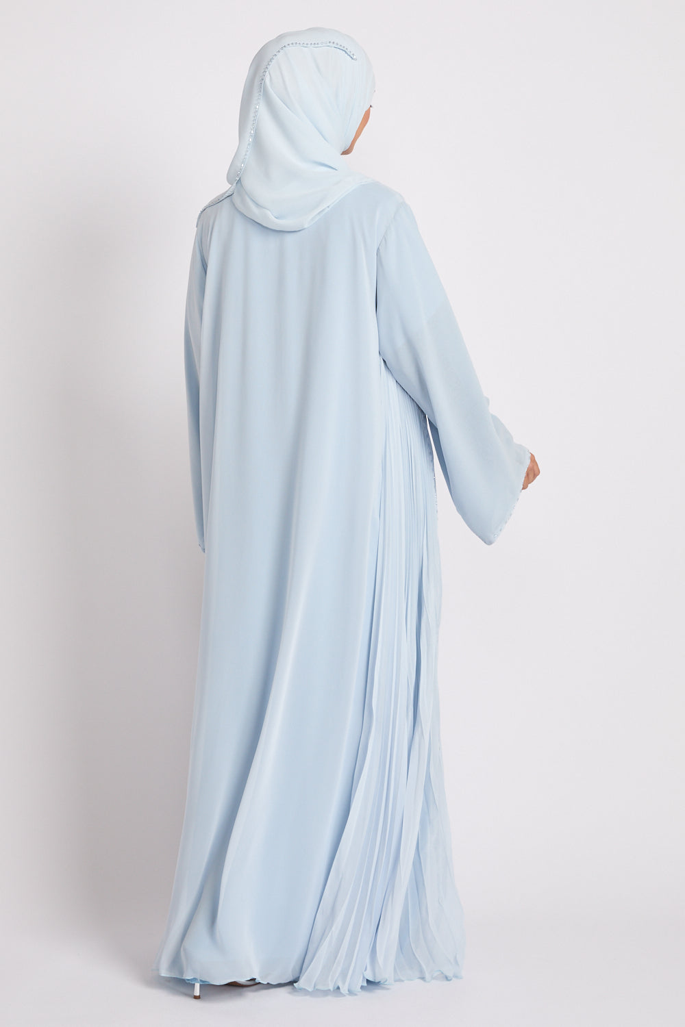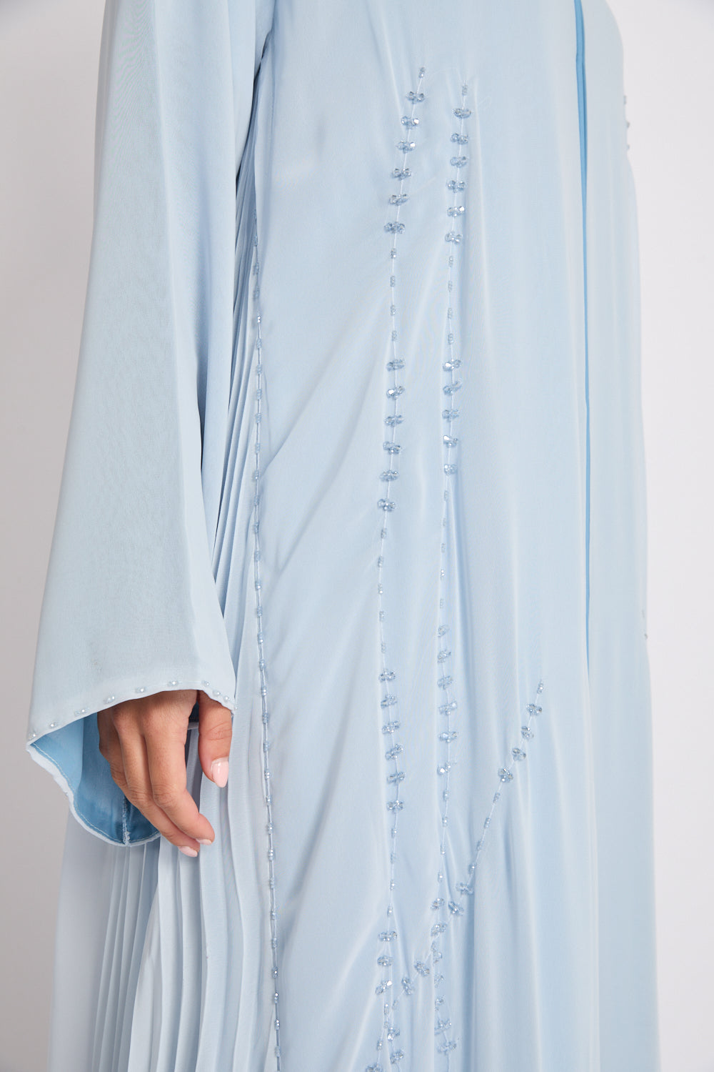 Luxury Crystal Pleated Open Abaya – Ice Blue