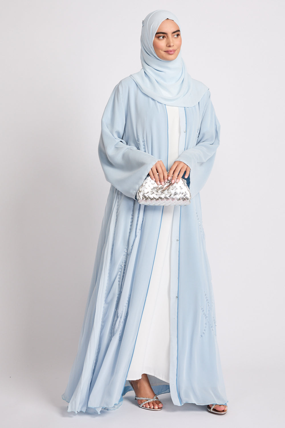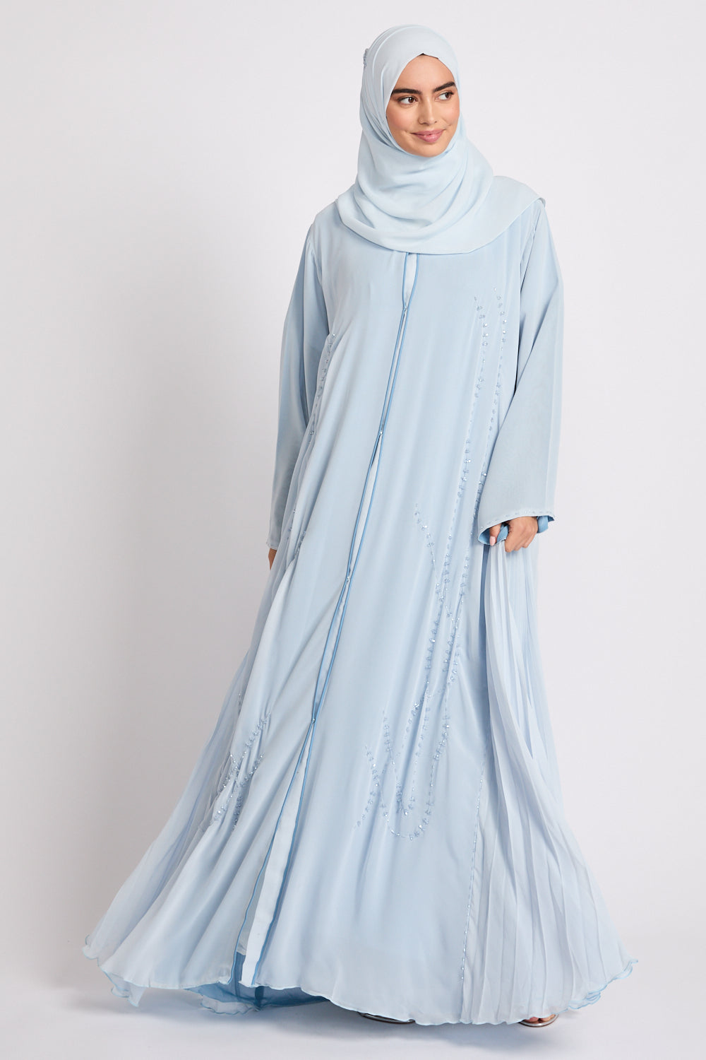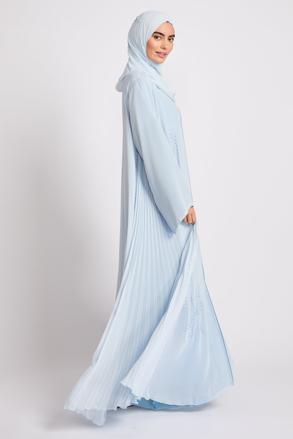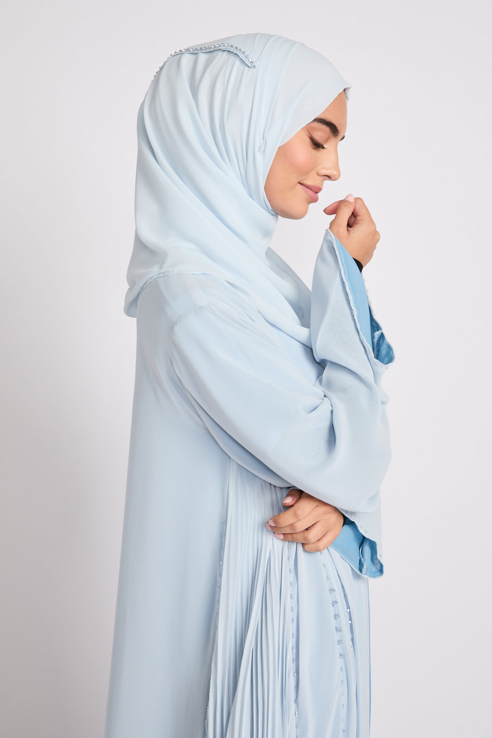 Luxury Crystal Pleated Open Abaya – Ice Blue