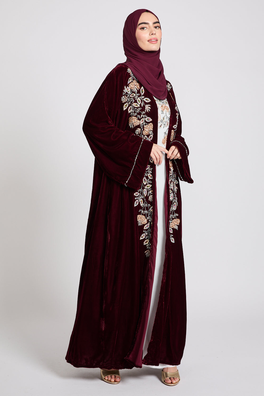 Luxury Four Piece Velvet Embellished Open Abaya Set - Burgundy Rose