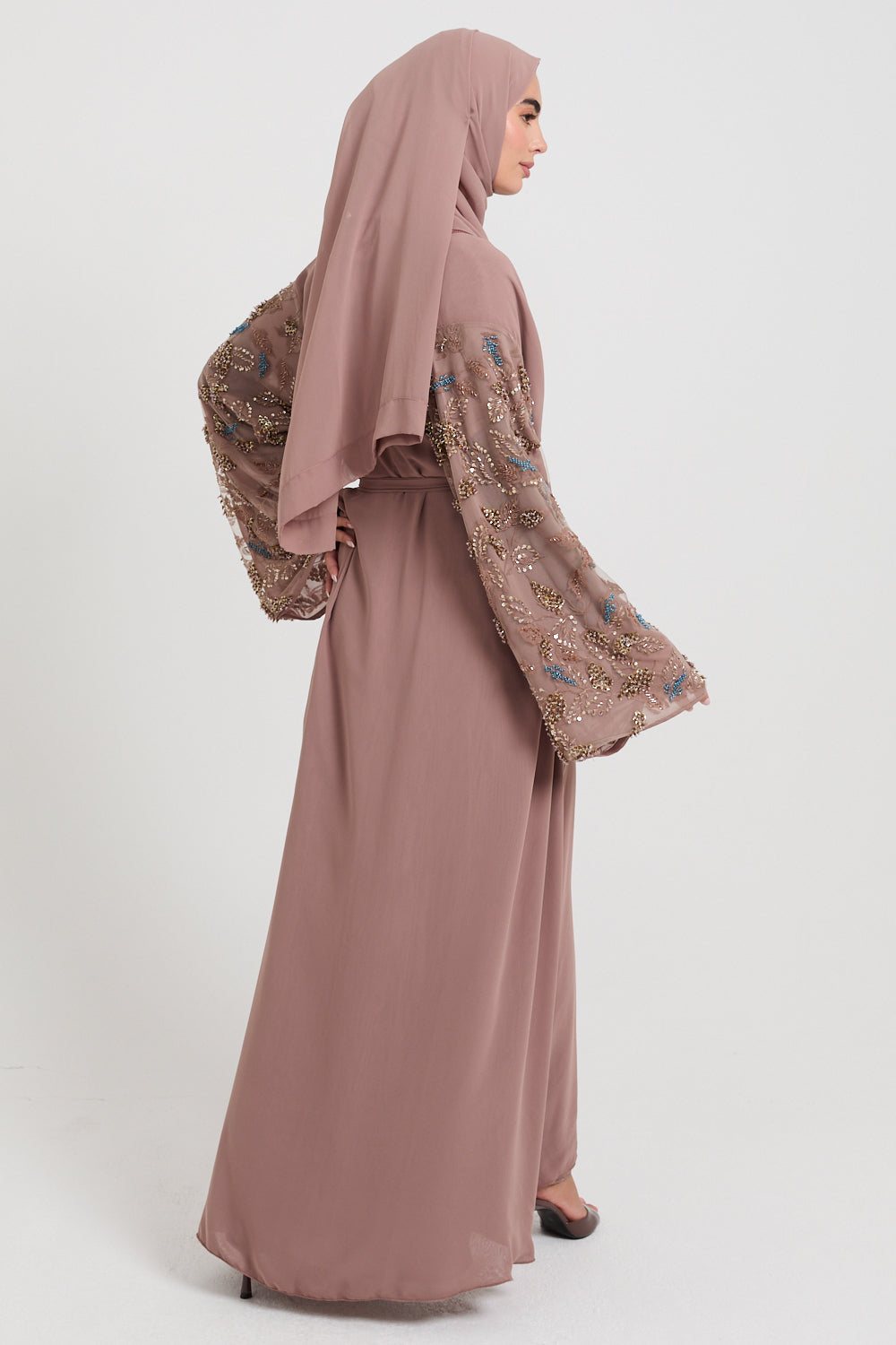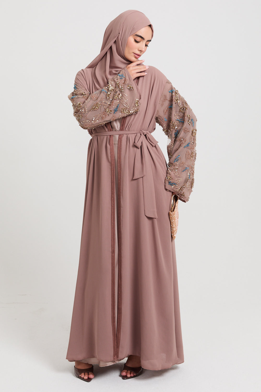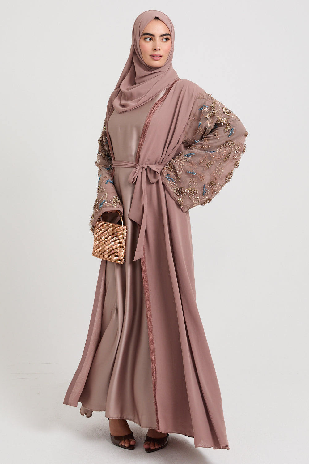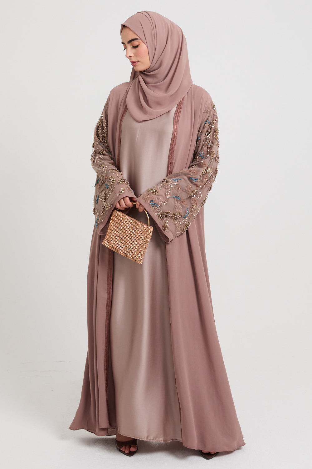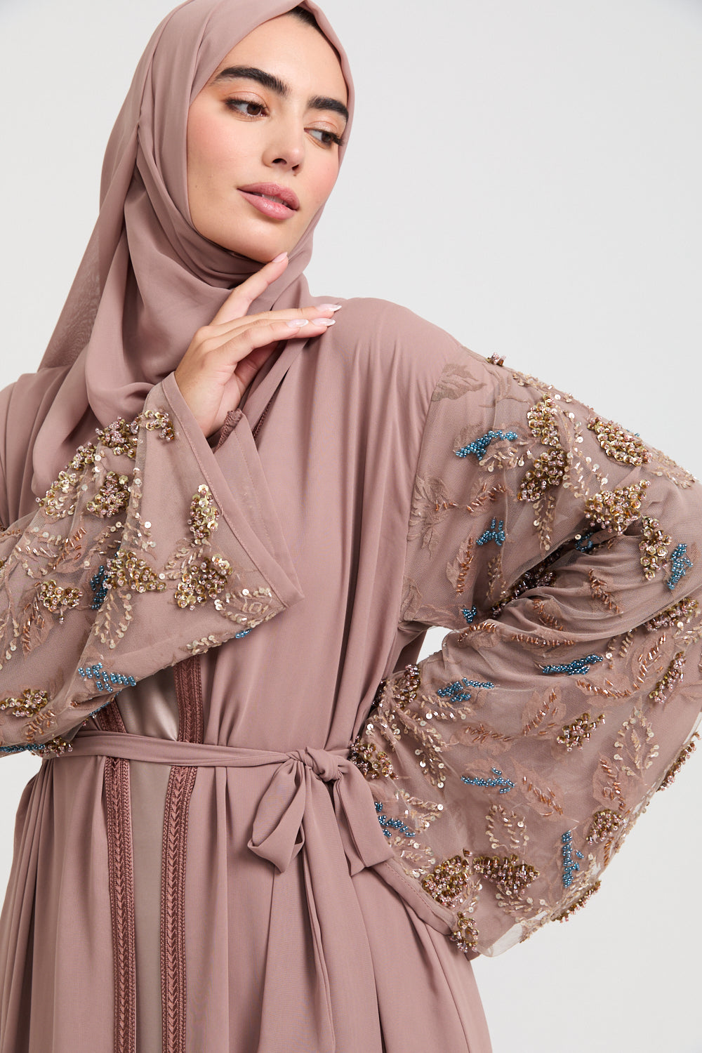 The Luxury Rosette Embellished Sleeve Open Abaya captures timeless sophistication through its graceful design and artisanal craftsmanship. Cut from premium chiffon fabric, it drapes fluidly with a soft, lightweight touch, offering effortless elegance for any occasion.