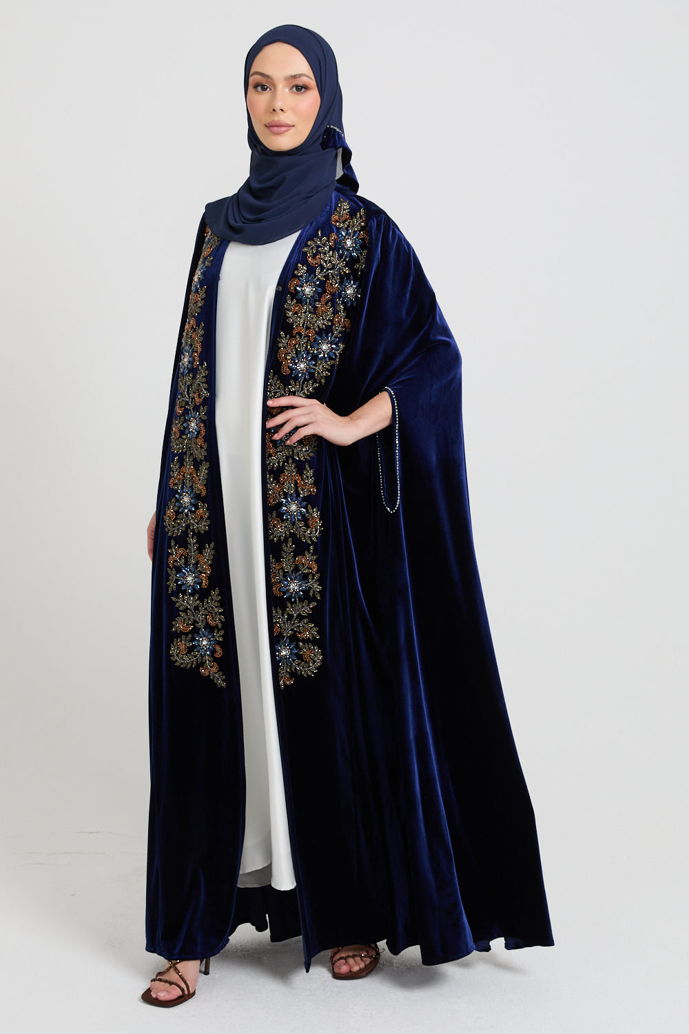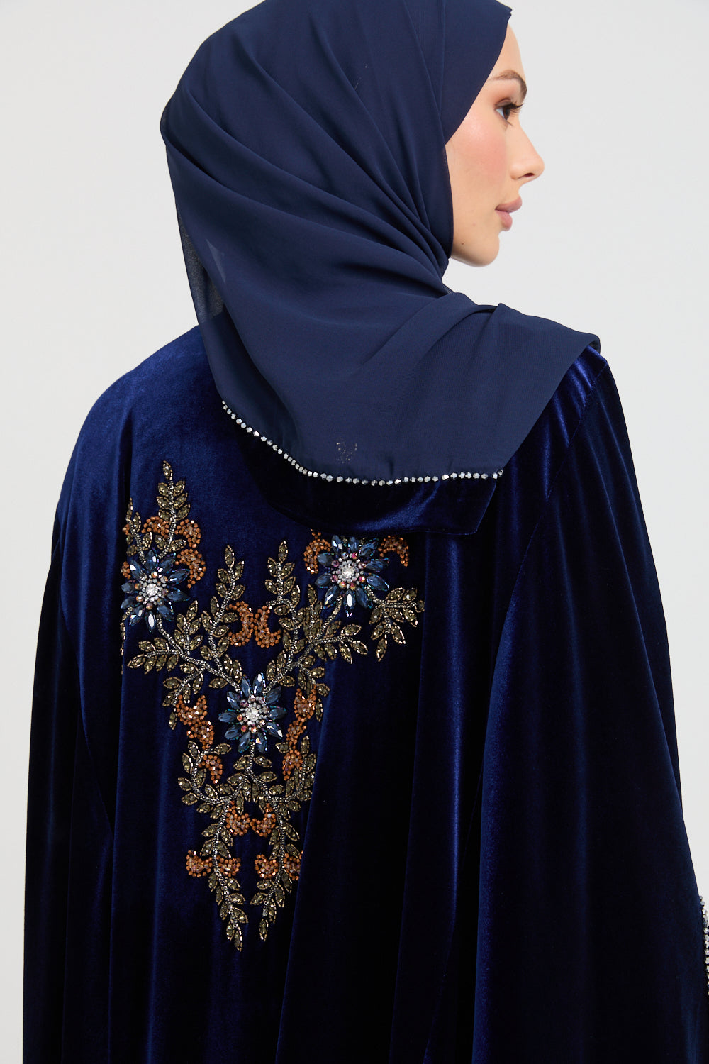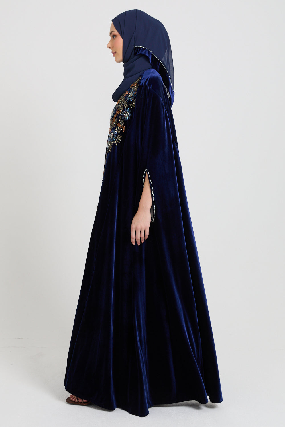 The Luxury Sapphire Bloom Velvet Embellished Cape is designed to make an unforgettable statement. Crafted from rich sapphire-toned velvet, it drapes effortlessly with a fluid, elegant silhouette that moves with grace.