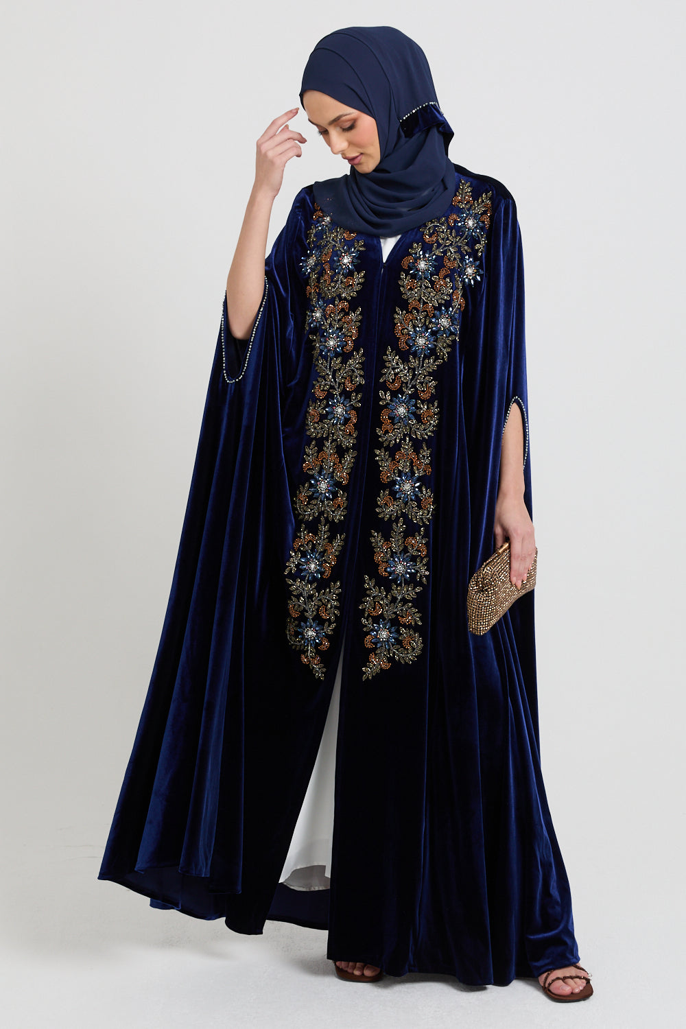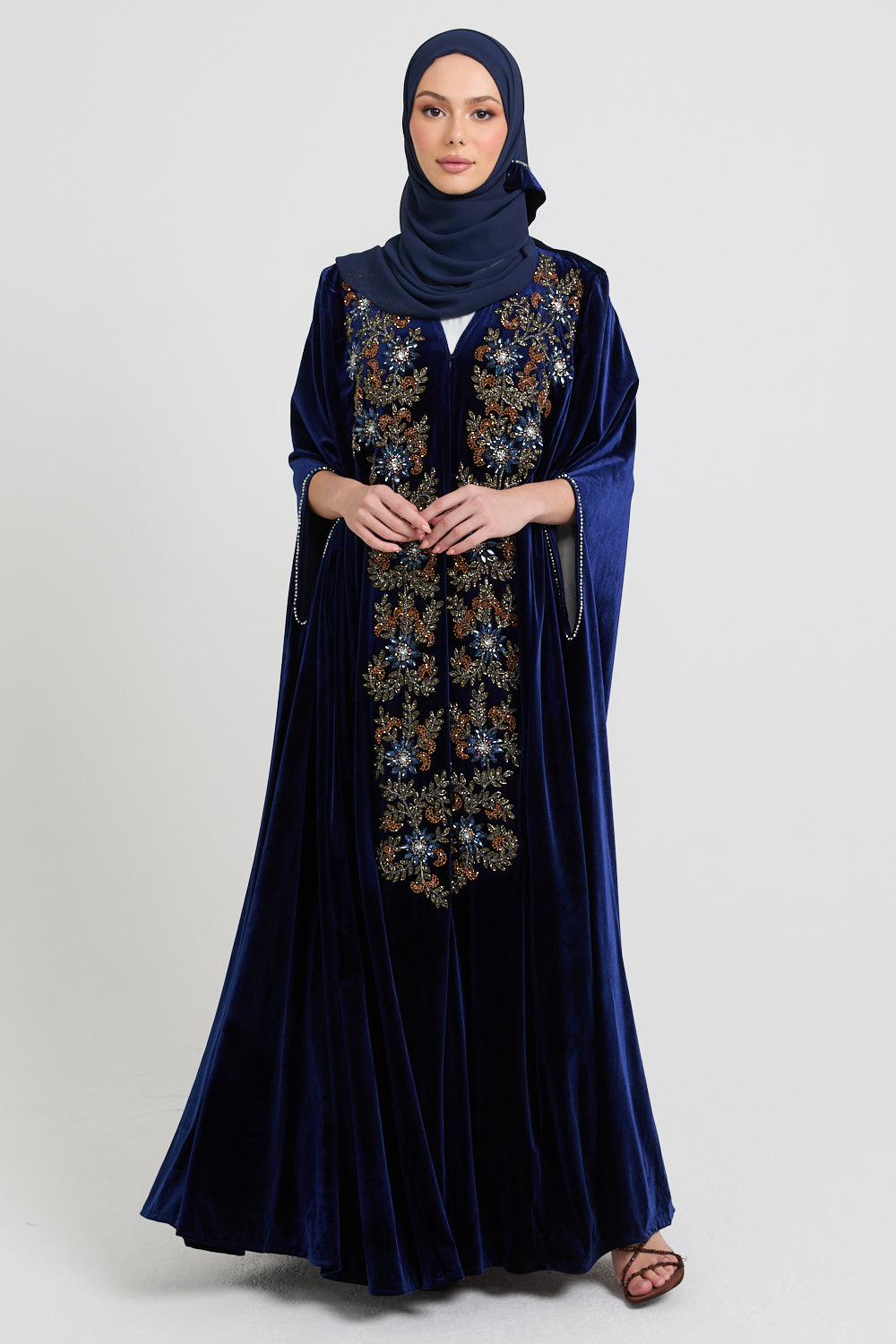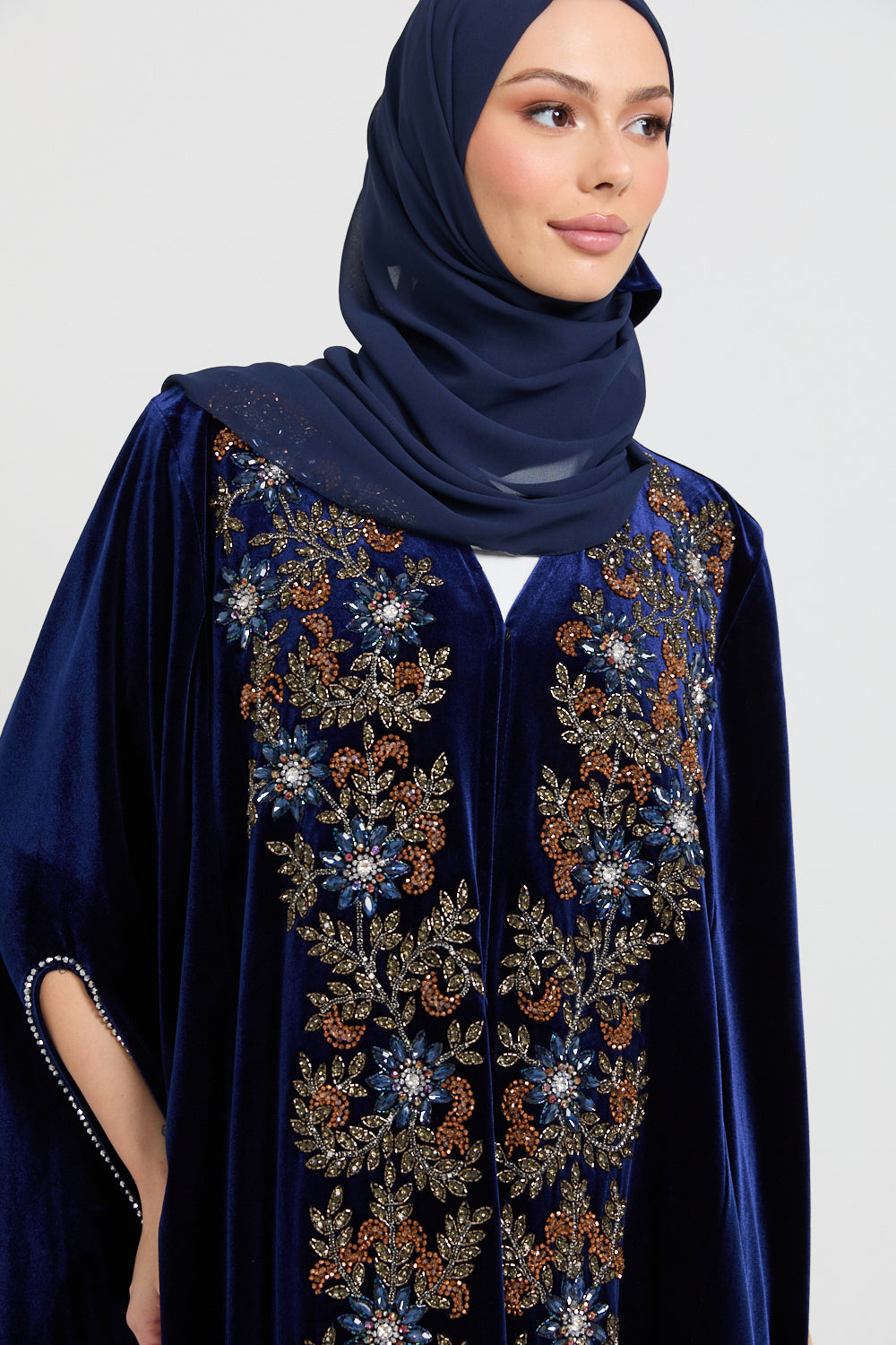 The Luxury Sapphire Bloom Velvet Embellished Cape is designed to make an unforgettable statement. Crafted from rich sapphire-toned velvet, it drapes effortlessly with a fluid, elegant silhouette that moves with grace.