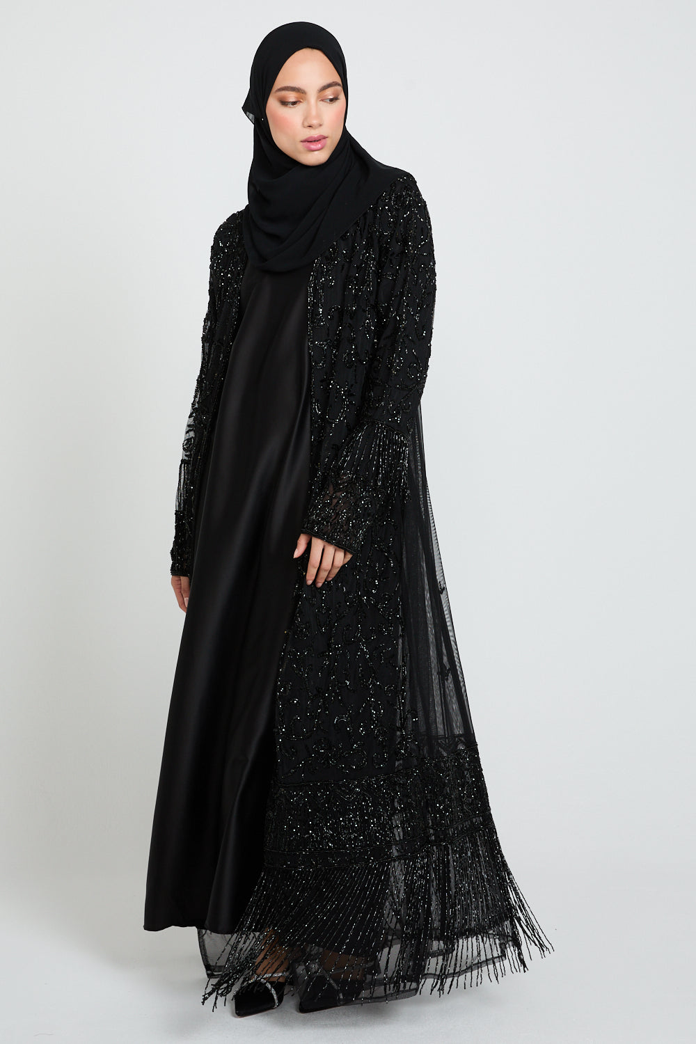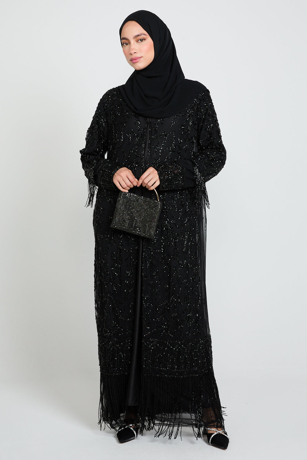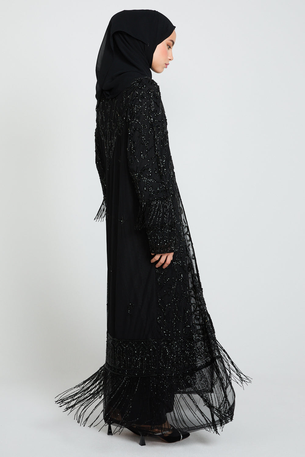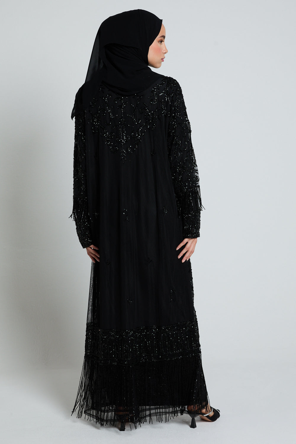 The Luxury Tassel Embellished Open Abaya is an ode to refined opulence. Crafted from black tulle, this statement piece is adorned with intricate silver embellishments that shimmer subtly with every movement. The design is elevated further with luxe embellished tassel detailing along the hem and cuffs, adding texture, movement, and a regal finishing touch.
