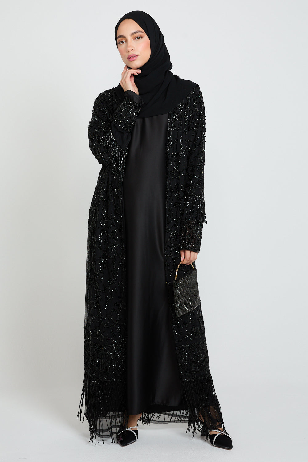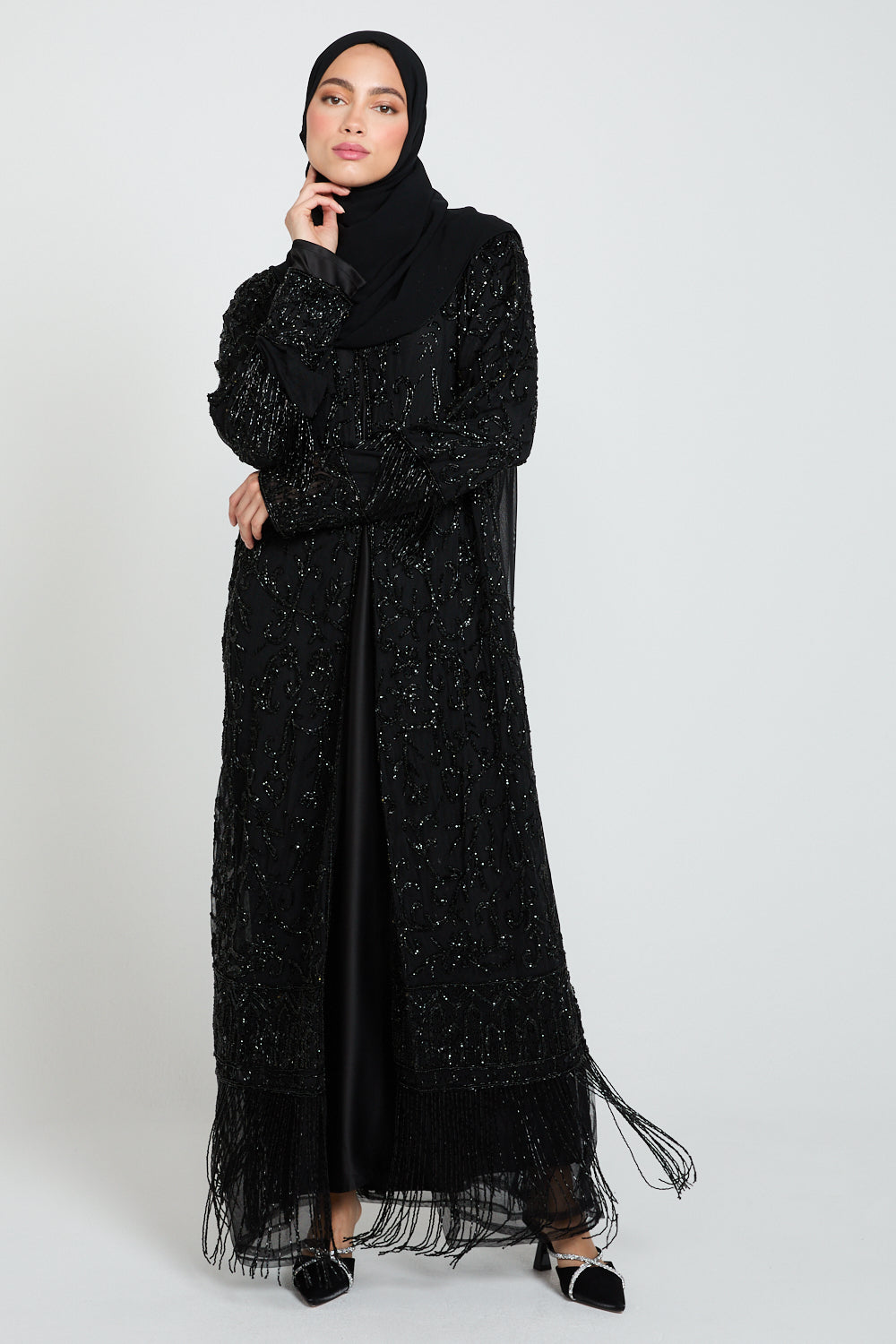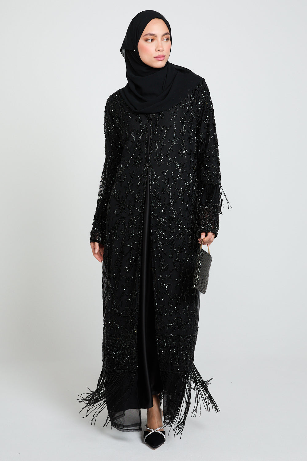 The Luxury Tassel Embellished Open Abaya is an ode to refined opulence. Crafted from black tulle, this statement piece is adorned with intricate silver embellishments that shimmer subtly with every movement. The design is elevated further with luxe embellished tassel detailing along the hem and cuffs, adding texture, movement, and a regal finishing touch.