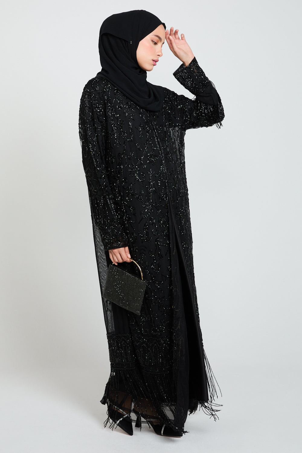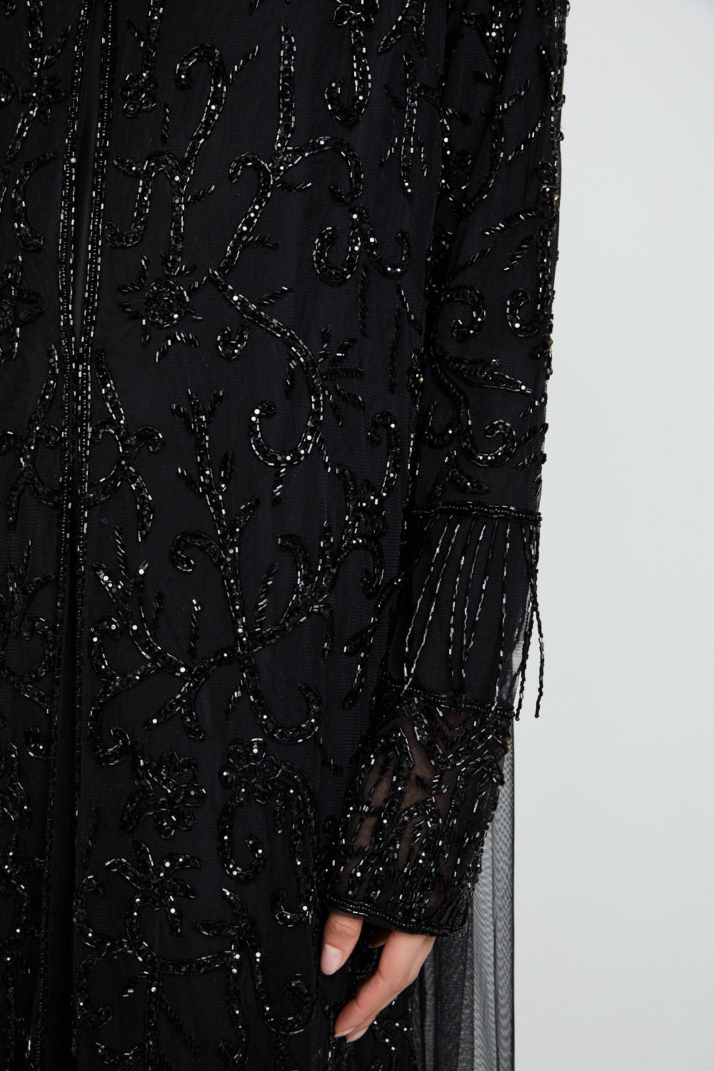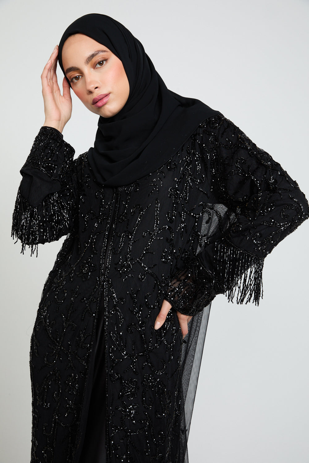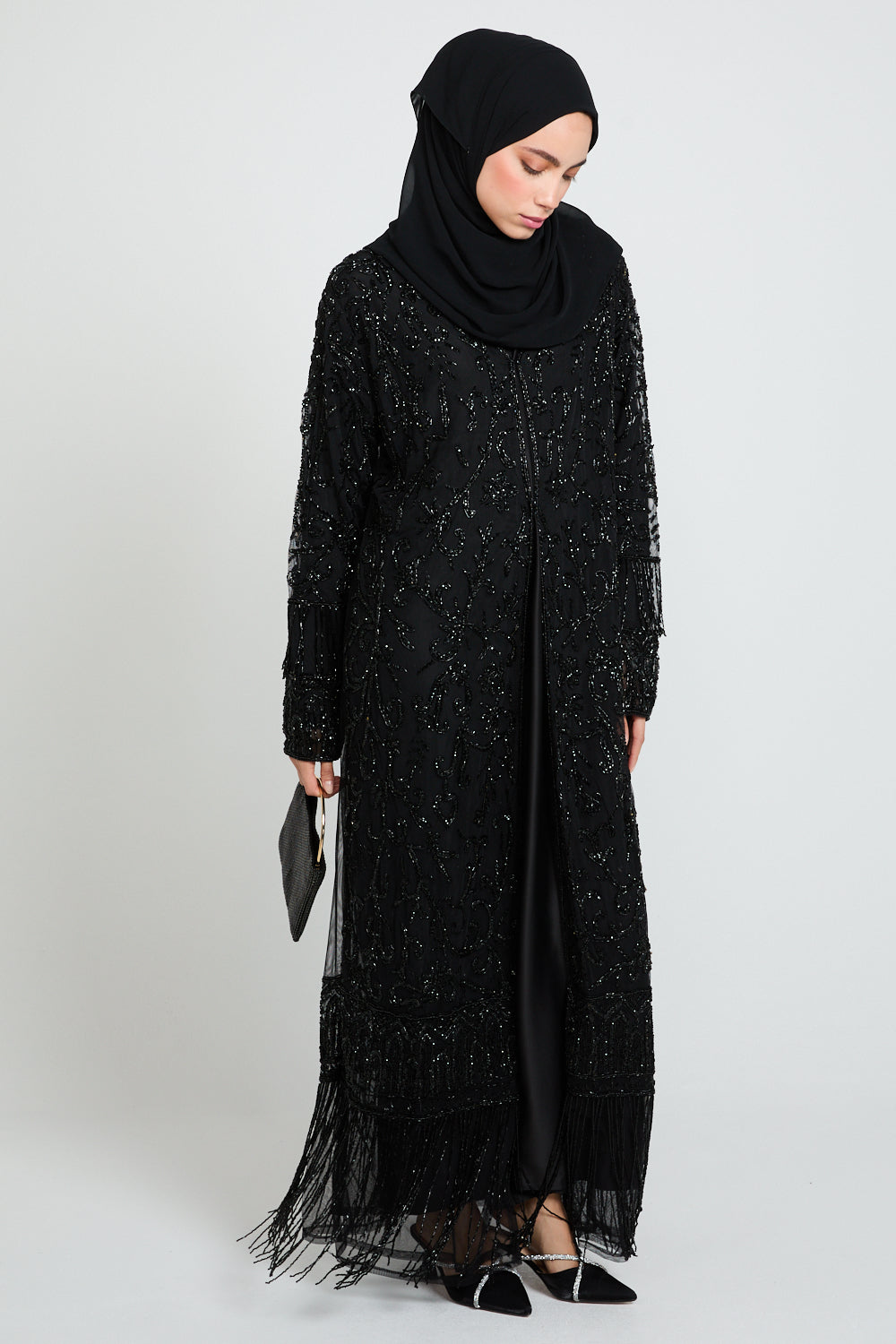 The Luxury Tassel Embellished Open Abaya is an ode to refined opulence. Crafted from black tulle, this statement piece is adorned with intricate silver embellishments that shimmer subtly with every movement. The design is elevated further with luxe embellished tassel detailing along the hem and cuffs, adding texture, movement, and a regal finishing touch.