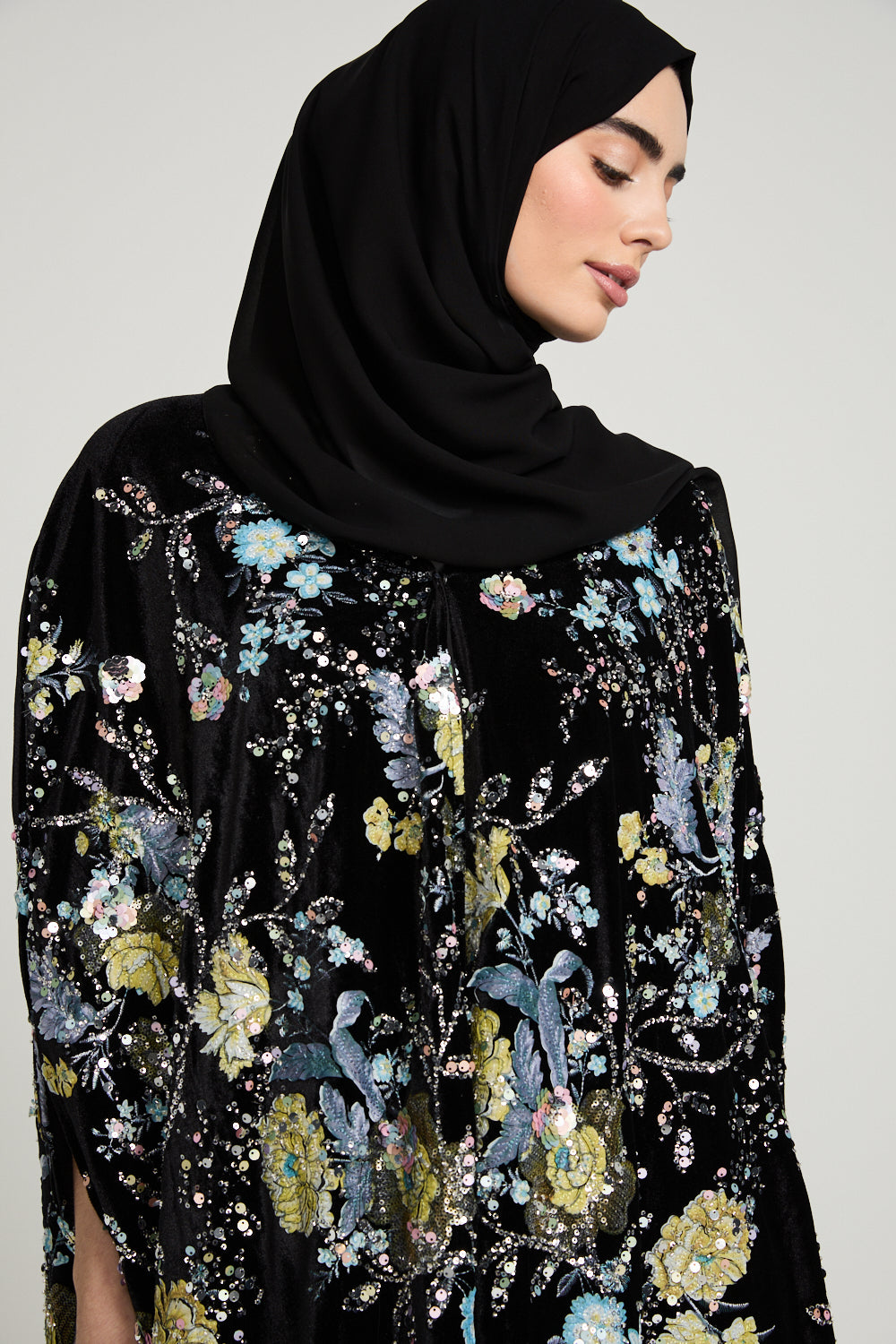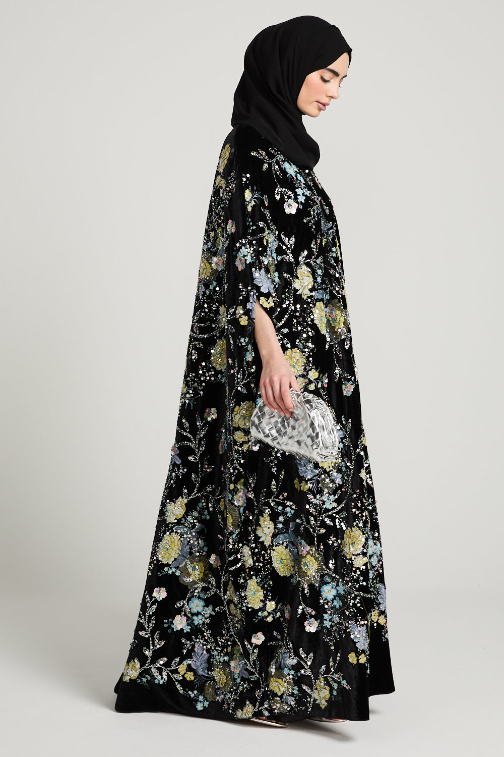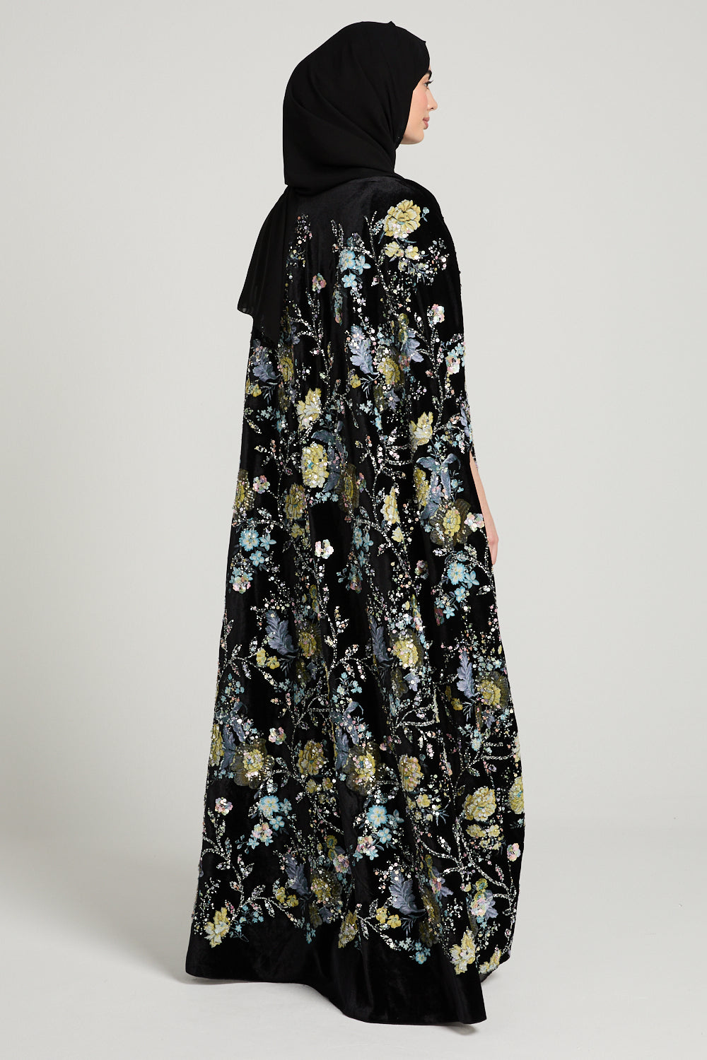 The rich velvet fabric drapes effortlessly, creating a graceful and fluid silhouette that moves with you. The vibrant floral accents bring a timeless, artistic charm that makes this cape the perfect statement piece for special occasions or evening events.